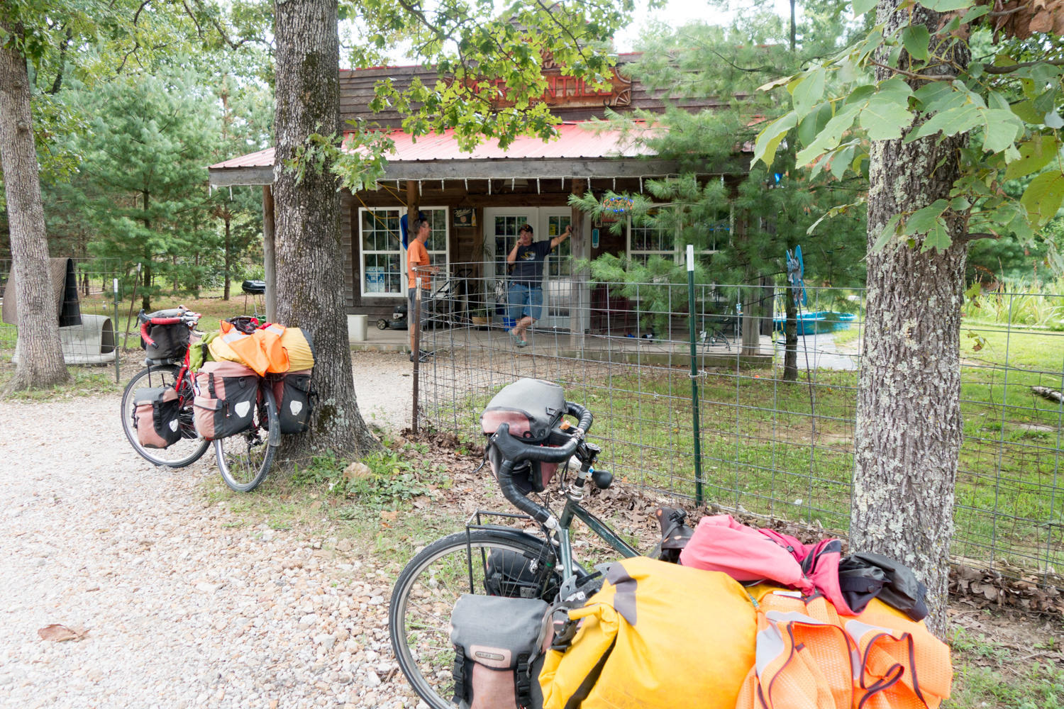 We have two more dips then arrive at Meramec State Park. Happy that we are at the end of today's road, the ranger at the visitor center gives us directions to the campground, another 3 miles and over a "big hill" she says twice emphasizing the hill. As we reach the big hill, also very steep, the rain begins, then lightens up. There is a restaurant at the top and Patrick rides in to get us some cold cokes for the campground. We find a site, drink our cokes and eat potato chips, while looking at dark clouds.