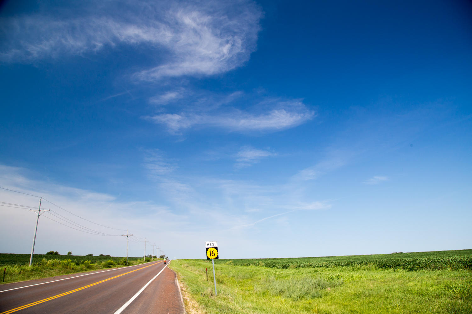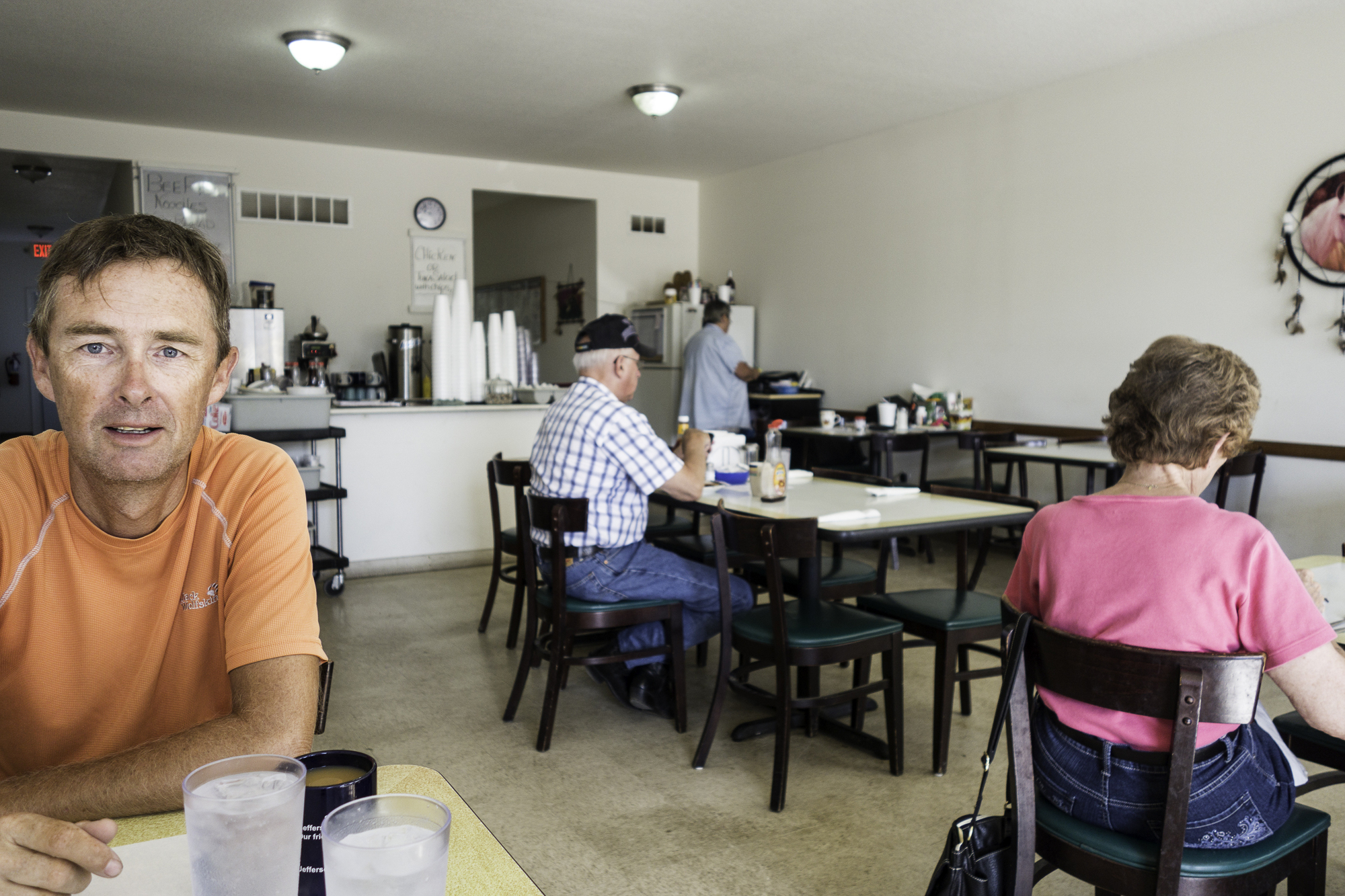 About 30 kilometers into our ride we reach Oskaloosa, a nice little town with some beautiful old brick buildings, a watertower and a town square with a courthouse. Off the square is “Rose’s café” where we have a nice second breakfast. At the door we meet Barbara a retired teacher, and inside is Gloria our waitress. We have a nice conversation with a retired Army Ranger who was stationed in Belgium and likes his Belgium beers.