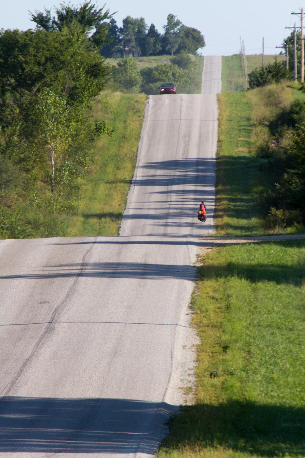 Eastern Kansas is not flat, but the hills are not nearly as steep as what we found in Missouri. The day is just beautiful; a high of about 85 F, sunshine, low humidity and even a tailwind blowing from the southeast. Around us are rolling hills with pasture, some forests and lots of soy beans and corn. Barns, silos and farmhouses are everywhere.