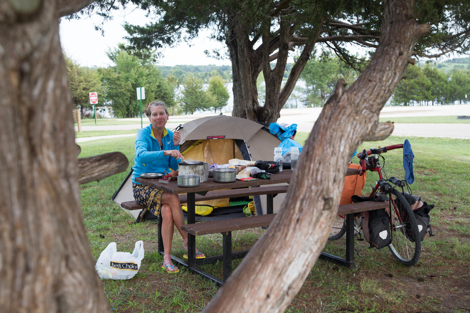 Another 35 kilometers to Holton. Just as we crested one more hill a grey haired woman on an off-road motorcycle going the other way swings around, catches up, and tells us “this is the last hill before Holton; it flattens out after here”. She is partially right: it does flatten out for the next 10 kilometers or so, but the last 5k’s into town are tough again. We pass through the nice looking old downtown, head for the Walmart to get groceries, and continue another 3 kilometers west of town down route K16 to Banner Creek Reservoir. There is a very nice communal campground at this lake. Warm showers and nice sites for only $9 a night. For the self registration fee, Patrick didn’t have the correct amount. While we are cooking dinner, the campground host comes by with the dollar change.