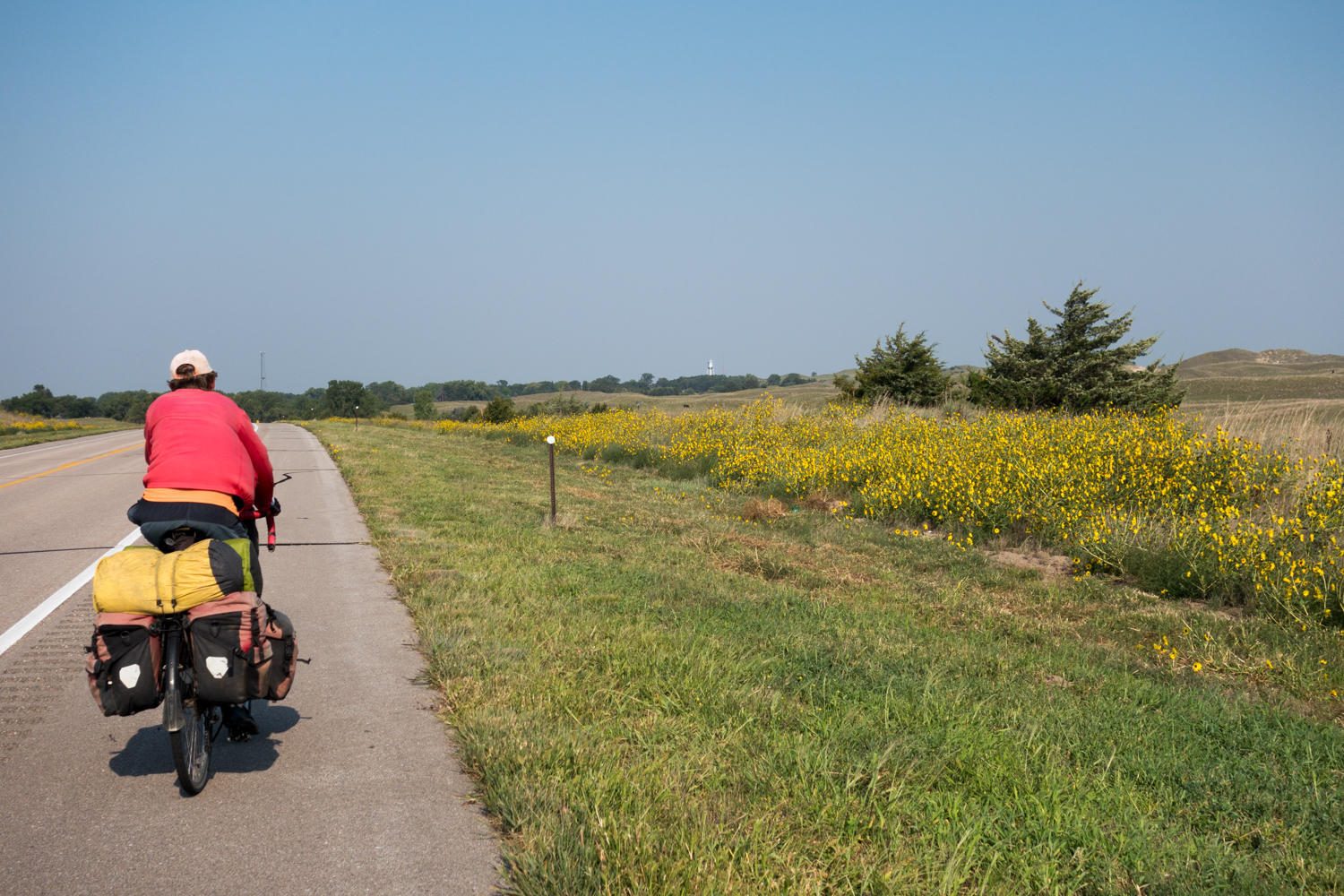 Highway 20 keeps climbing into a rolling of grass covered sand dunes. As we saw the landscape change yesterday from crops to hay fields, today the fields change from man-planted grasses to more and more native grasses. Lots of yellow flowers also, and black cows. There are windmills and old telegraph poles along the railroad bed. Farms have disappeared to signs of ranches 2-5 miles pointing down side roads. It’s a lonely open landscape.