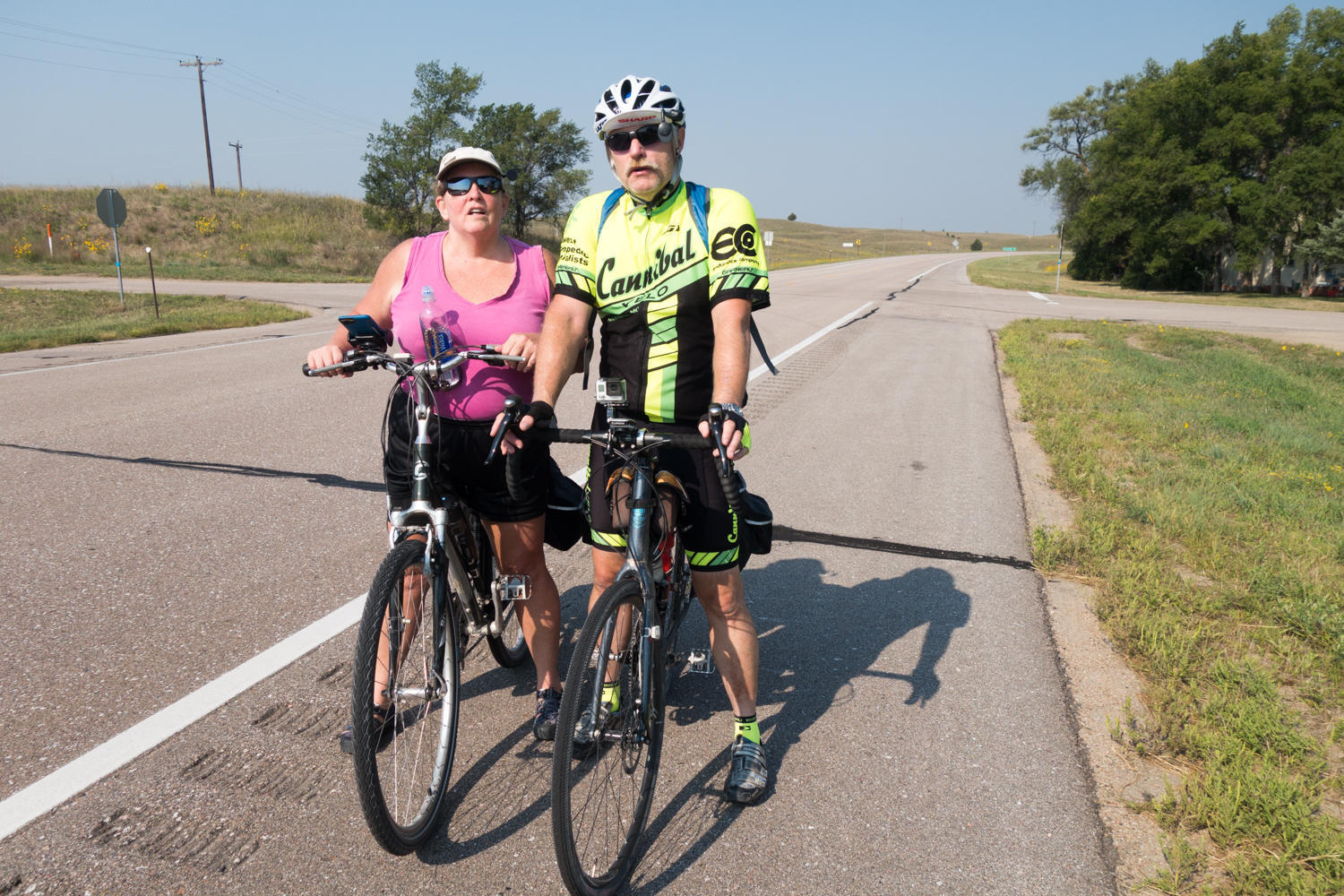 Just as we are disappointed to find the Woodlake Cafe out of business, two cyclists come riding towards us. Steve and Lisa from Missouri are riding a couple of days down the Cowboy Trail, but just like us decided to avoid the loose gravel and goatheads on the trail itself.