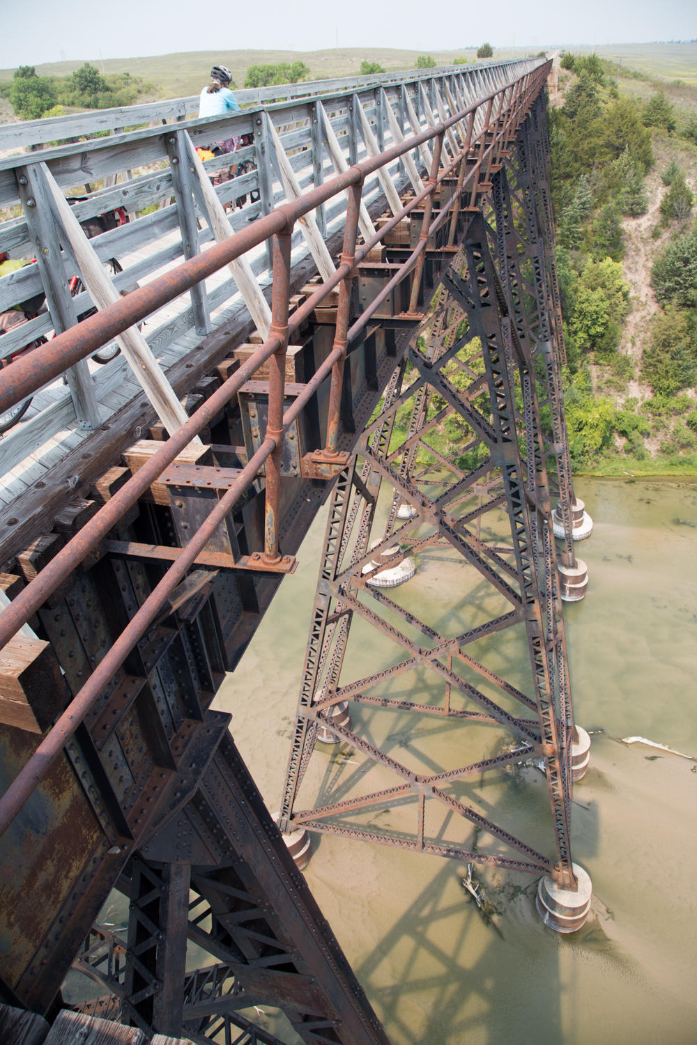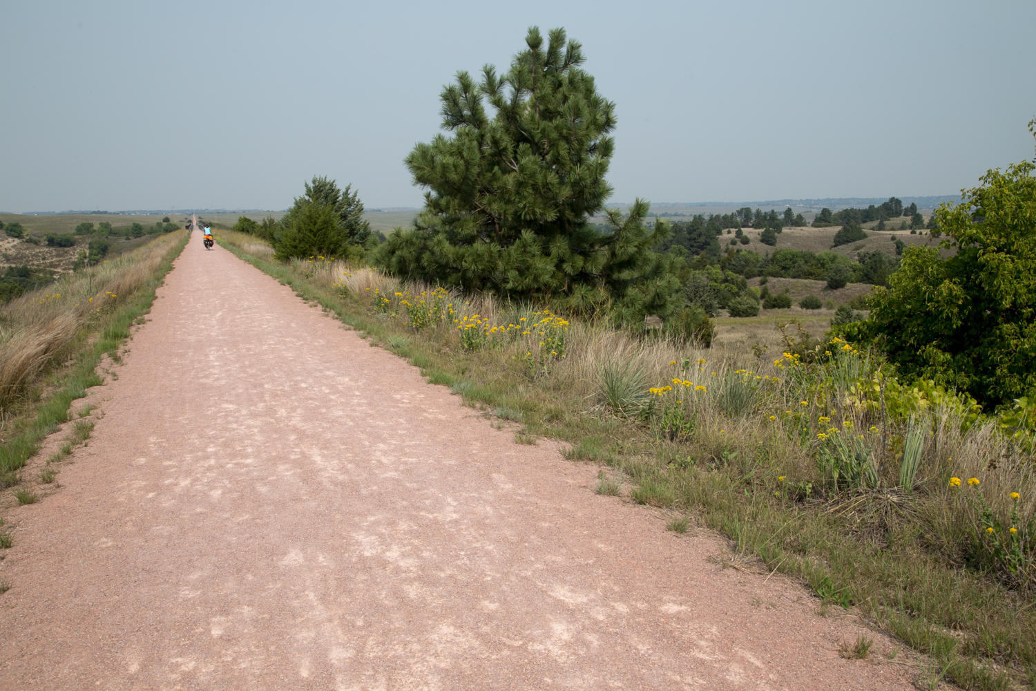 As advised by Steve and Lisa, we ride onto the trail just before the tall bridge across the Niobrara River just before Valentine. The bridge has tall steel supports and a wooden deck high above the river. We follow the trail for the next couple of miles into Valentine. By now we are hungry and thirsty; a McDonald’s restaurant helps us solve both those issues and a quick WiFi check of email. Next we shop at the IGA, and head for the city park about 2 kilometers north of town. Down a pretty steep hill we will have to climb back up tomorrow. Today is another warm day, about 35C or 95F. Patrick is not feeling so well, either too much beer last night, or an oncoming cold, and we consider getting a room. We go for the camping though, save those motel dollars for a cold and rainy afternoon in our near future. The city park is pretty nice with green grass, lots of trees, a small river and a toilet building with hot showers. All this for $5 a night. There are lots of flies though. We fix a pasta dish with a sauce package Patrick has carried since Lima Peru.