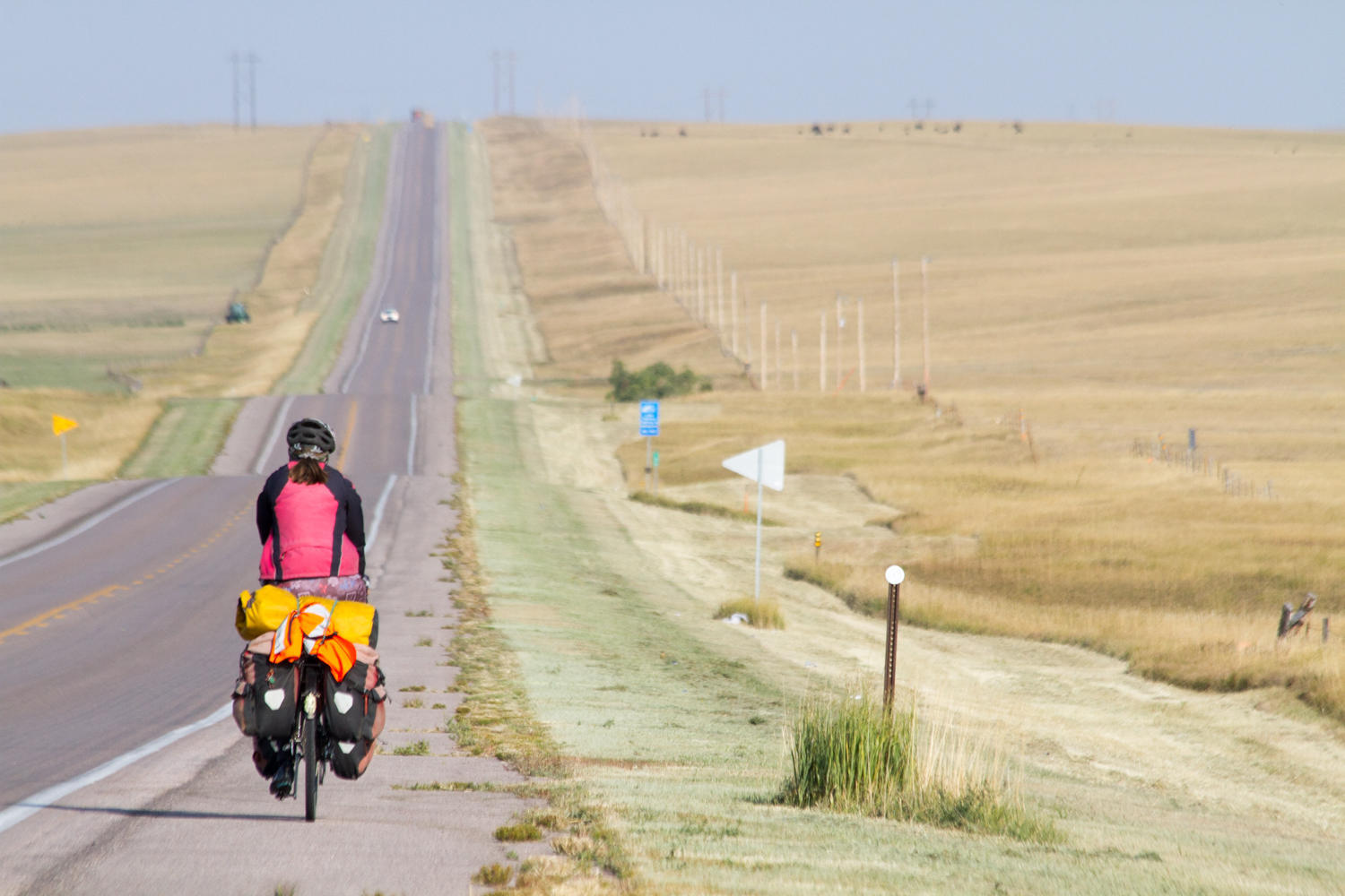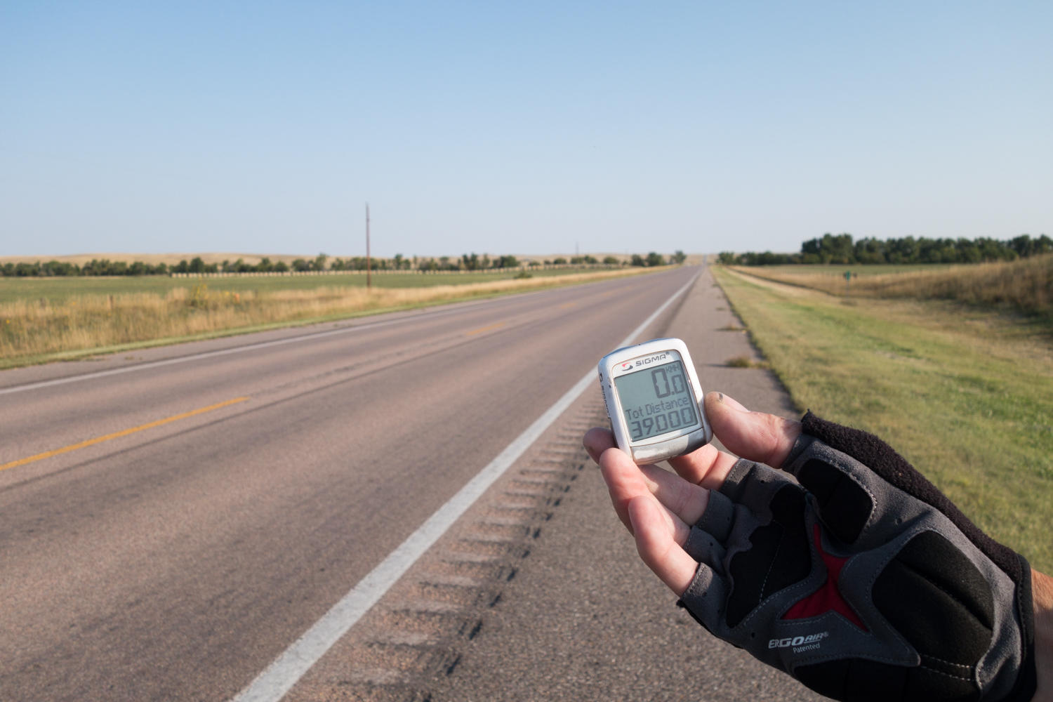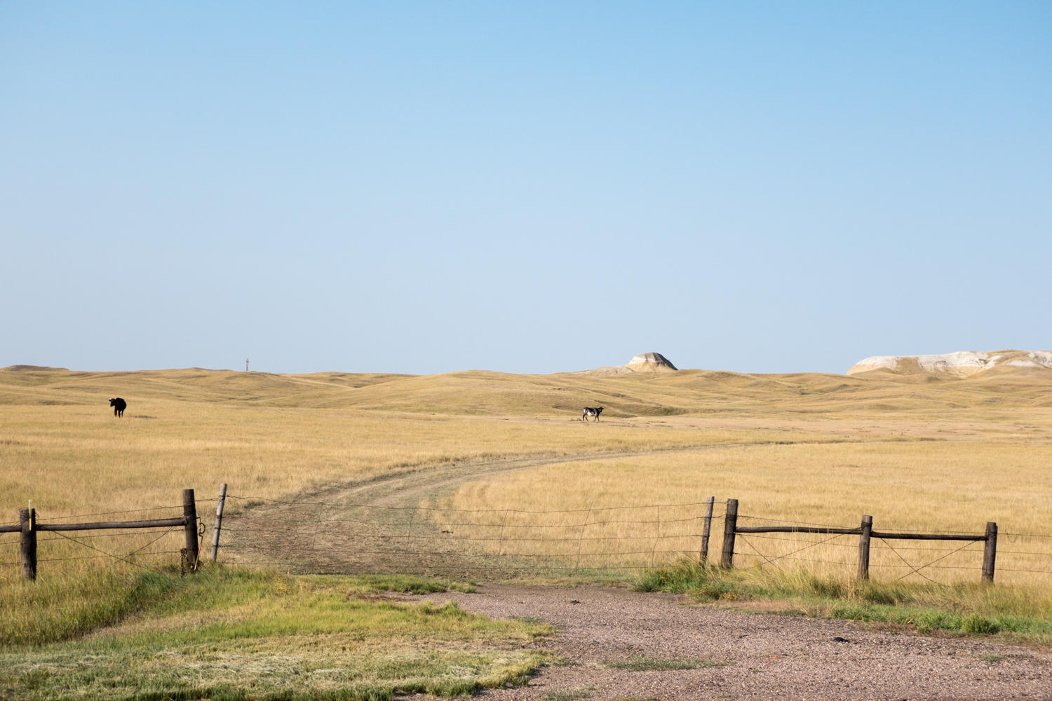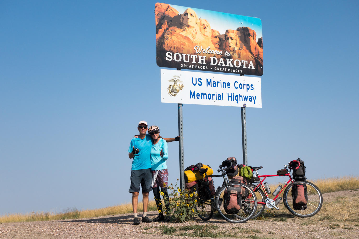 We say goodbye to Kurt, our Warmshowers host in Chadron and head for the McDonald's for breakfast before leaving town. A couple of kilometers west of Chadron we head north towards South Dakota. The scenery changes, it is much drier here, the hills are covered in golden grasses. There are some rock outcroppings and lots of black cows. At the Nebraska / South Dakota border is a casino and a restaurant, but we don't bother stopping. Except to take a photo at the new state sign.