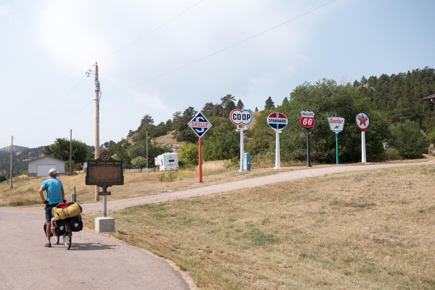 On the north side of Oelrichs is a gas station / convenience store where we get something cold to drink and eat our cinnamon rolls. A long downhill gets us to the Cheyenne River from where it is uphill into the Black Hills to the town of Hot Springs. The air is bad again today, smoke from the forest fires out West obscures the hills and the sky is a light grey instead of the blue it should be.