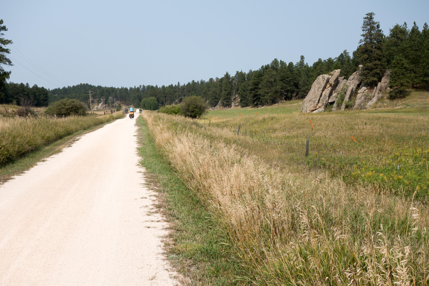 After two miles riding on gravel with the trail parallel to the road, we decide to ride on asphalt. Not much sense in riding the gradual climbing trail if you have to listen to the road noise anyways. But at Milepost 34 at the White Elephant Trailhead, the trail looks to diverge away from the road, so we hop on again until a couple of miles from Custer. The surface is okay, no goatheads and nice scenery.