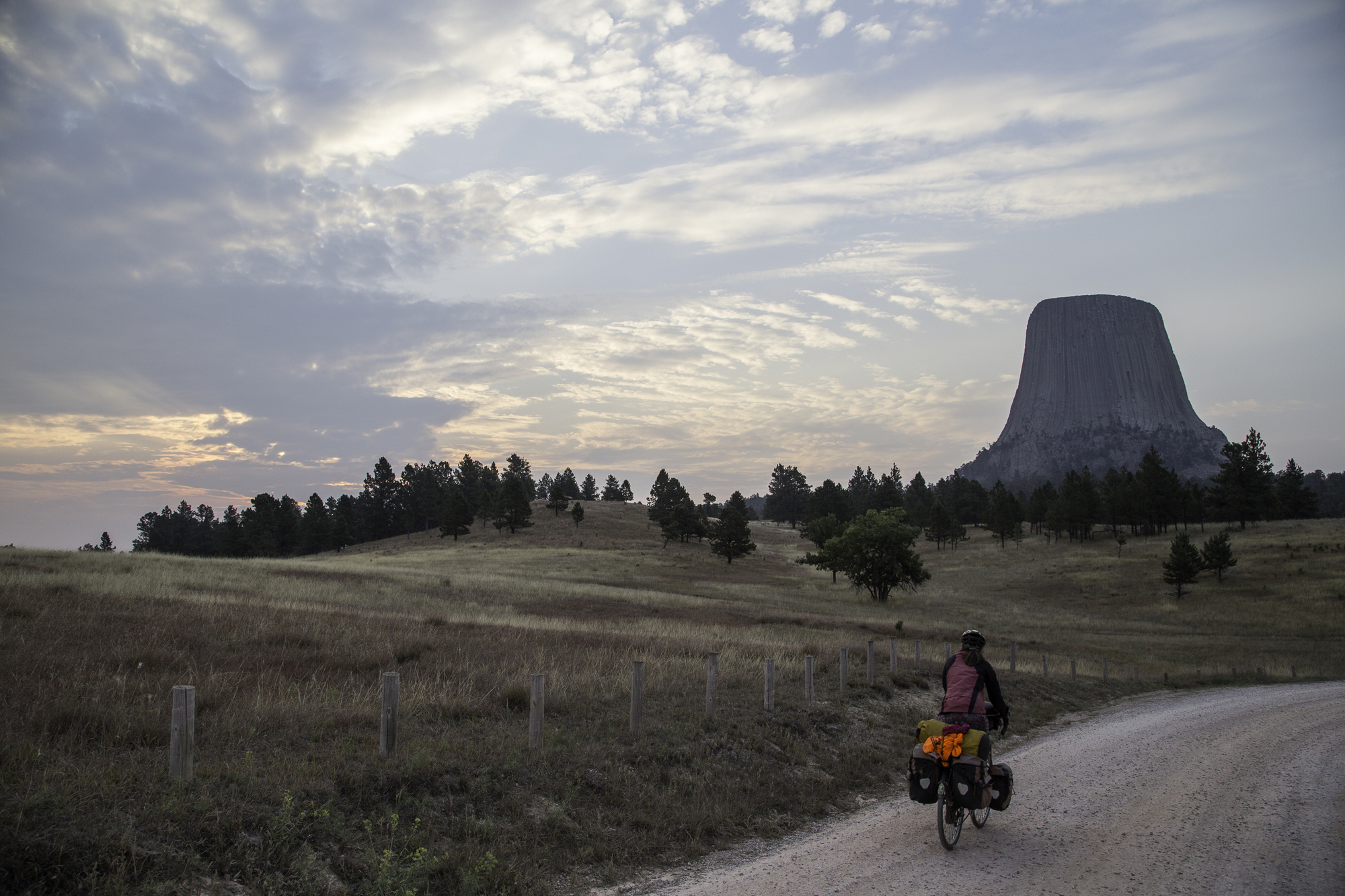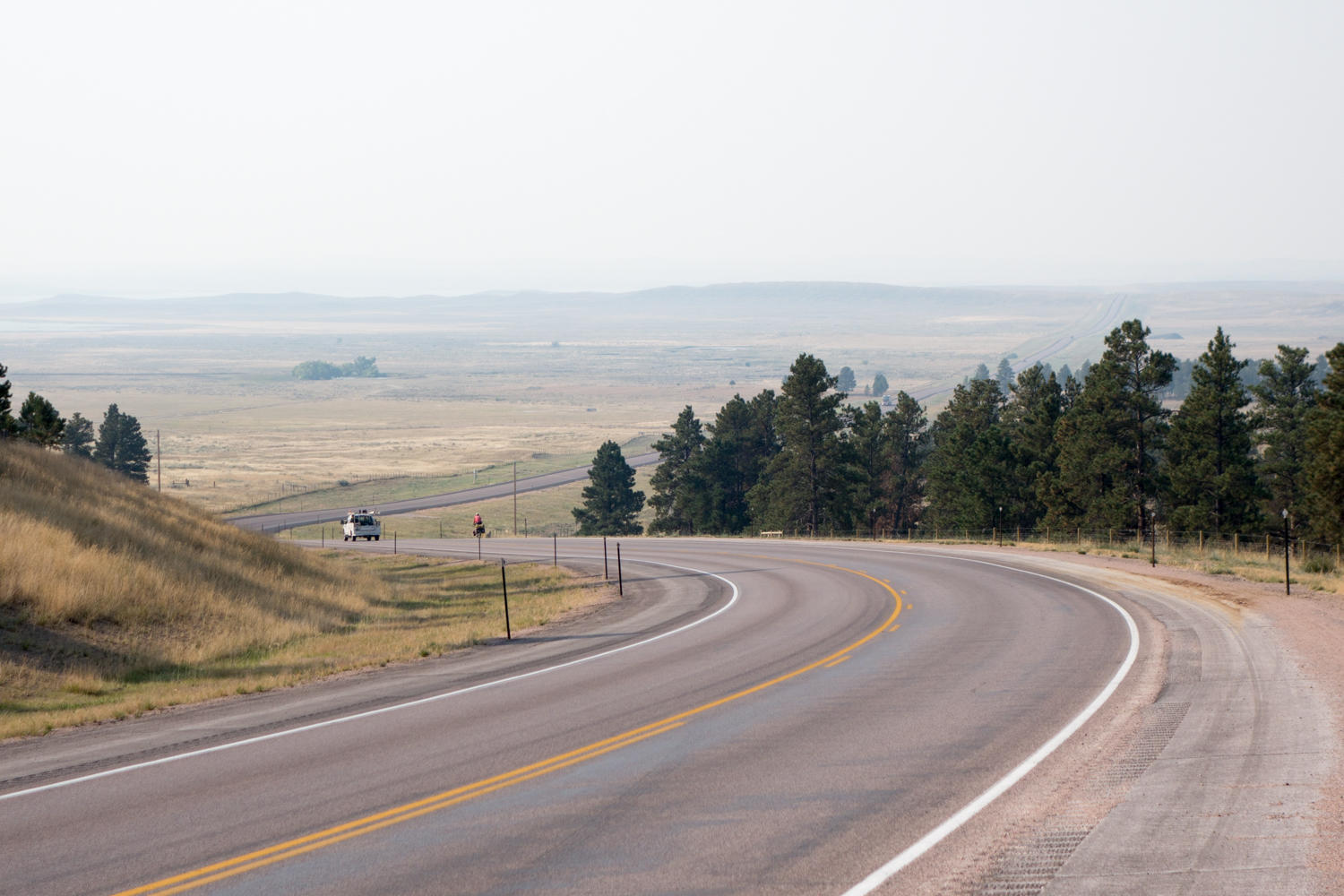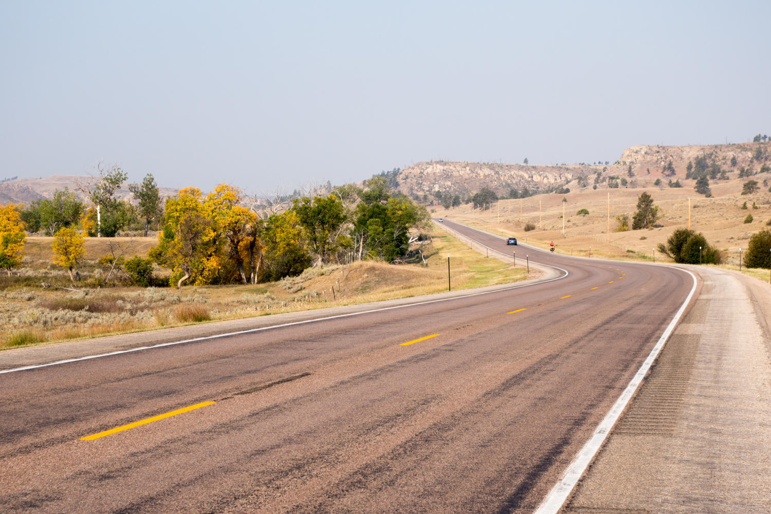 After dropping down to the entrance of the park and past many deer and buffalo, the road climbs. The wind is not a factor...yet. After Moorcroft, we take the information from another blog that the state route 51 has no shoulder and lots of traffic, and decide to ride on interstate 90. The wind picks up still more of a crosswind and rain threatens.