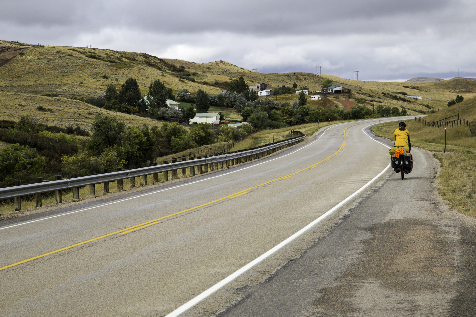 After packing up, we talk with the men who have arrived to start cooking breakfast in the church kitchen and have a cup of coffee. We roll our bikes to the front of the church because the cleaning ladies are starting to wash the floor. It's so cute, the cleaning ladies are wearing cowboy boots. When it's 7am, we go back to the cafe and have a breakfast burrito. The first 37km are uphill, rain threatens and it is cold.