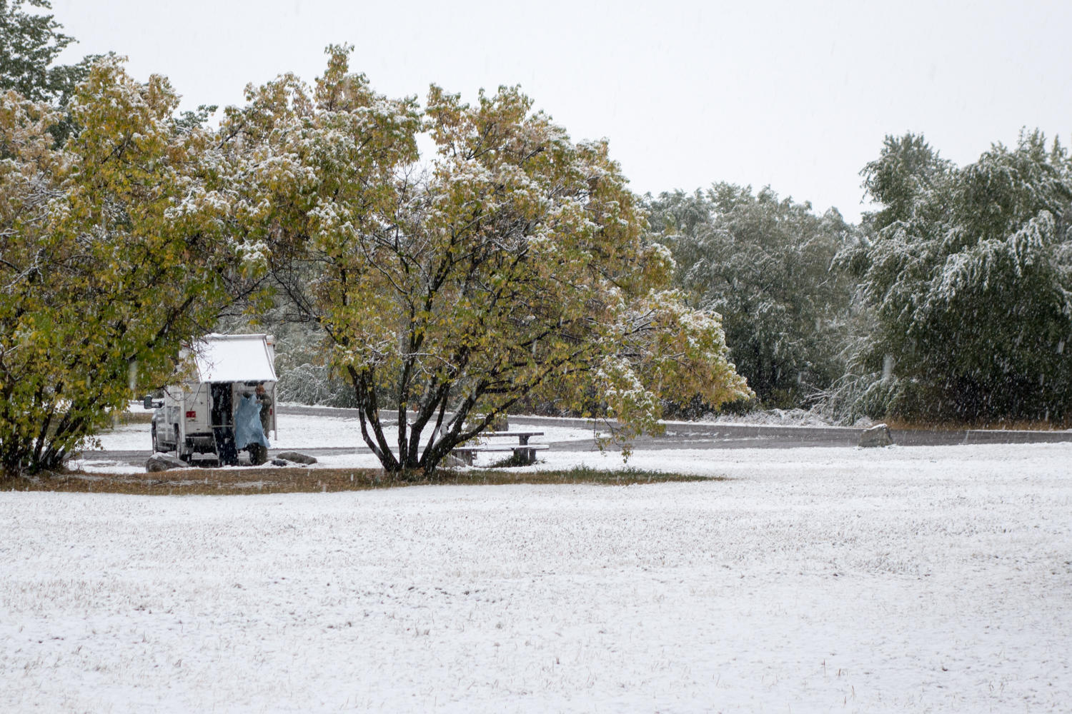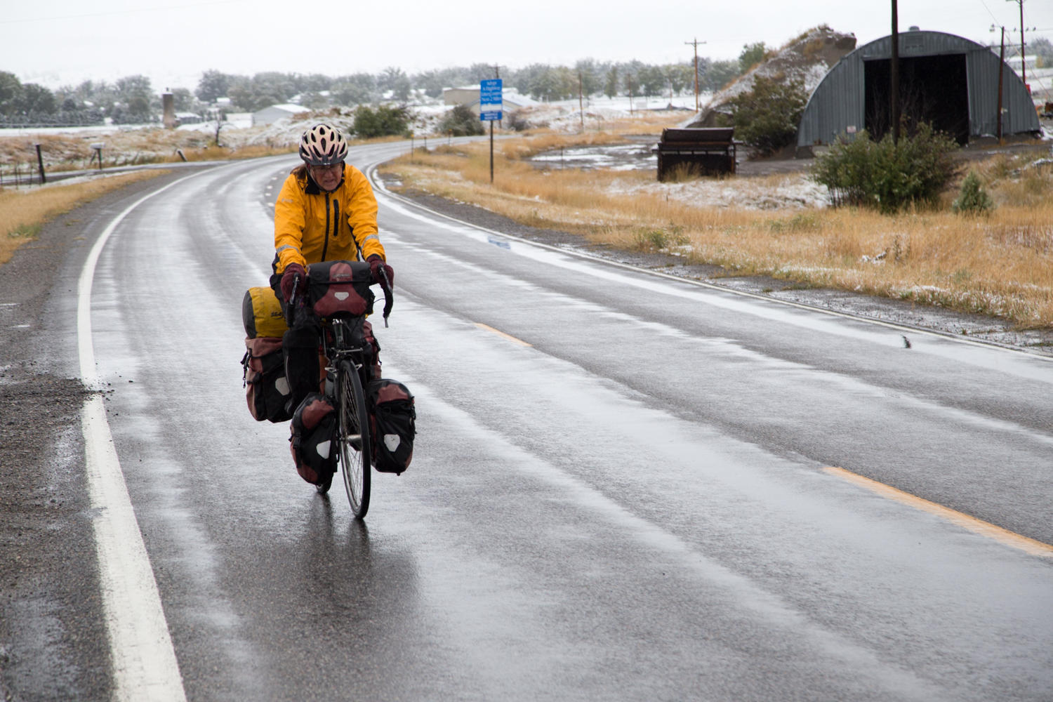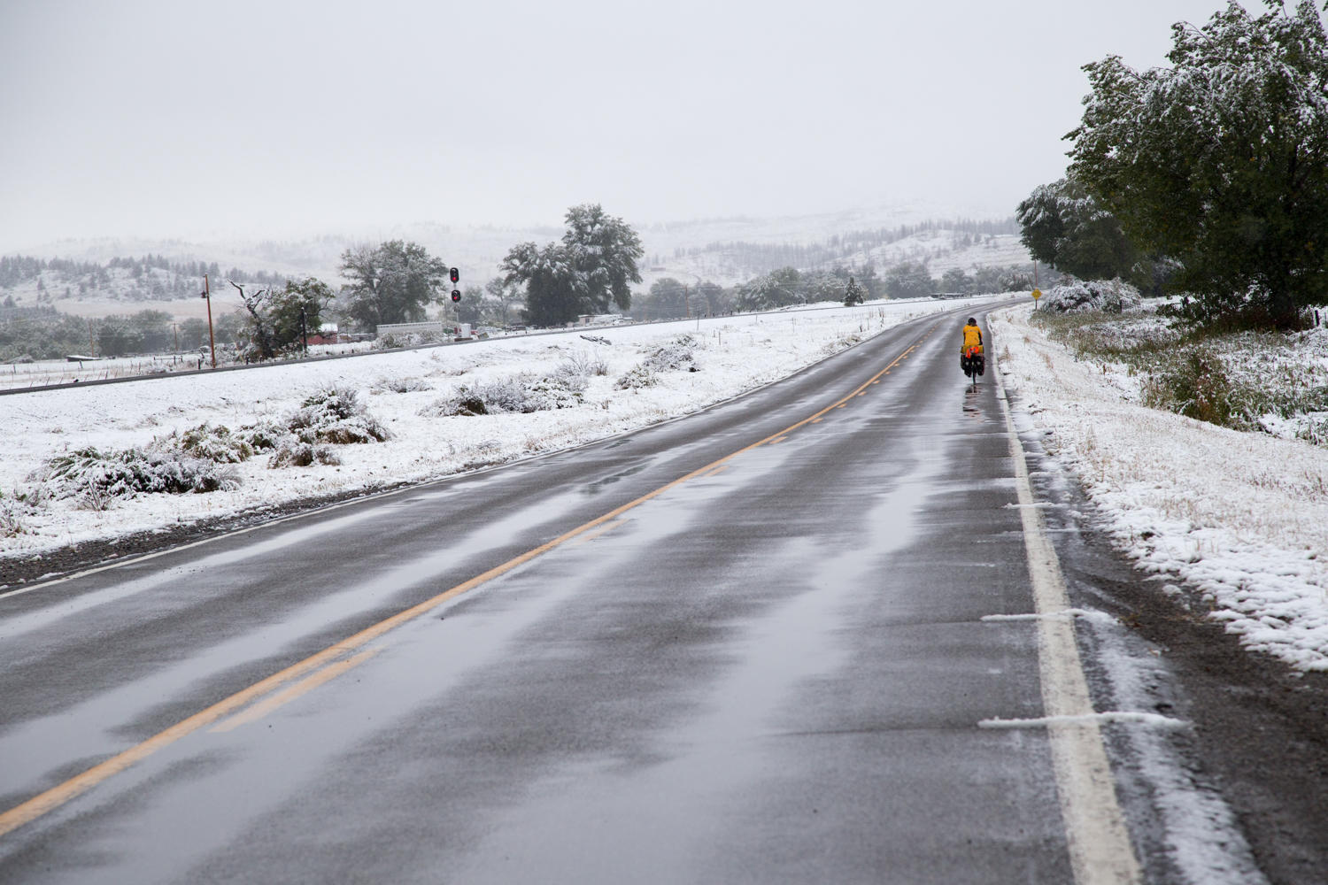 "At least your shift cable didn't freeze like in Mongolia" Patrick says as we are riding on the shoulder of I-90. We woke this morning to sounds of tree branches breaking from the wet snow in the campground and the ground covered in snow. And the snow continues most of the day.
