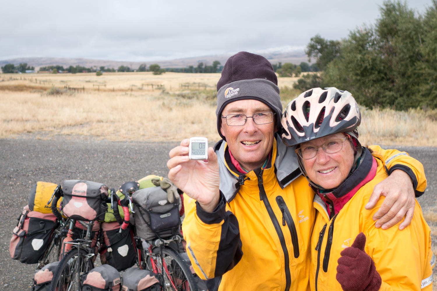The morning starts off very chilly and things do not change much. There is low cloud cover, left-over snow still blankets the sides or the road, the higher hills seem to have their winter coats on. We roll out at about 8am and head west for Bozeman. It helps to know we have a Warmshowers host lined up for a warm place to stay tonight. The first 24 kilometers we ride on the frontage road that parallels the Interstate. We reach the 40,000 and stop to take some photos to remember this moment. In 1994, Rachel joined Patrick for the ride from Capetown to Nairobi, and on from Gibraltar back to Ossendrecht. The last couple of months became a zigzag ride through Europe because Patrick wanted to reach the 40,000 mark. We achieved it the day before the trip ended. This time it is a bit earlier, we still have three weeks and about another 1000k's to go to Boise.