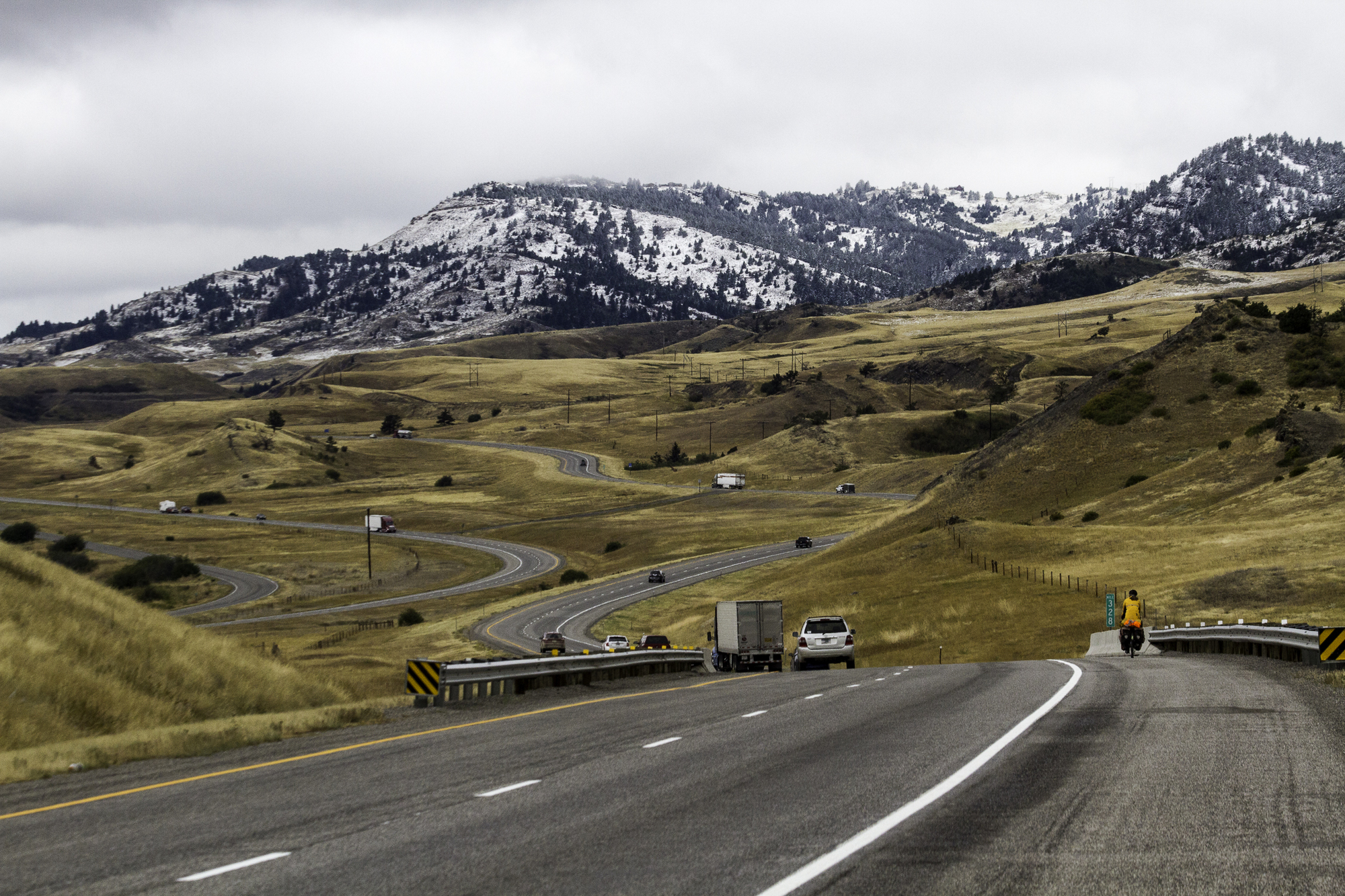 With bellies full of eggs, hashbrowns, bacon and biscuits and gravy, we start the 20 kilometer climb to Bozeman Pass over Bridger mountains. We work up a sweat on the climb, but it does not get any warmer. At the summit is an interpretive sign telling us William Clark and Sacajawea passed this way in 1806 on their way back east after crossing to the Pacific. That really was not that long ago. Now this valley holds an Interstate Highway, a busy railroad and more and more houses from people that seek solitude but are willing to listen to non-stop traffic noise.