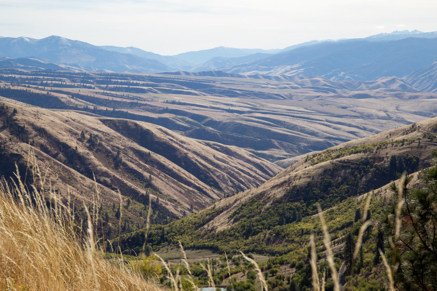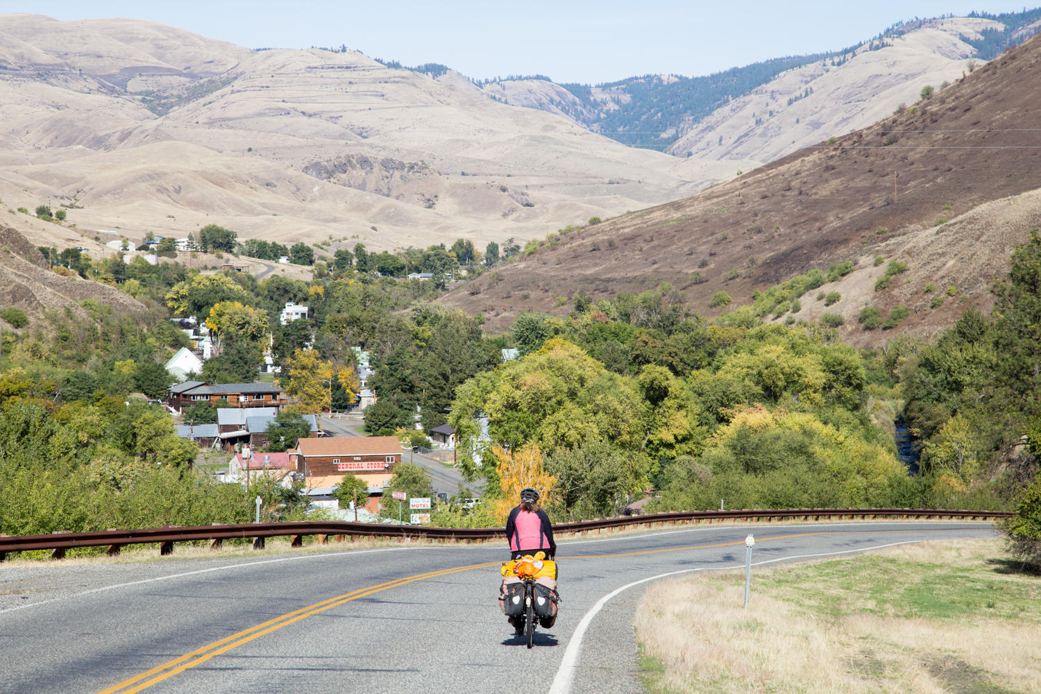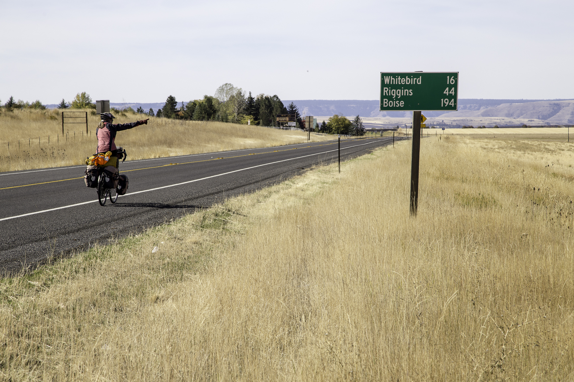 Those first 15 or 20 km we follow the South Fork of the Clearwater River gradually upstream before starting the climb up to Grangeville. When cycling new roads, sometimes sections, or scenery, or smells remind us of past places we've cycled. So many times in the last two years we would cycle past hills or on road and we would say: “this could be Idaho”. And now here we are: cycling Idaho. This is a beautiful but tough ride today following the Nez Perce Trail and the Scenic Northwest Passage trail. After reaching Grangeville, we stop at a supermarket to buy supplies before setting off for the second part of the climb. It is slow going but finally we reach the summit of Whitebird Hill at 4245 feet. We were planning to take the Old Whitebird road down, but find that it first goes up some more. We turn around and decide to stay on the new road. We zoom down on the 7% grade, all the way to the Salmon River.