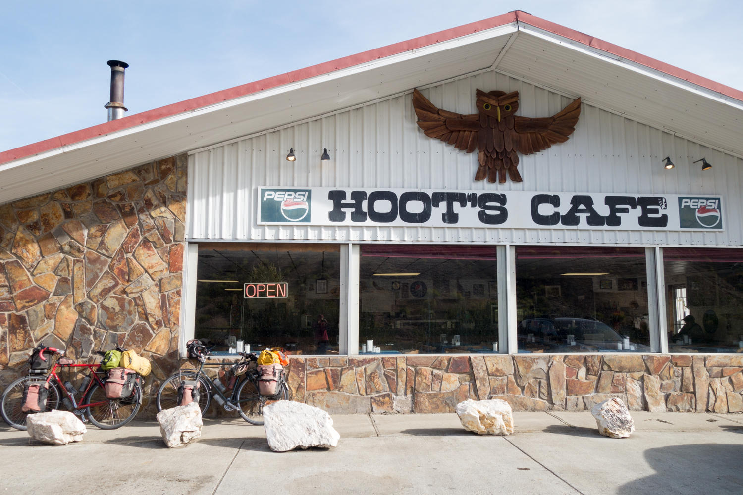 Reaching Whitebird, we are disappointed to find everything closed except the bar. Our plan was to have dinner in town at a Mexican Restaurant before going to the campground, it's closed. The bar only offers meat pockets and pizza for food. They recommend going to Hoots Cafe further up the road. Rather than climbing back up to the new road and over another hill, we take the Old 95 and pass the Swiftwater Campground where we plan to camp. We need to go over a couple more hills and back to the new road to find Hoots. And it is a hoot. Owls are everywhere. Neither of us fancies back tracking so Patrick asks about a room at the associated motel. The rate is reasonable at $43, a nice restaurant and best of all no backtracking to the campground. We take a room!