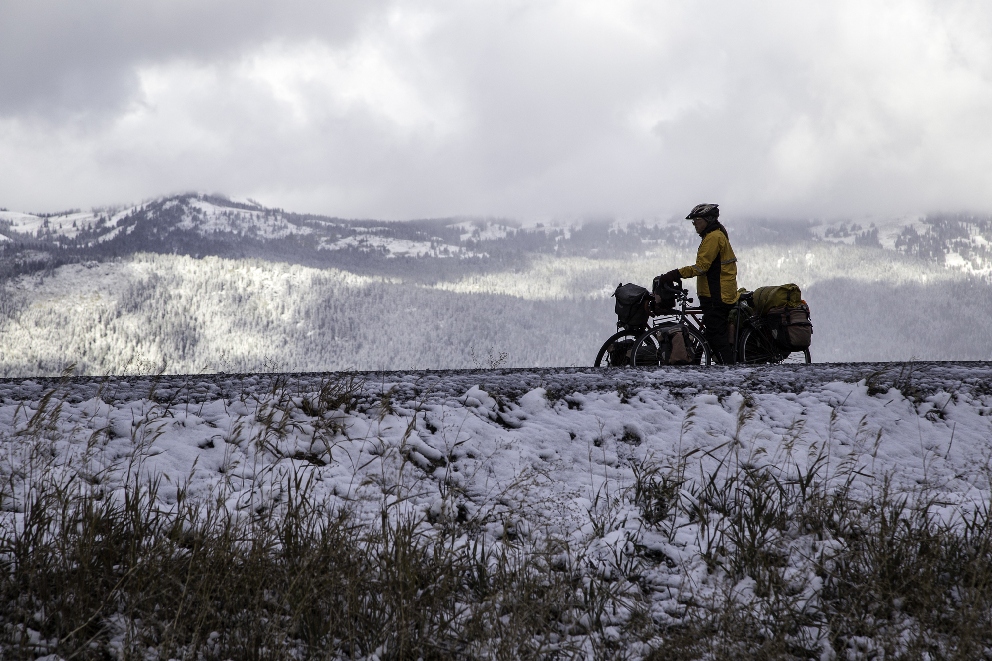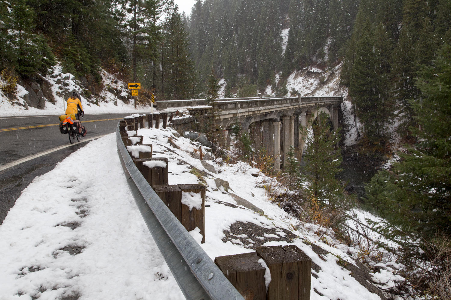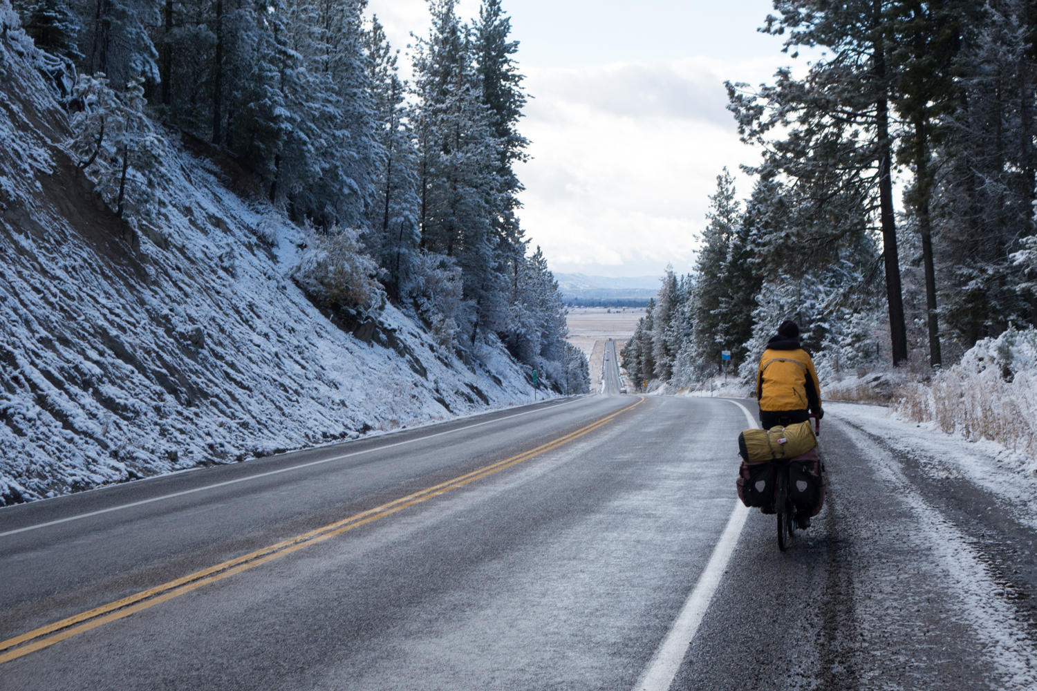 We leave their cabin and head back onto Highway 55 towards Boise. The weather seems to clear up a bit when we reach Cascade, but we are in for a surprise. After a second breakfast at the local cafe we find that dark storm clouds have come over the western mountains. Not far out of town we are overtaken by a snowstorm. At first the snow that hits the ground melts and we are only riding on wet surface. The snowflakes are stinging our eyes and lips. Then the snow starts to stick to the road and it gets slick. Together with the busy traffic on the highway and the narrow shoulder it becomes dangerous. There aren't any good options though; nowhere to seek shelter until the cafe on the intersection with the Cabarton Road. We are happy to find it open and dripping wet, we seek shelter in a booth next to the heater. After hot chocolate and a slice of carrot cake the sun has broken through and we set off again. Just to run into the next storm. Fortunately we are losing elevation now and the snow turns to rain.
