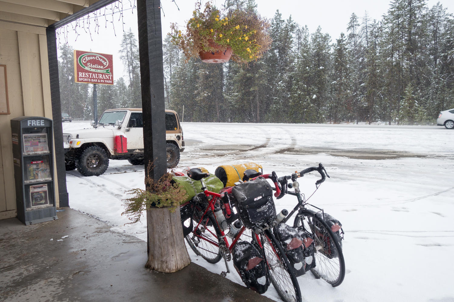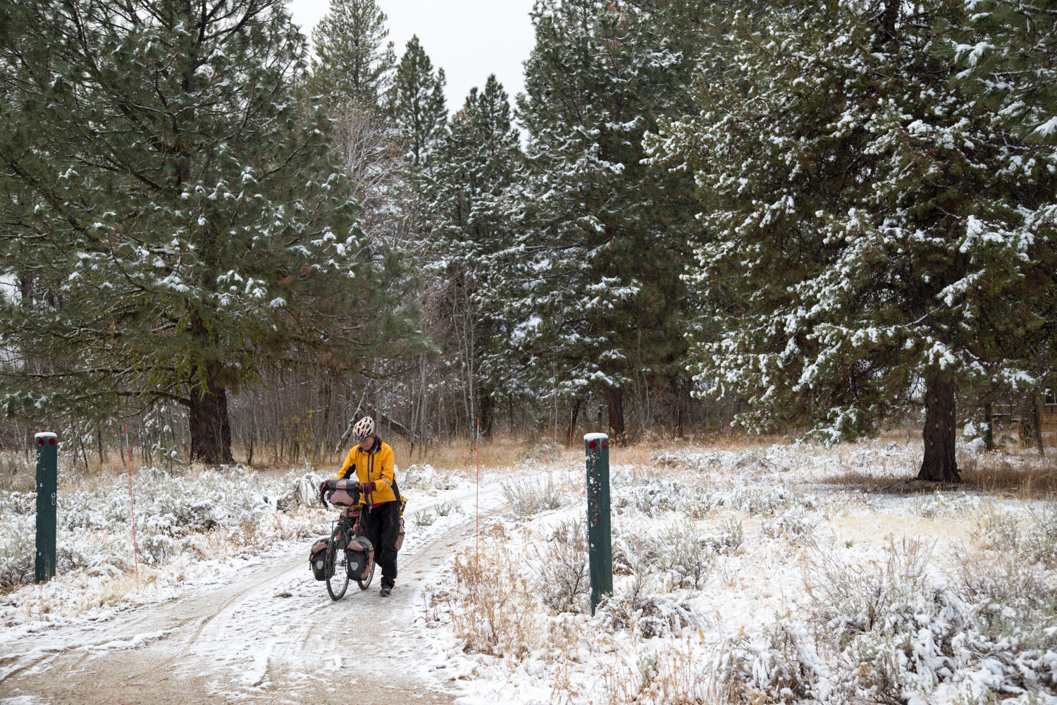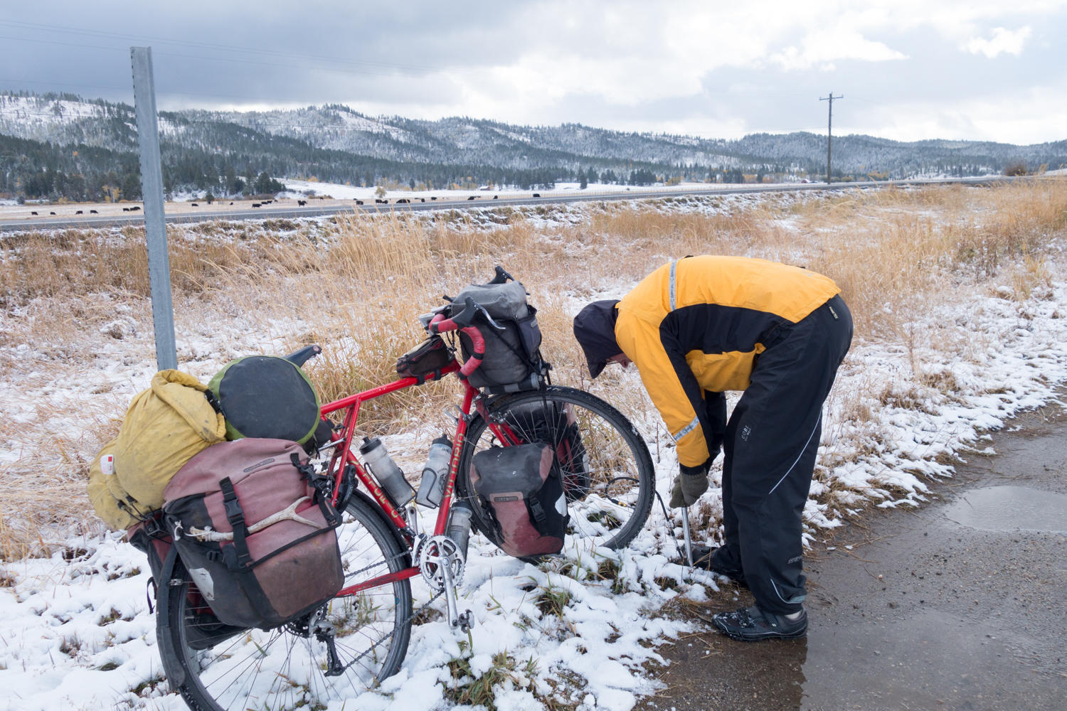 We leave their cabin and head back onto Highway 55 towards Boise. The weather seems to clear up a bit when we reach Cascade, but we are in for a surprise. After a second breakfast at the local cafe we find that dark storm clouds have come over the western mountains. Not far out of town we are overtaken by a snowstorm. At first the snow that hits the ground melts and we are only riding on wet surface. The snowflakes are stinging our eyes and lips. Then the snow starts to stick to the road and it gets slick. Together with the busy traffic on the highway and the narrow shoulder it becomes dangerous. There aren't any good options though; nowhere to seek shelter until the cafe on the intersection with the Cabarton Road. We are happy to find it open and dripping wet, we seek shelter in a booth next to the heater. After hot chocolate and a slice of carrot cake the sun has broken through and we set off again. Just to run into the next storm. Fortunately we are losing elevation now and the snow turns to rain.