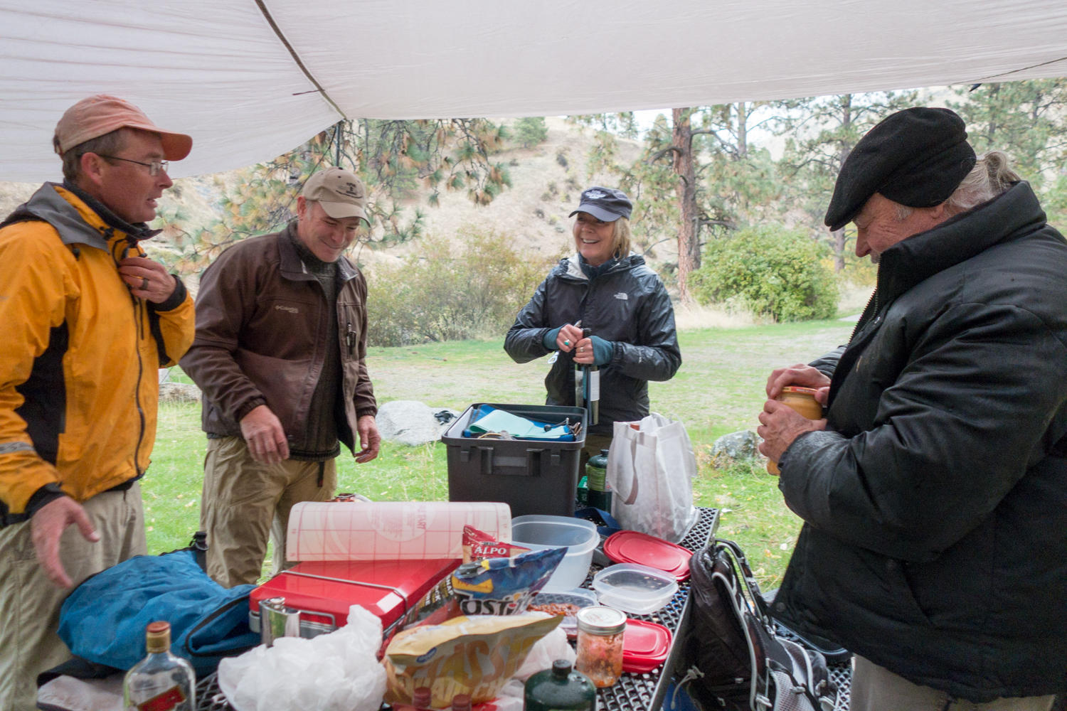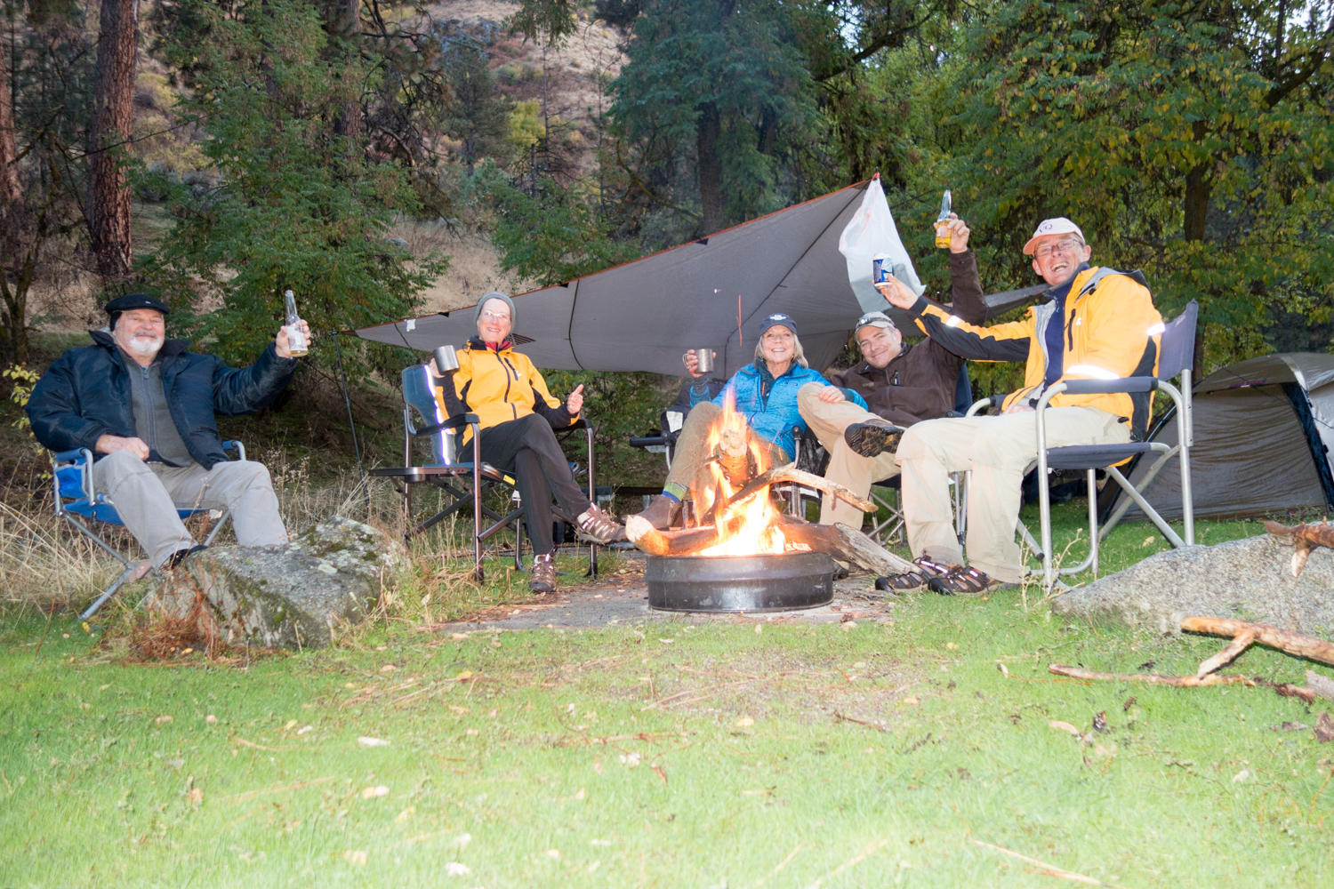 At Banks, we stop again at the bar / restaurant. We need a beer and something hot. Their chili is great. When the waitress finds out about our trip, we get the beer on the house. Only about ten more kilometers to go to our final campsite. On the banks of the Payette River is Chief Parish, a "day-use-area" where rafters can stop to use the outhouse. There are some picnic tables and a grassy area. You are not supposed to camp here, but the barrier is down across the access road and we do not expect to get disturbed. Except of course by our friends that know where we are and are coming out to spend the last evening on-the-road with us.