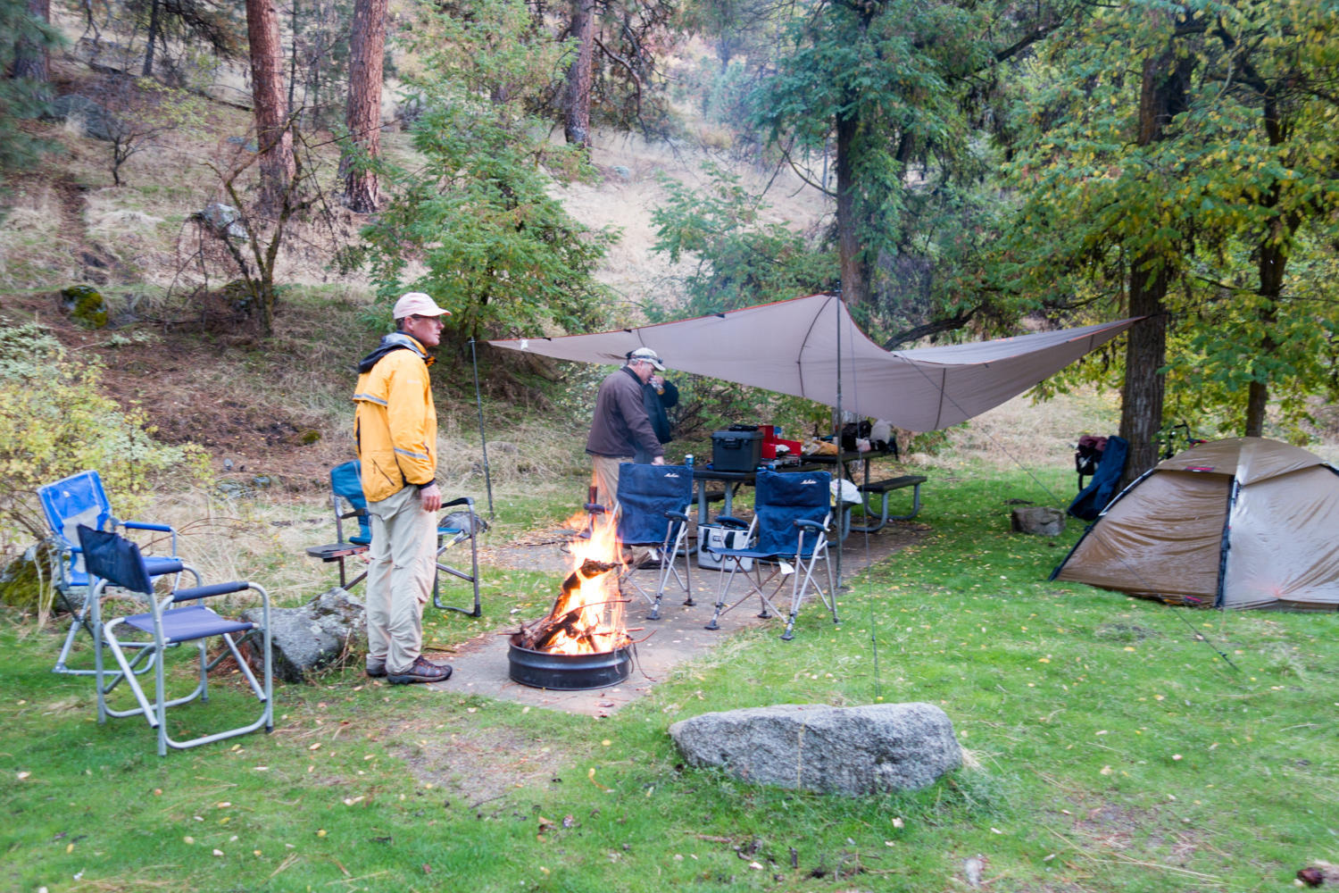 After we pitch our tent there is not much else to do but get into the tent and under the sleeping bags to stay warm. Just before dark our friends Gordon, Bob and Cynthia arrive. We have not seen them for thirty months. They have brought drinks, food and firewood. All we need for a very pleasant evening enjoying the warmth of the fire and our friendship.