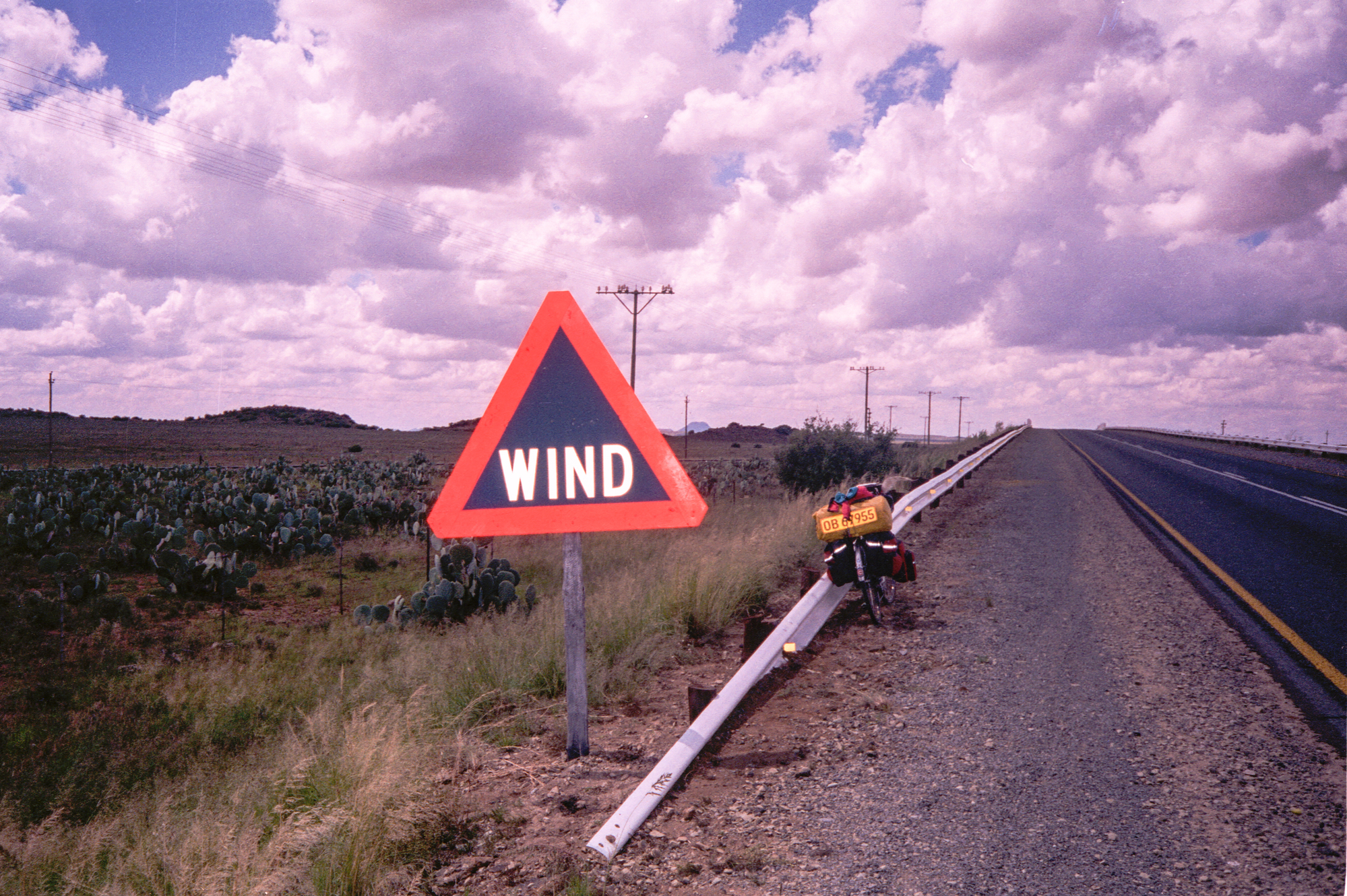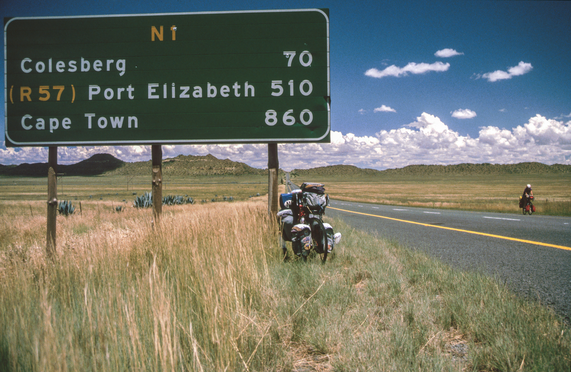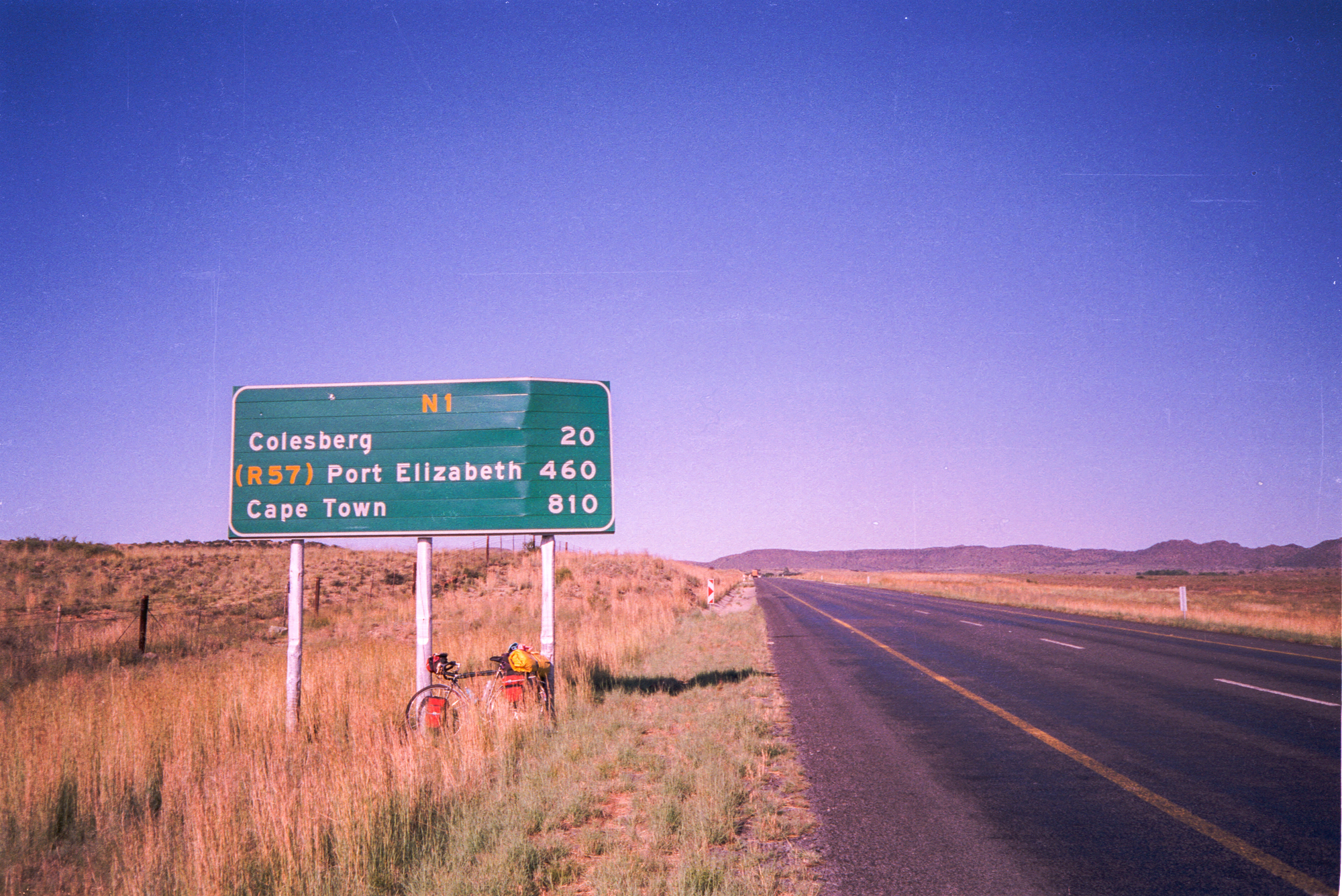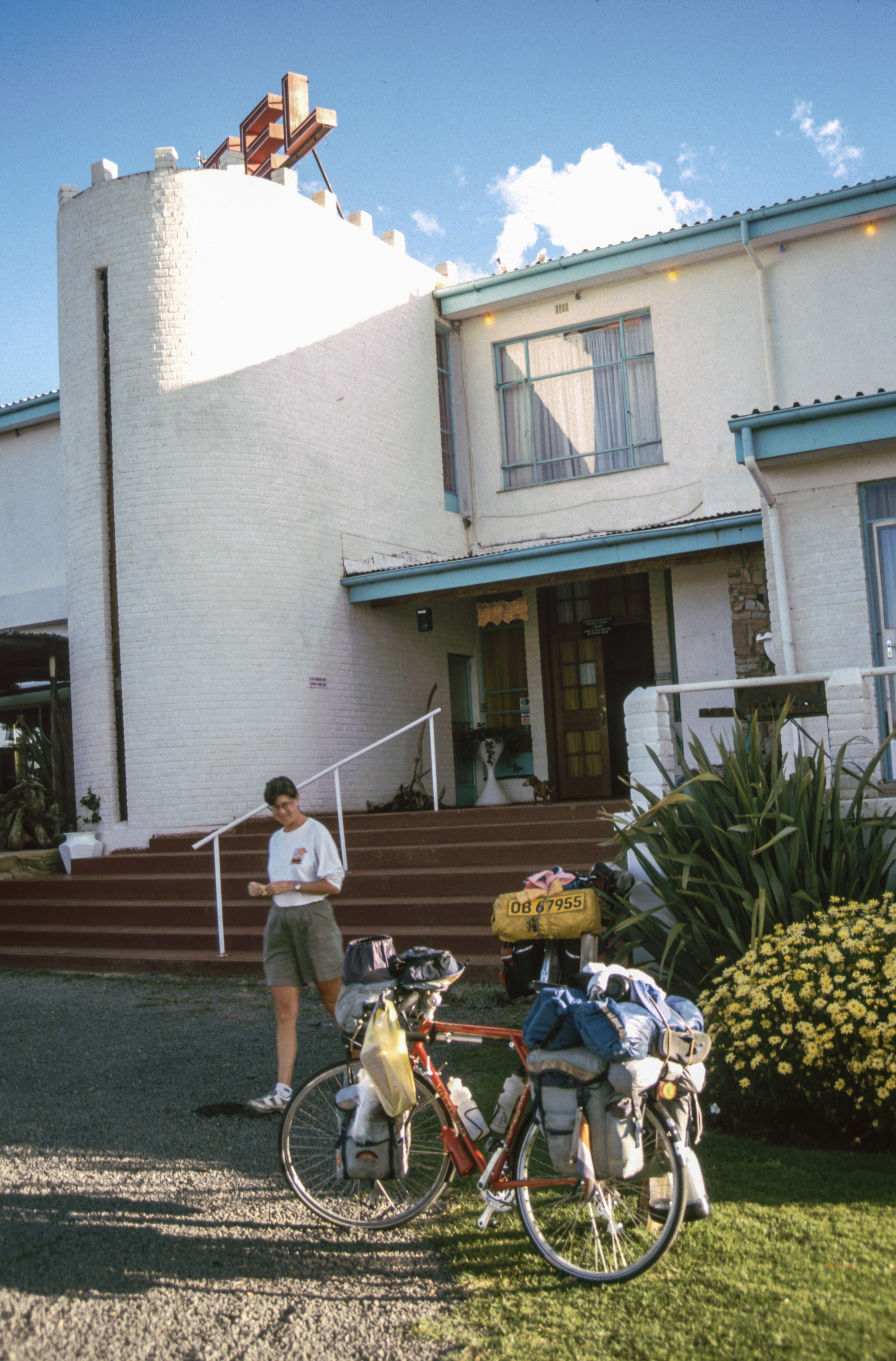 The next day we cycle to Colesberg (99.8km)and see grassy plains. The following day to Thrompsberg (121km) we again ask to camp at a motel and given a room instead.