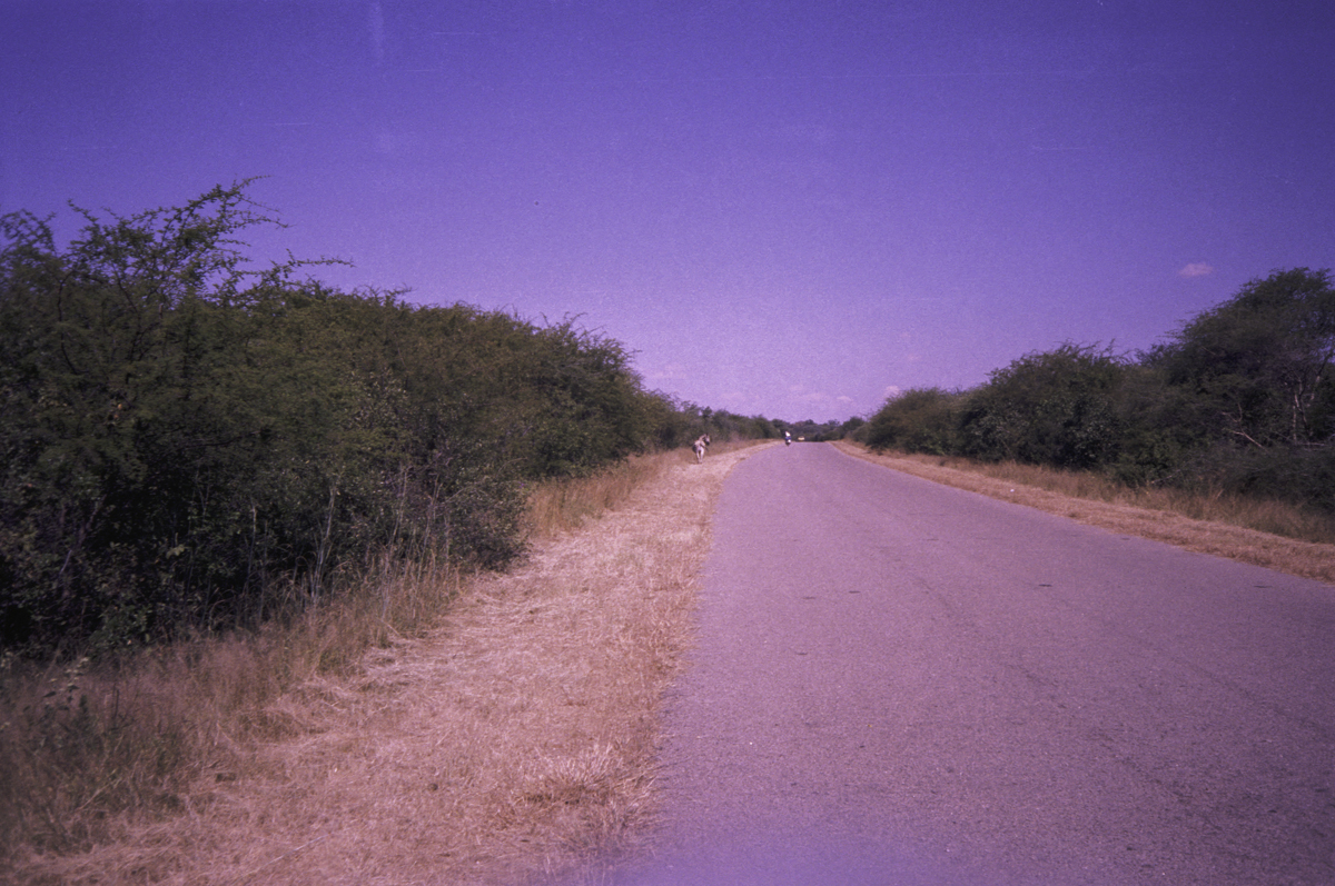 Look closely. We were cycling into Hwange NP but the main gate was a distance....there is a zebra on the left that had been chasing Patrick.
