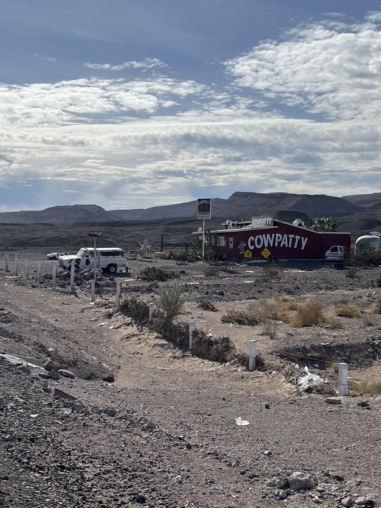 I was really looking forward to having a hot dog at the semi famous Cow Patty restaurant right before Puertocitos. One sign said open. One sign said closed. It appeared no one was there. They only serve hot dogs and beer. I guess neither for me.