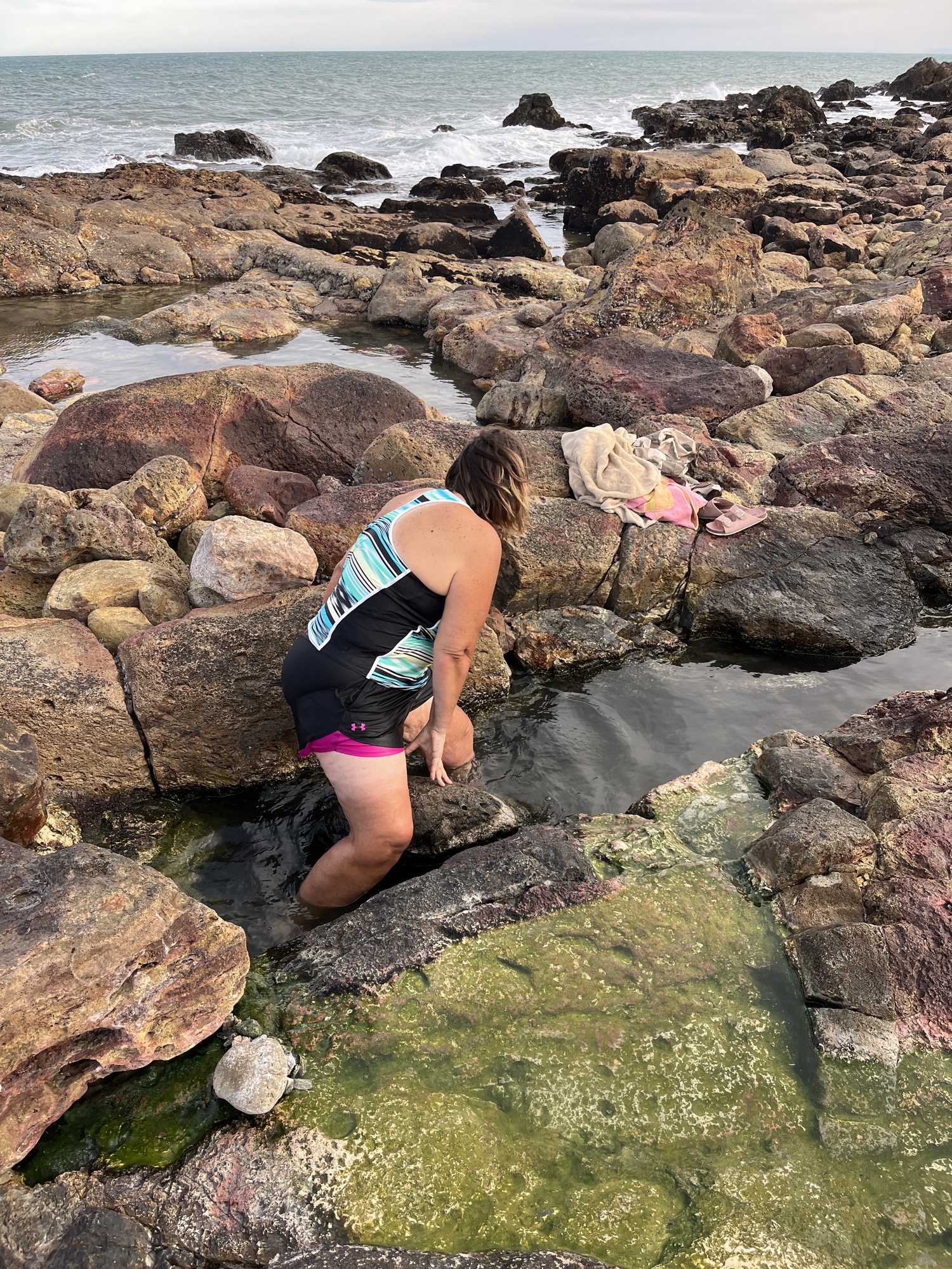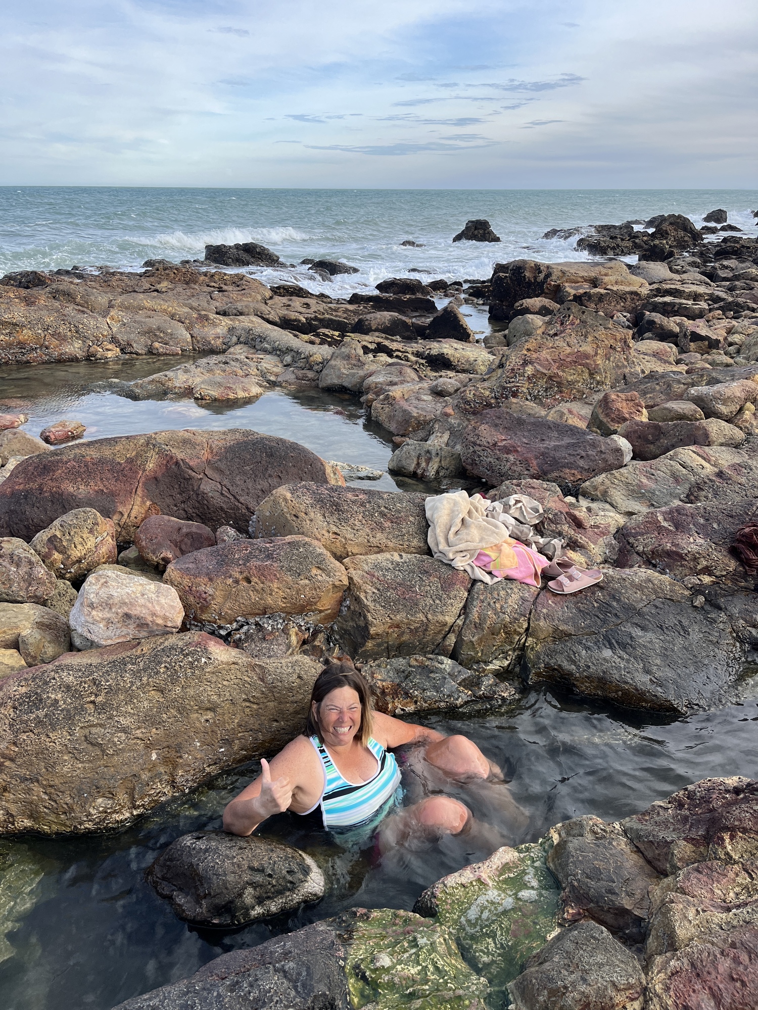 I had heard the deepest one, the highest up is too hot to sit in unless you catch it with the tide so it can cool it down. The second one was packed so I went down to the ones closest to the shore. Not exactly warm, but it was okay. I eventually moved up a pool and stuck my feet in. Eventually, people left and I had an excellent spot to sit in and soak. Perfect! I had asked someone if they would mind taking a picture of me and turned my head to see how far away my phone was. Instead I saw bare ass! The guy who had just gotten out of my pool. Uuuugh, those Europreans who will just strip down anywhere to change, ha ha.