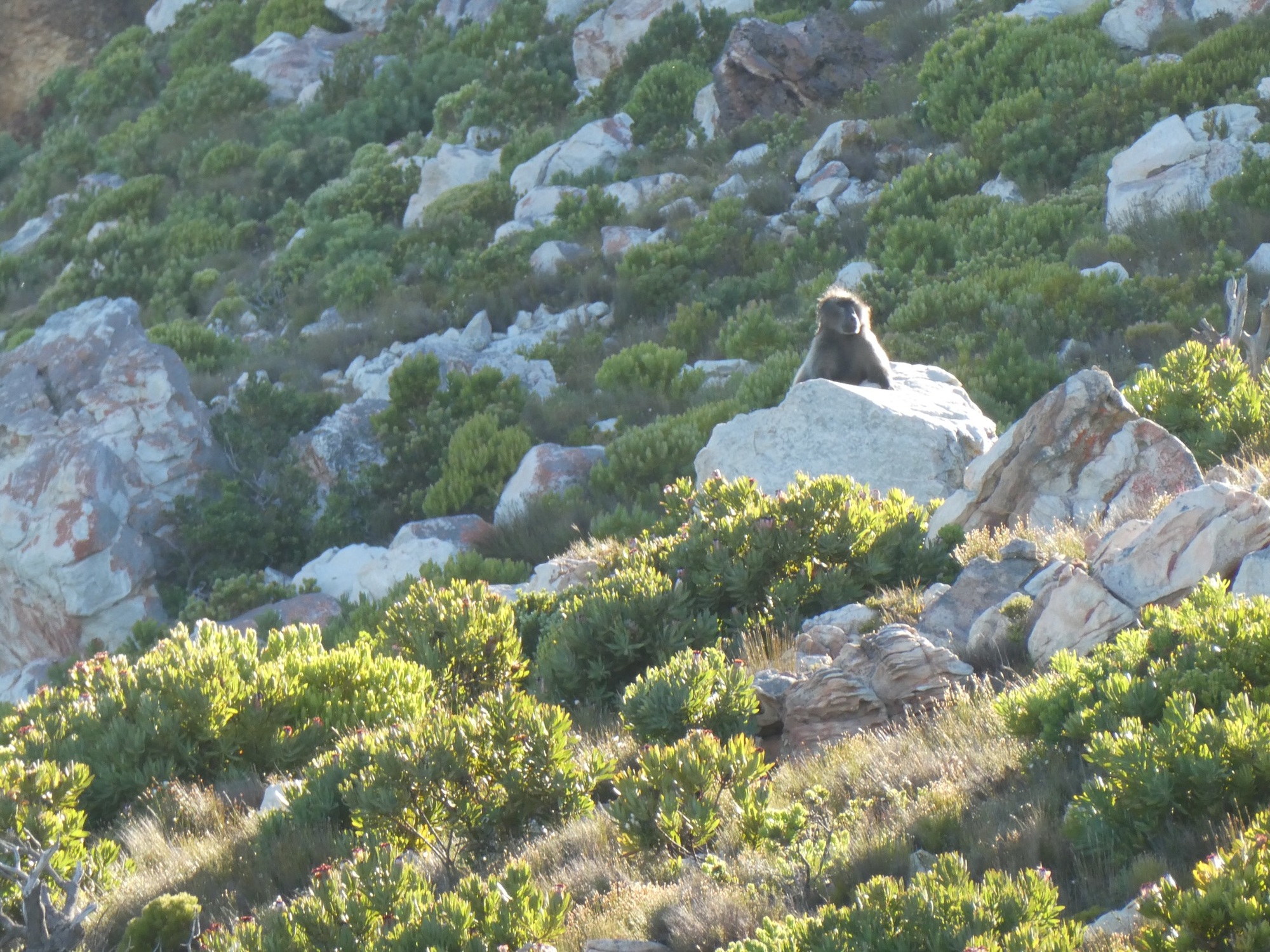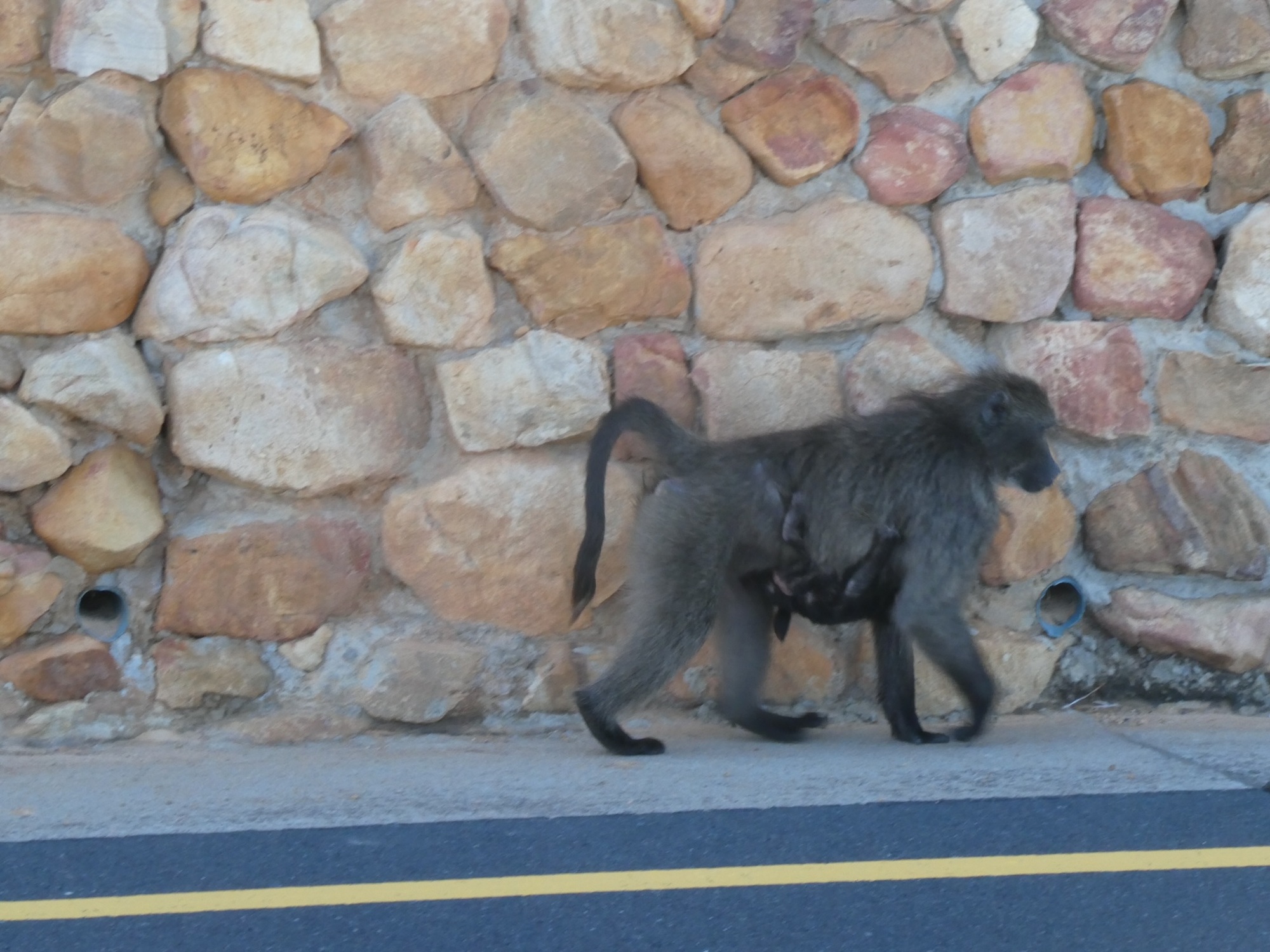 It was just past the town of Rooi-Els. We had stopped at a pullout and a gentleman was there who oversees the local baboon troupe. He said they were coming down the road so we decided to wait. They weren't in any hurry at all, but while we were waiting, I learned so much about baboon behavior. Good to hear they never attack humans! As the first one came down and across the road it was amazing. A baboon walking right by me! They all have names and the baboons and guy know each other. He walked with the baboon by our bags and his car because otherwise he said the baboon would have been tugging on stuff looking for food. They behaved since he was there! He said if they ever do that, just slap them. Ummm, I don't think so!