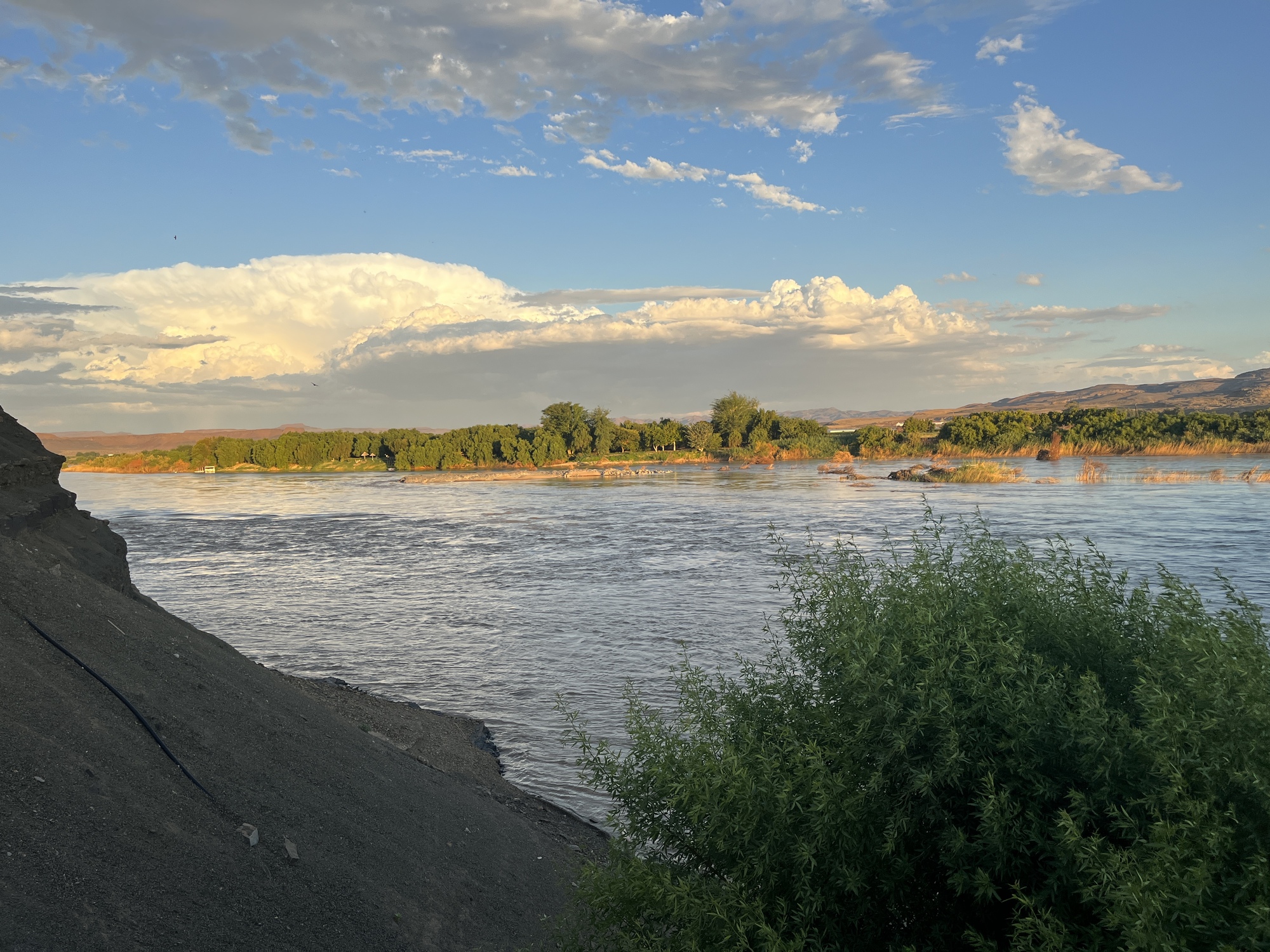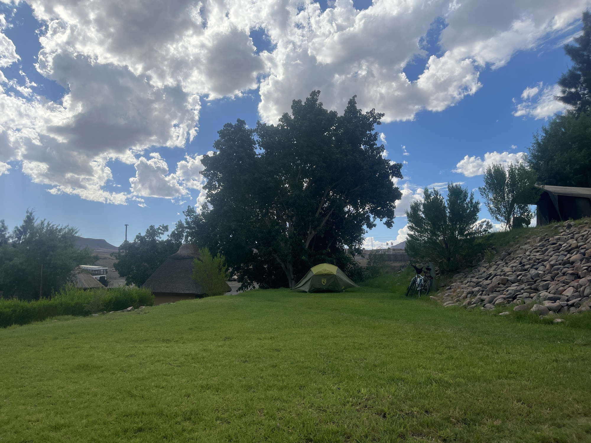 It's now early afternoon and the sun is blazing. I had called ahead to Amanzi Trails campsite to verify camping. But after further research I realized, there's one called Felix Unite a bit closer to the highway and they have a swimming pool. Sounds good to me. Easy enough terrain, but then some short, steep rolling hills appear. I'm hot, I'm tired from yesterday and they were not making me happy. I am glad to see the turn off to Felix Unite. It should be noted that both camps cater to multi day canoe trips on the Orange River. Reception at Felix Unite tells me the owner said no more independent campers as of yesterday. They have grass everywhere. Can yo call him and explain I am on a bicycle and get permission? Nope, not willing to do it. No choice, but to leave. I head back up the hill to the main road, but have to stop and rest. I'm exhausted and a hill I should be able to ride is killing me. I get to the road, go down and 1/2 up another steep one before I'm pushing the rest of the way. Next thing I know, a truck with Felix Unite passes by and pulls over and a guy hops out. Yes, I can camp there. I see the turnoff to Amanzi though, but it's 3 km down a gravel road. I thought the initial customer service was poor, so might have continued to the other campsite, but the swimming pool was calling my name. They had a great pool, bar and restaurant area all overlooking the river. I got my tent set up in a nice shady spot and relaxed the rest of the day.