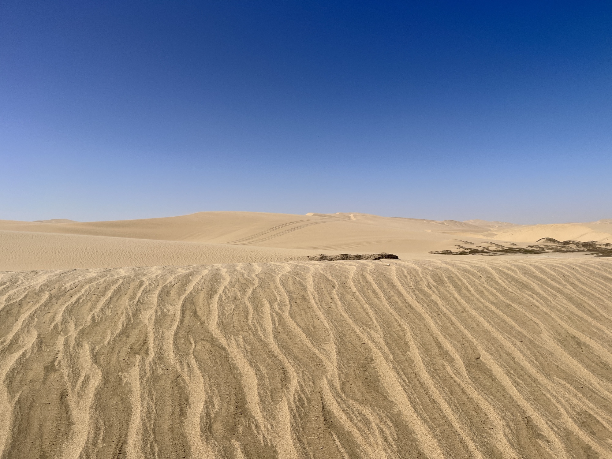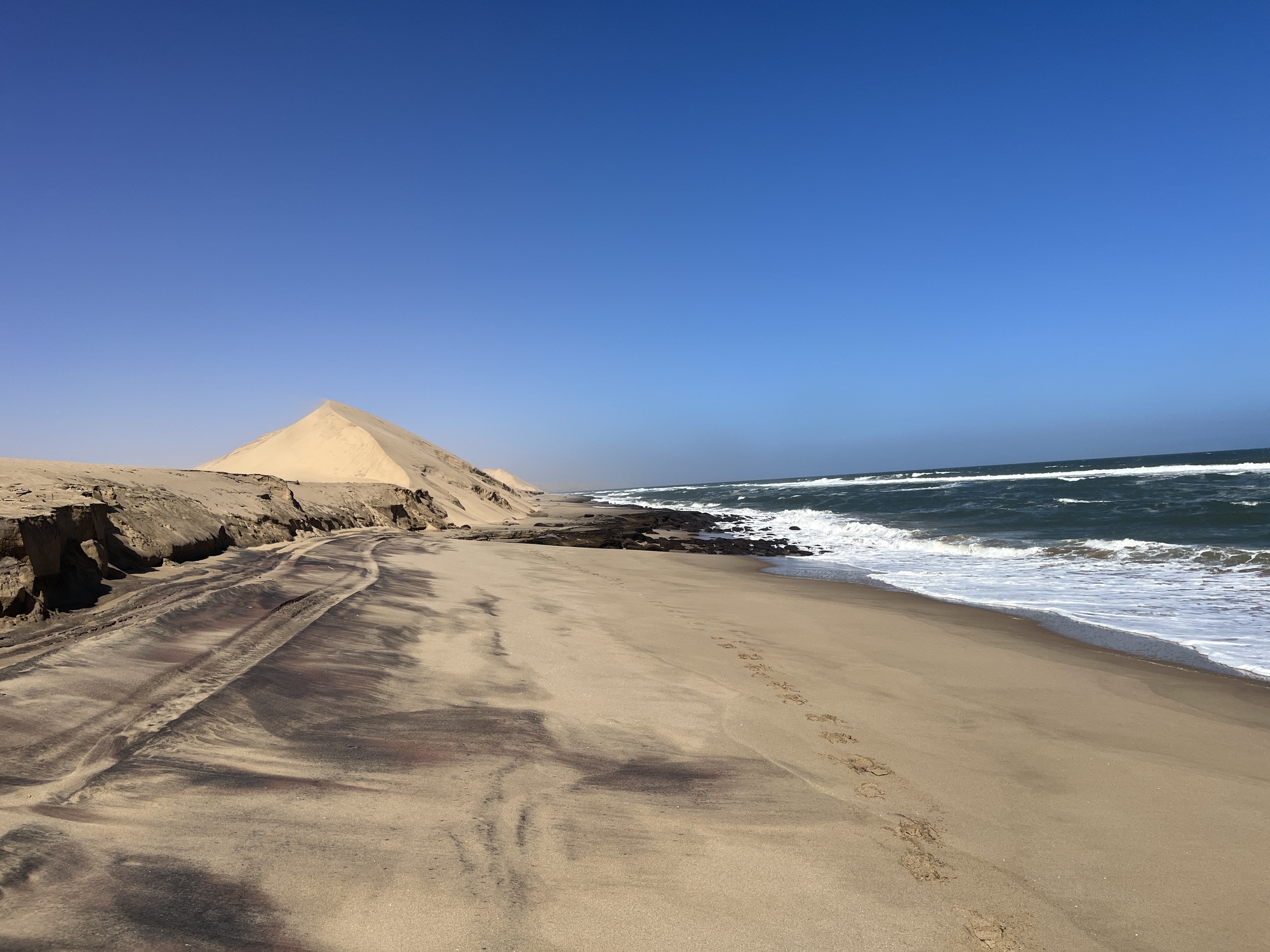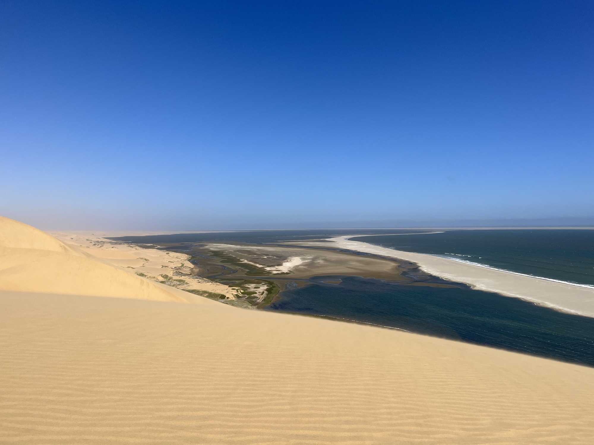 I did get a little car sick from all the bumps along the way. We drove on the beach right along the ocean. The dunes extend right down to the sea. It was exceptionally windy which creates sharp edges at the top of the dunes. This makes driving up and over them dangerous as you are more likely to get stuck and/or end up rolling down the hill -- not on your tires! We did go up in the dunes to get a fantastic view overlooking Sandwich harbor. However, because of the winds, we had to go back the same way we came in as the danger of getting stuck in the dunes was real. We found out in the morning that another tour group had gotten stuck for hours!