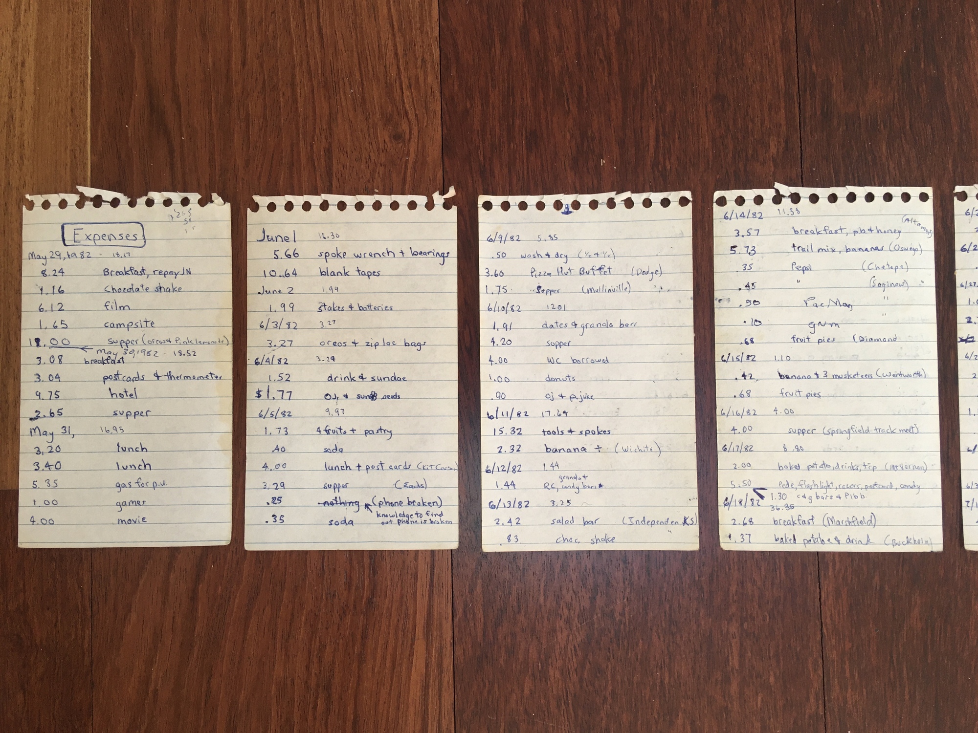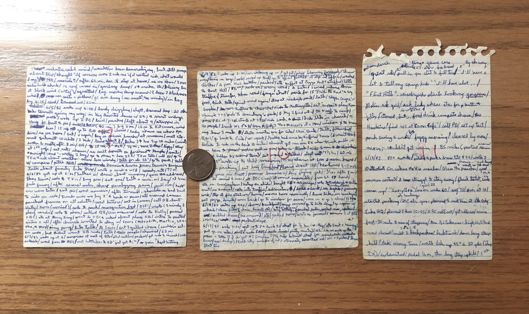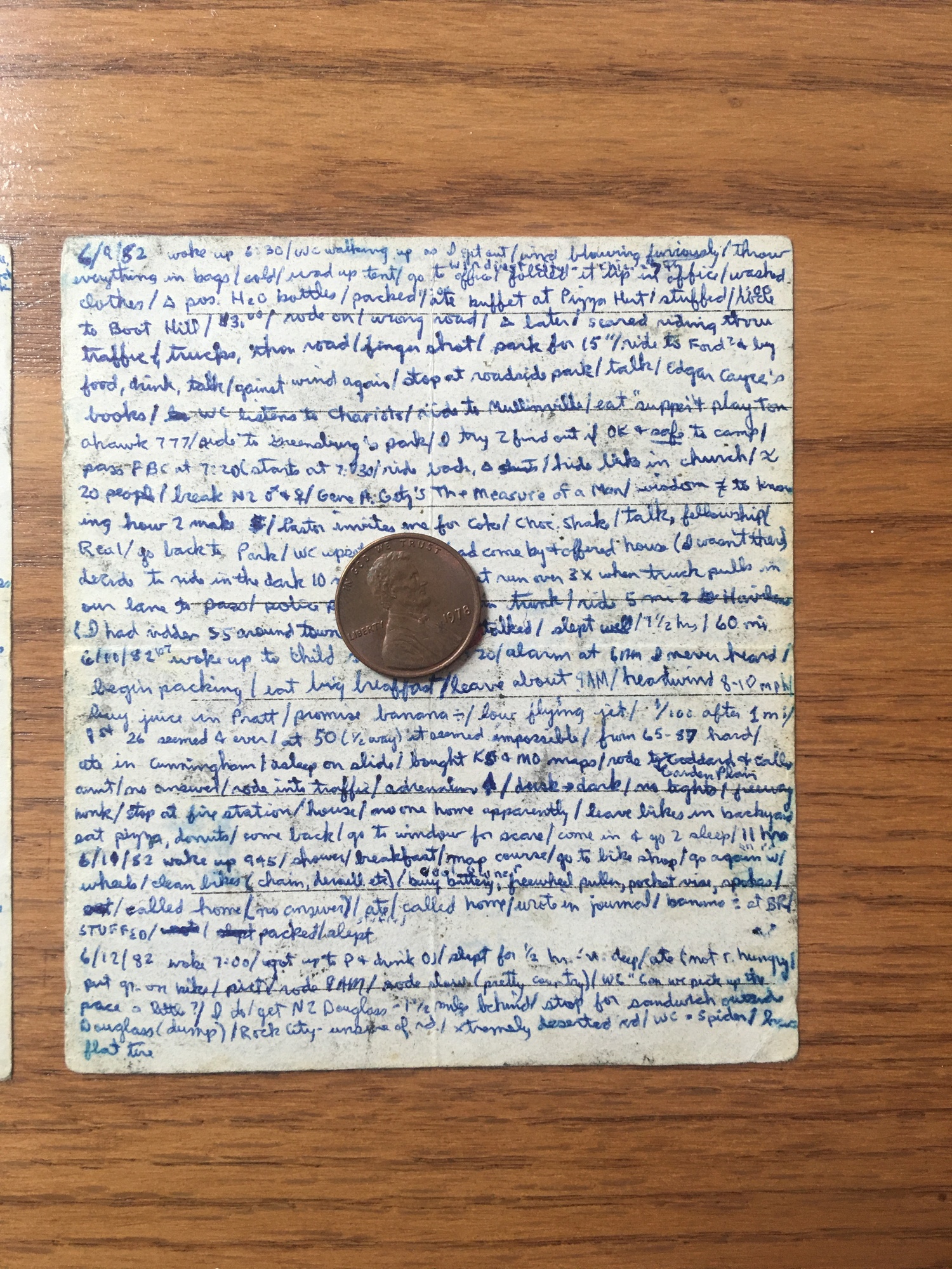 I took my first bike trip in 1982. I journaled it, but since there were no computers at the time I used an old fashioned pen and paper. The pieces of paper I wrote on were typically squares slightly larger than your palm, although I sometimes used the smallest spiral notebook I could find. When I finished my trip, I tucked them away in a folder in my file cabinet for a few decades.