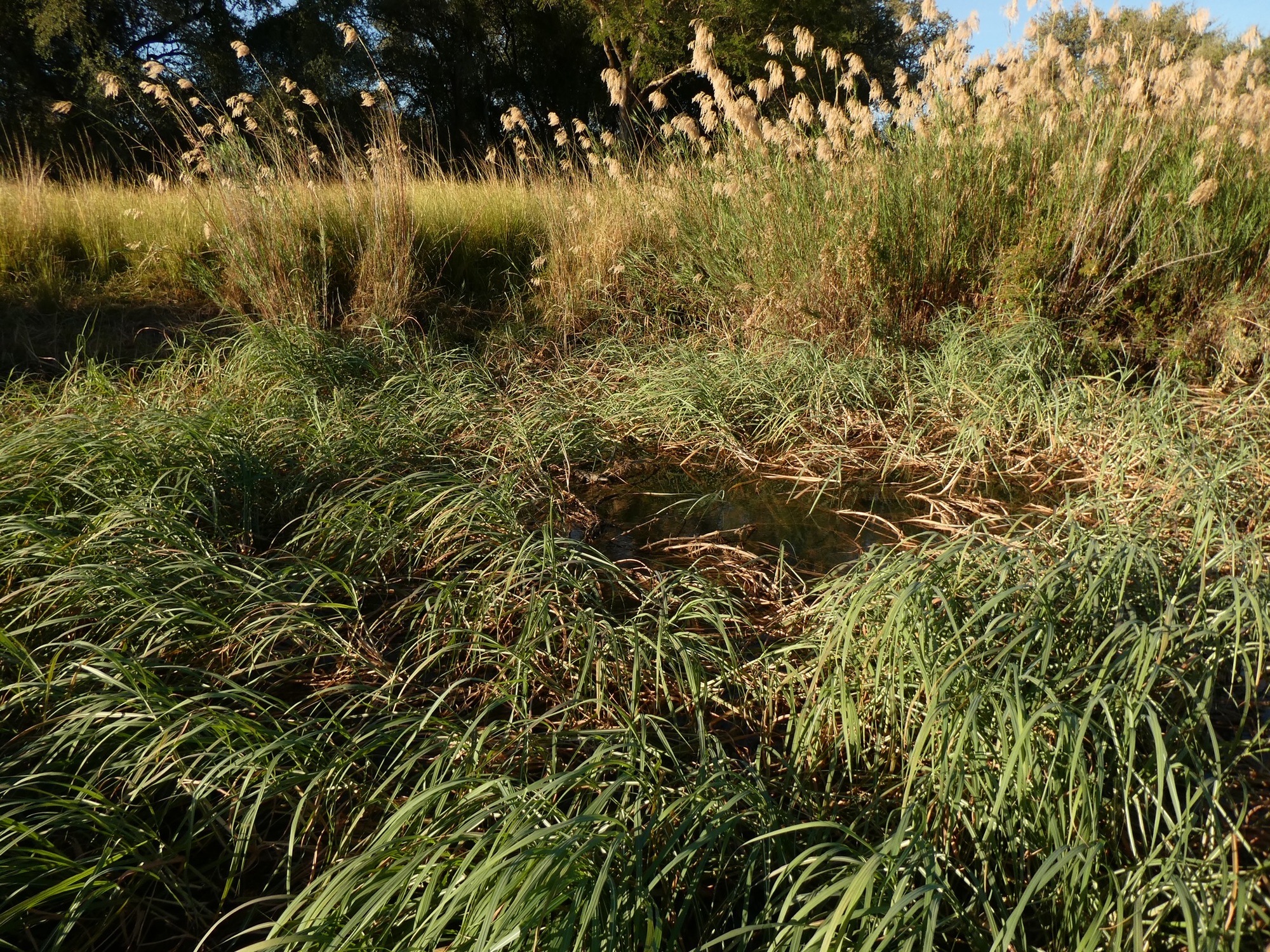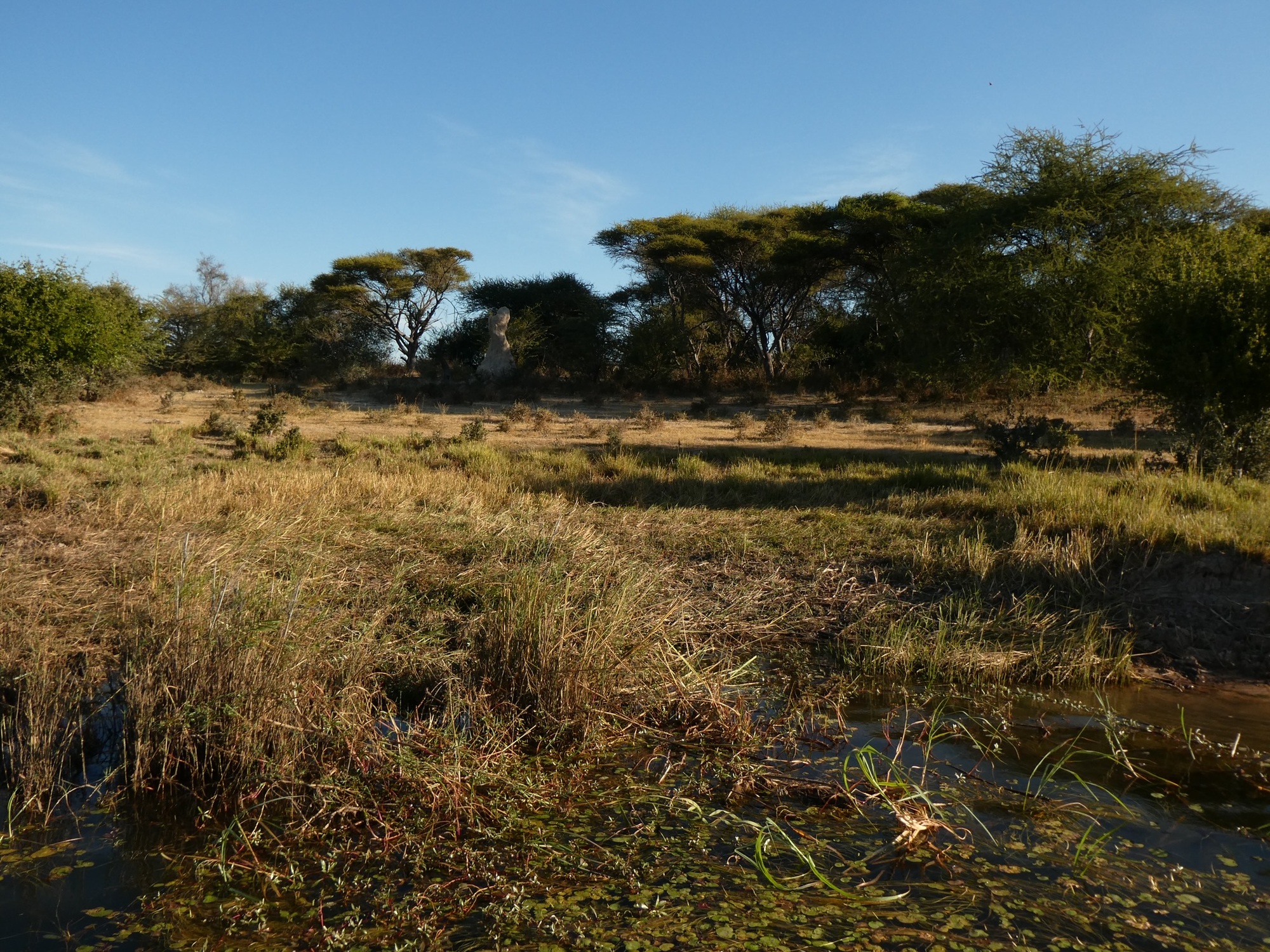 Although this looks like a nice scenic picture, there is actually a little crocodile in it. (At the top left of the pond area.) My first wild crocodile sighting in Africa!