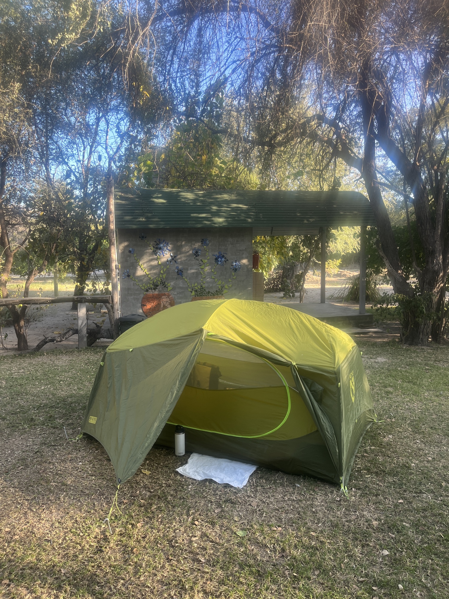 I headed down the gravel road and it didn't seem too bad. I had a couple of turn by turn instructions to follow and had made my last turn and not too long after, I see a truck pull over and out jumps Hannes, the husband part of the owner of the lodge. Apparently, I have some more turns and he wanted to make sure I didn't get lost. I took the opportunity to unload my bike and throw all my gear in his truck. Good thing! He said he'd drive ahead and wait for me to catch up. Talk about pressure to pedal fast! Ha ha! I got a solid cardio workout the last couple of miles! I was so thankful he took my bags as I was able to go much faster. There were still some sandy sections I had to walk through and had I had all my gear, it would have been much harder. i thought about taking a room, but the campsite was so nice, I opted for that. I arranged to have dinner later.