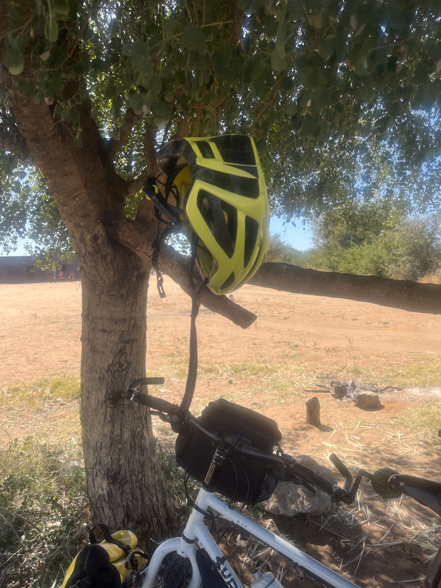Not all rest breaks go quite as planned! All the trees and bushes around here have thorns. I got attacked when pulling over so just unbuckled my helmet and ducked out of it. To my amusement the branch/thorns suspended my helmet in mid air. Although it looks like it's resting on a branch, it's just dangling.