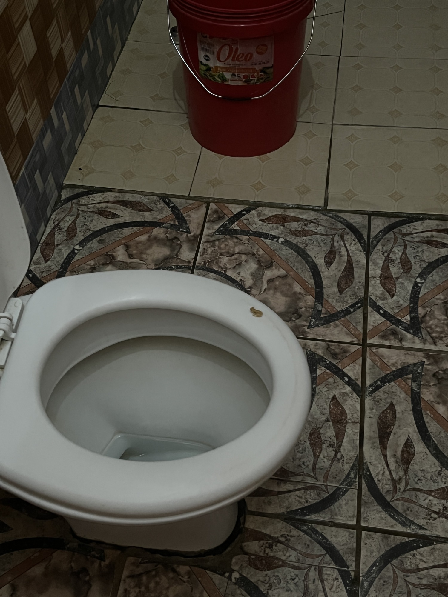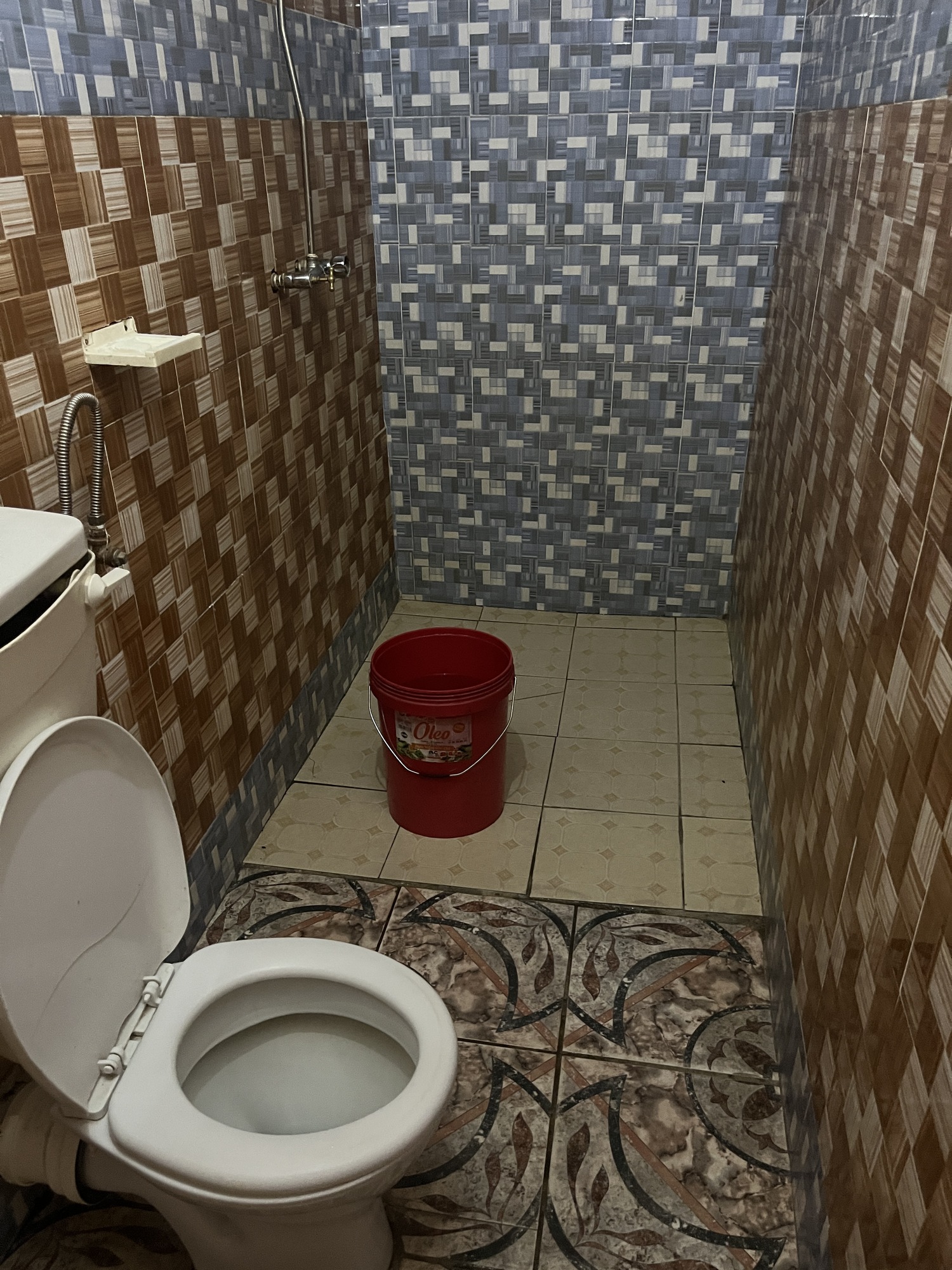 My bucket of warm water arrived and I'm all cleaned up. I had to switch rooms as the water was leaking in the other from the sink. An added bonus is that this one has a toilet seat. It's the little things....