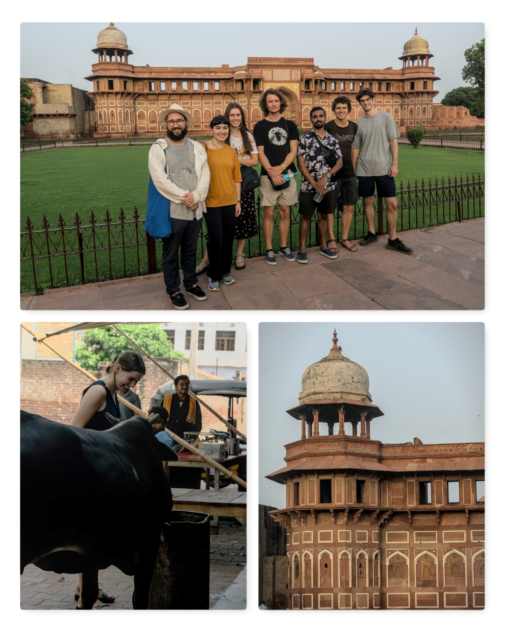 Whilst we were in Delhi we felt obliged to see the Taj Mahal so we were easily convinced to join a group from the hostel on the next train to Agra. I'll leave the scene in the Delhi train station to your imagination, but once on the train it was relatively comfortable and we could enjoy watching out the window to a totally new landscape, one that was exactly how I imagined India to be. The Taj Mahal was stunning in the early morning with the grand white marble mausoleum reflecting the golden sun.