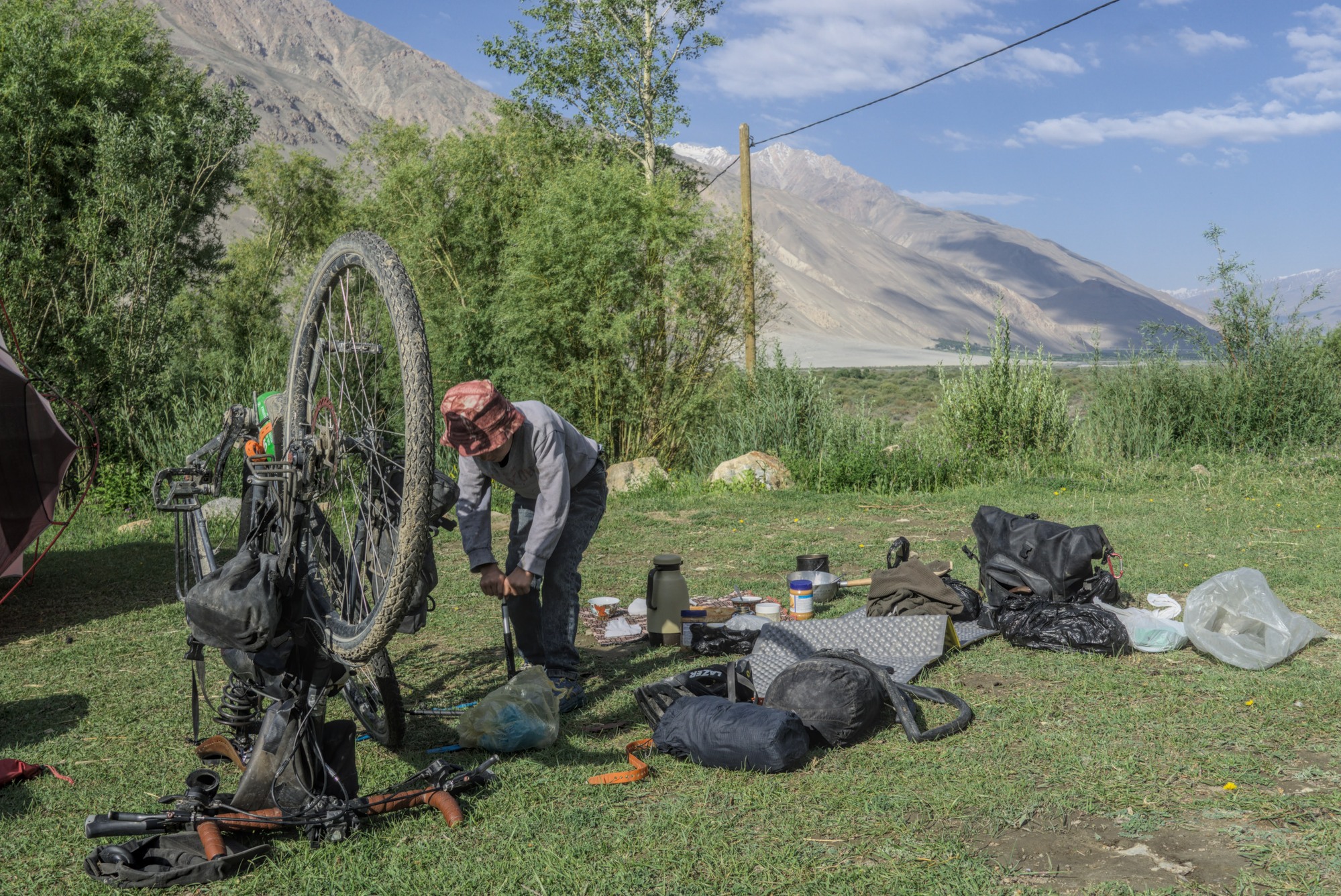 Another night we struggled hard to find anywhere to sleep as it was getting dark. Resorted to asking a local to camp in their garden, they were of course very accommodating allowing us to cook and sleep there. The next morning they brought us bread and milk tea and I employed some child labour to repair yet another puncture.