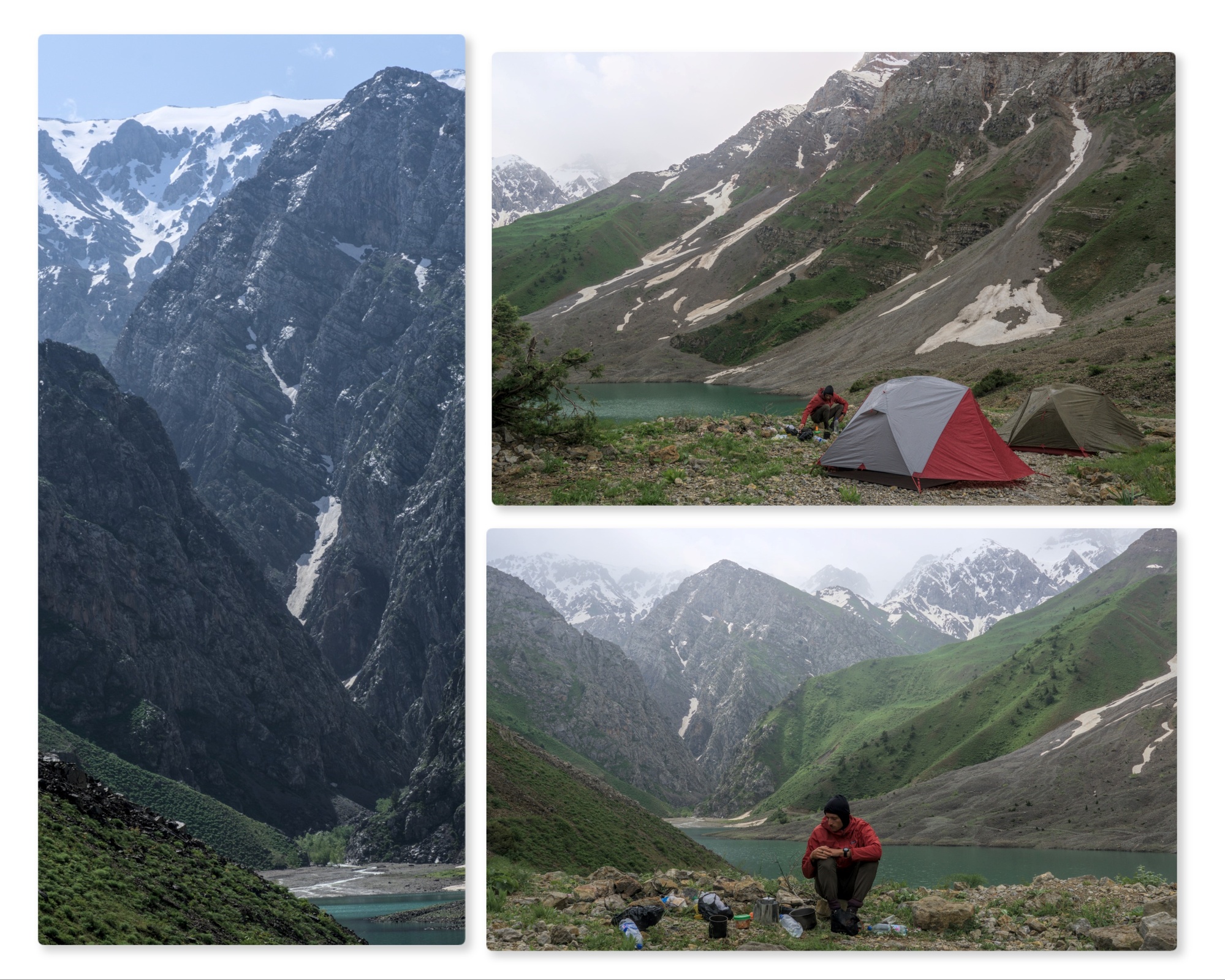 After a lot of samsas each and back on the previously empty road, we were picked up immediately by a man and his family in a luxurious Toyota Landcruiser, taking us to the base of our next adventure. We walked through lush green pastures, thick with wild vegetation and picked fresh herbs for dinner along the way. It was just 8km to the intermediate late but a very steep climb with a few freezing river crossings. The lake was very impressive, surrounded by the mountains all around with a patch of relatively flat ground just large enough to pitch our tents. We polished off a huge bowl of pasta after dark, complete with the herbs collected but lacking the tin of peas that Seb obliterated with a rock after realising we dont have a tin opener.