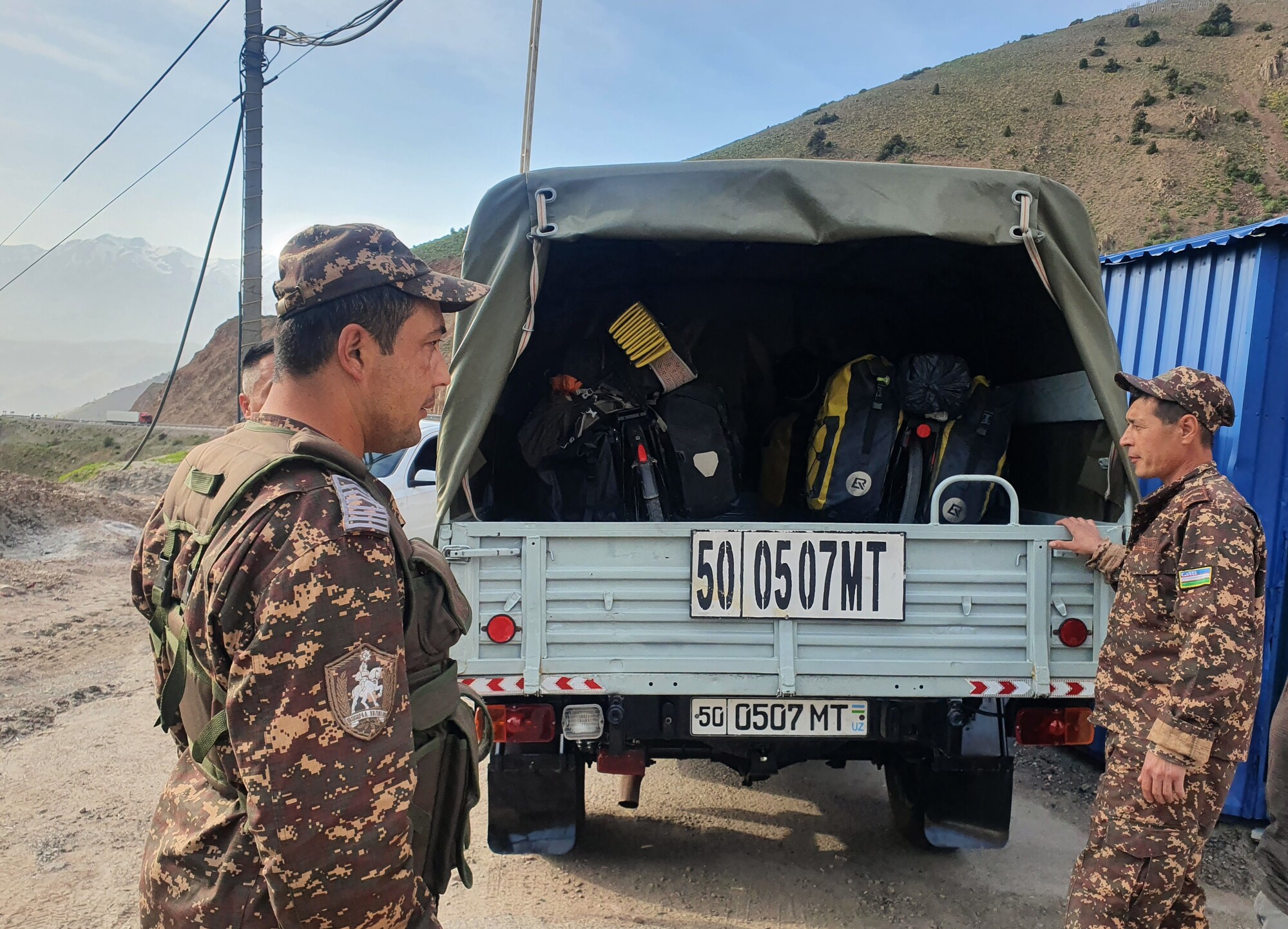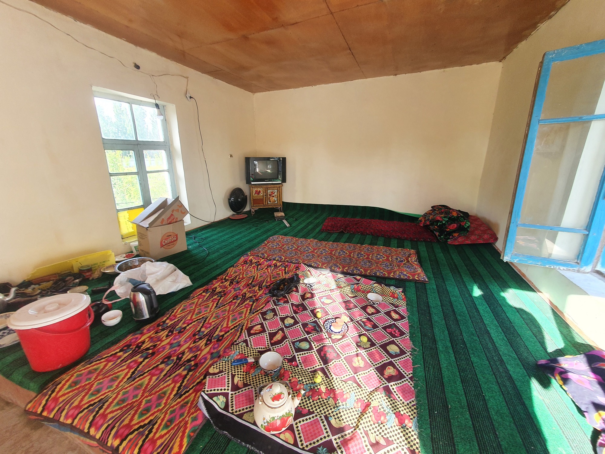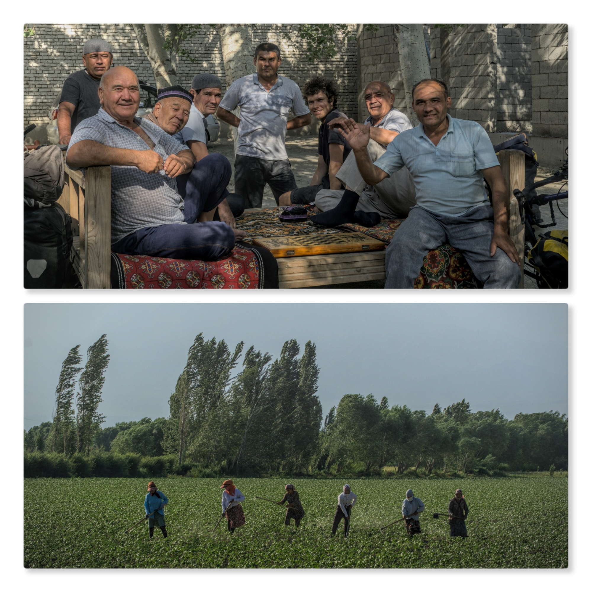 Our time in Uzbekistan was topped off by a slightly strange experience. Cycling after dark we were searching for a place to camp and came across a farm down a track, we asked the large group of men if it was possible to camp and were invited instead to stay in a room with one of the workers. We accepted the invitation, a little wary that we might have to stay up late with the group as we were both suffering some minor food poisoning, but thankfully they soon left. We were subsequently force-fed a particularly oily plov whilst watching an old Uzbek drama on an ancient TV, then tried to get some sleep in the mosquito-laden room. I struggled to sleep with my stomach and the mosquitos until in the middle of the night when the rest of the men appeared on bicycles, totally drunk out of their minds and apologetic that they have been such terrible hosts by leaving straight away and not offering us any food. They tried to redeem themselves by offering to cook shashlik (barbequed meat) for us there and then, in the middle of the night whilst we were half asleep. I could not believe what was going on and remained confused during the subsequent arguments, trying to convince them that we did not want to start preparing coals to make a barbeque and did in fact, just want to sleep. After 30 minutes of arguing, we eventually reached an agreement that we would make shashlik the next morning before they start work at 8am. The next day we woke up 6 and left straight away to the border, still trying to comprehend last night's drama.