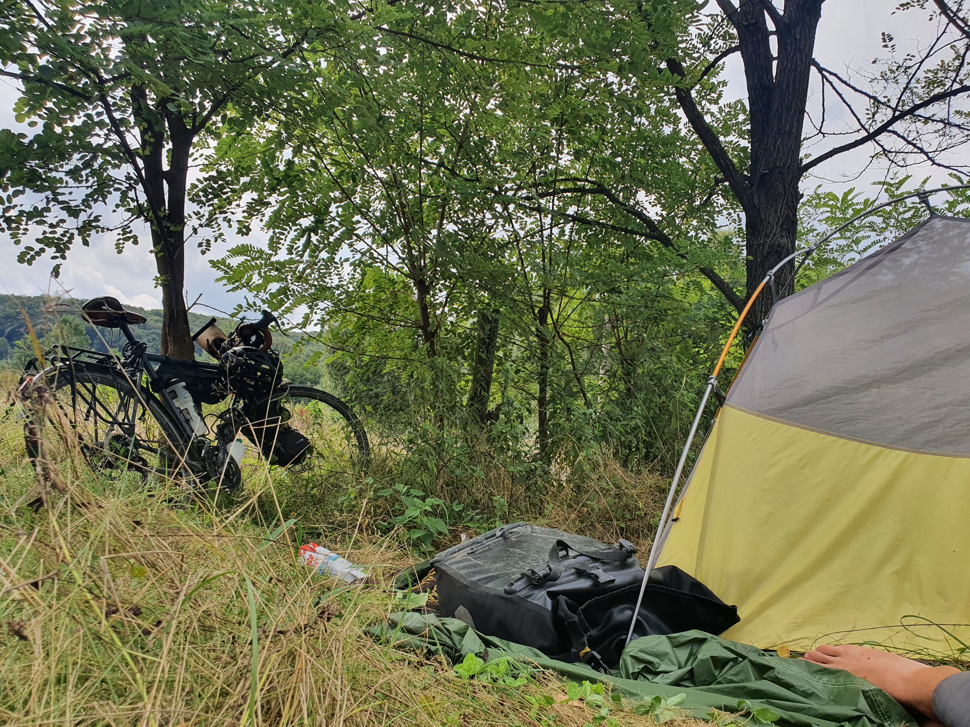 Felt so stuffed after cooking dinner and still had to cycle out of the town i chased by dogs in the dark to find a fairly hidden spot to sleep by the road.