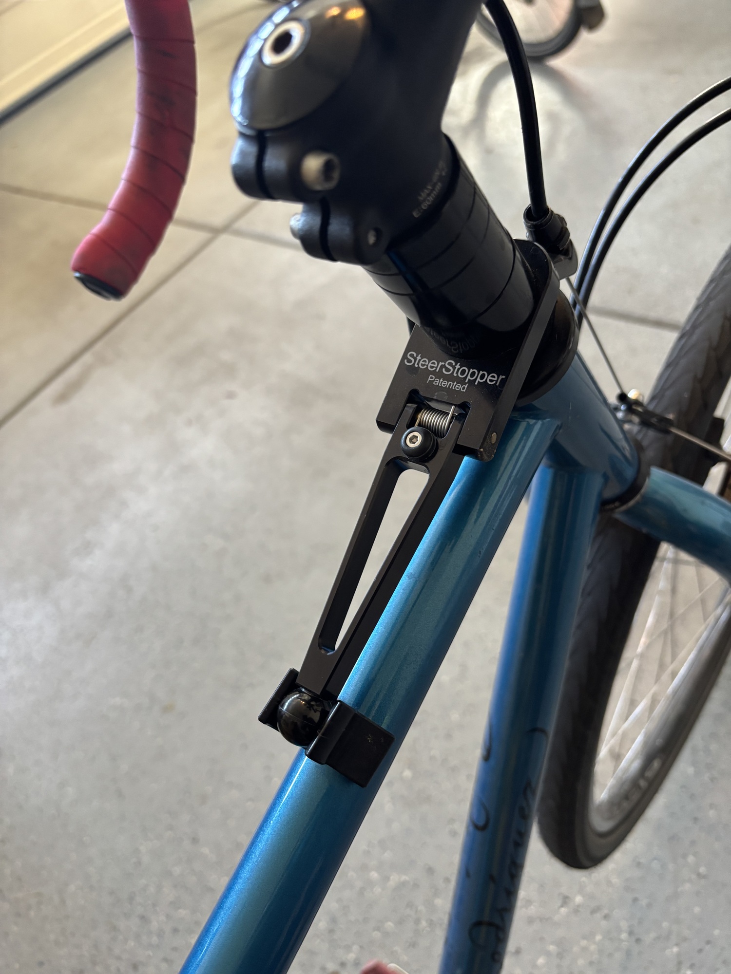 I bought a new to me touring bike a couple of years ago that had every goodie possible. A Steer Stopper was included. I was initially unimpressed. Using it did impress me, and Jacinto as well. When he sent his bike back to Rodriguez for frame repair (rack braze on cracked), he had them add a steer stopper. This helps stabilize a parked bike, especially so when combined with a two legged kickstand. I think it’s also a potential theft deterrent, as the stopper has to be released to steer the bike.