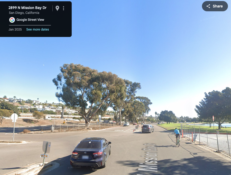 It must be going around! I got caught by the Street View car in January when I was out on a training ride during our vacation in San Diego. Not my most flattering angle, but there I am on my trusty Bike Friday. On my way out to do laps of Fiesta Island.
