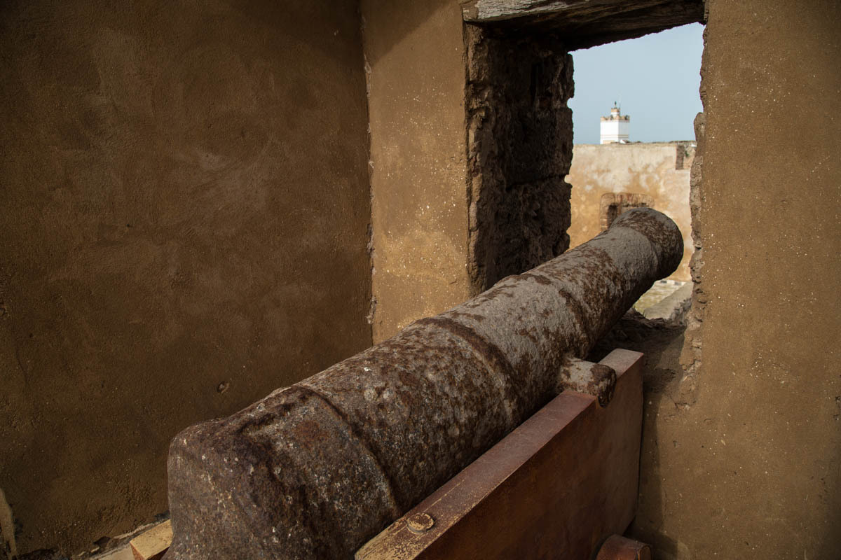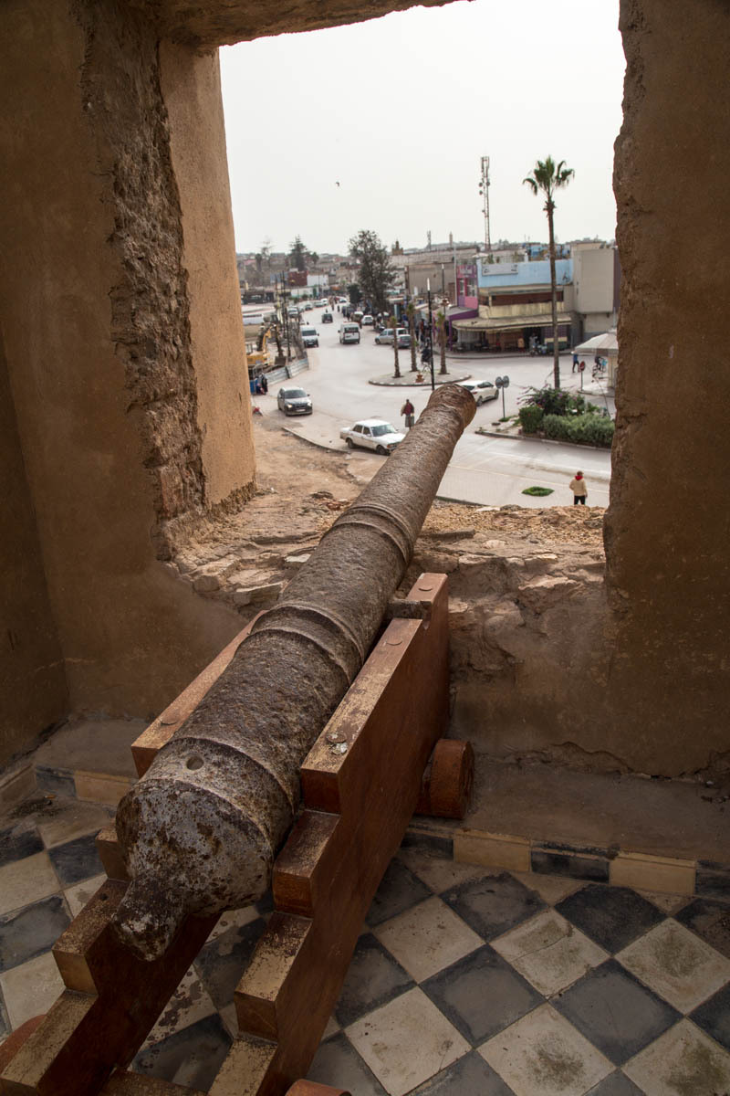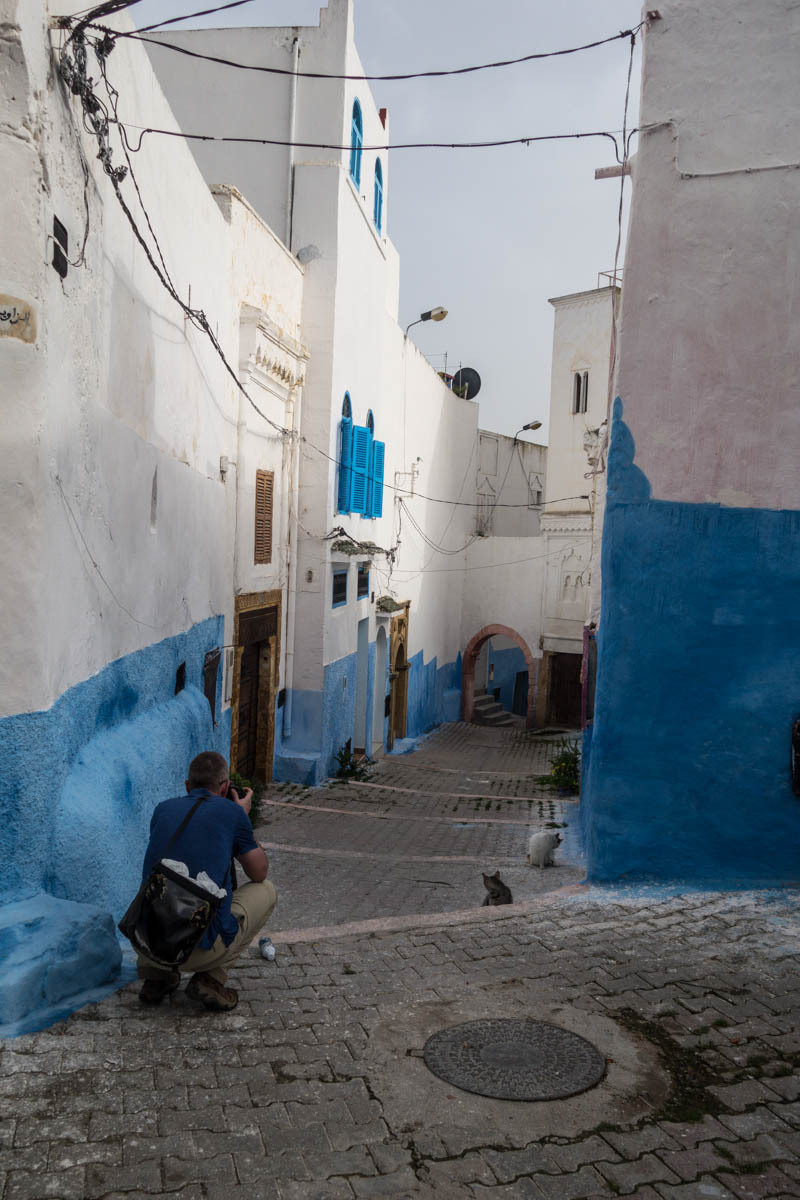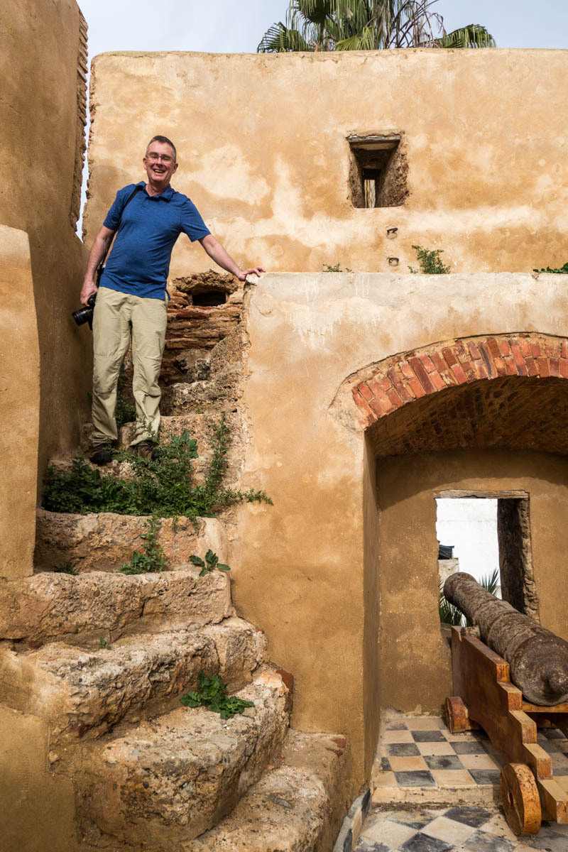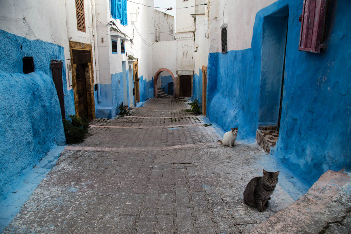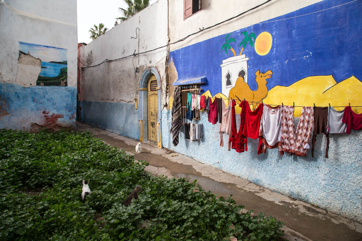 We rest a bit then head out to explore the Medina. The Medina is the old part of town surrounded by a wall with canons on the ramparts. There are several gates leading into narrow alleys. No cars make it inside here. You can forget about finding your way, all you can do is just head in and wander until you come out on the other end. A guy comes up to us and says we need to see the Portuguese fort. He knocks on a door until someone opens. Merci! We wander around the fort and climb several stone stairs to get a nice view over the city and river. The narrow alleys of the Medina are very picturesque. Colorful, lots of nice gates and see-through. Cats are everywhere. They don’t seem to be anyone’s pet, but are being taken care of by the community. In return they probably keep the rodent population under control. There are no other tourists. More women are wearing traditional Muslim dress, we hear the Call to Prayer.