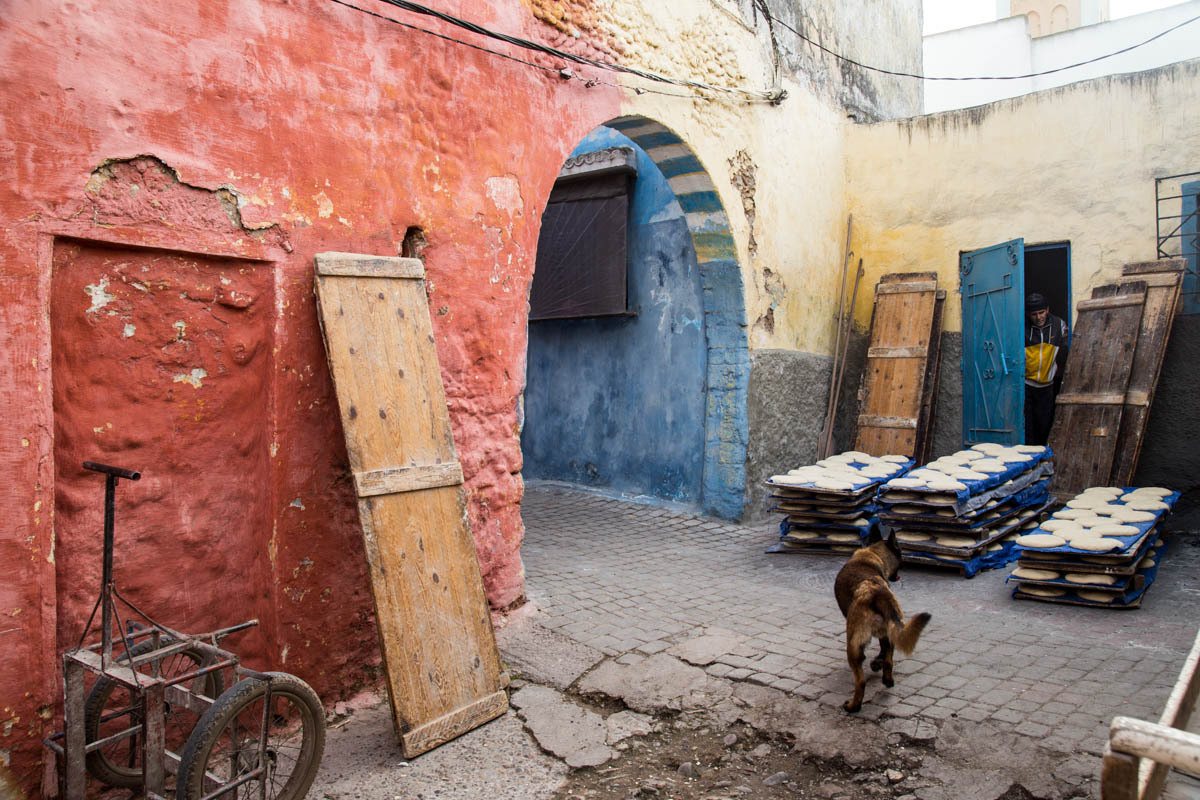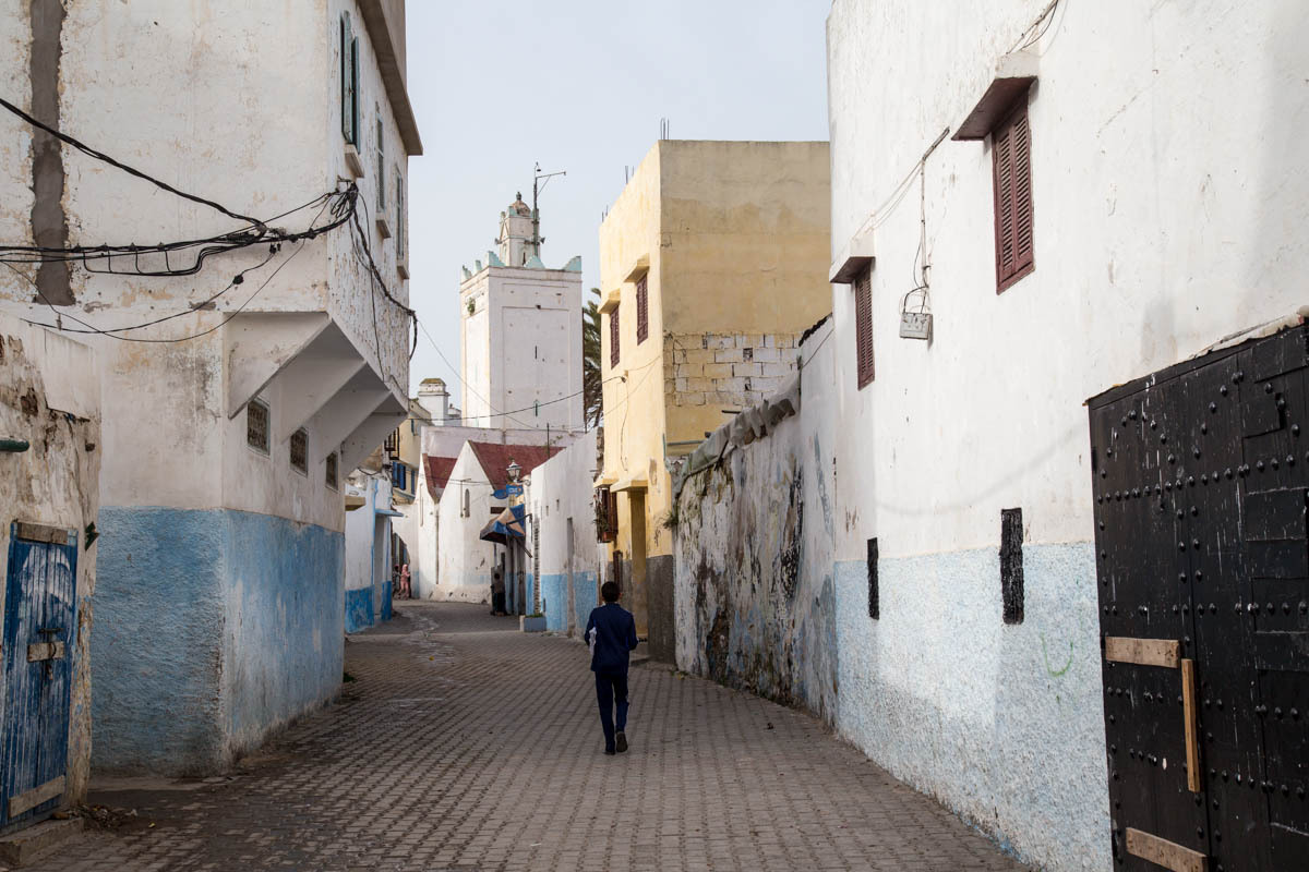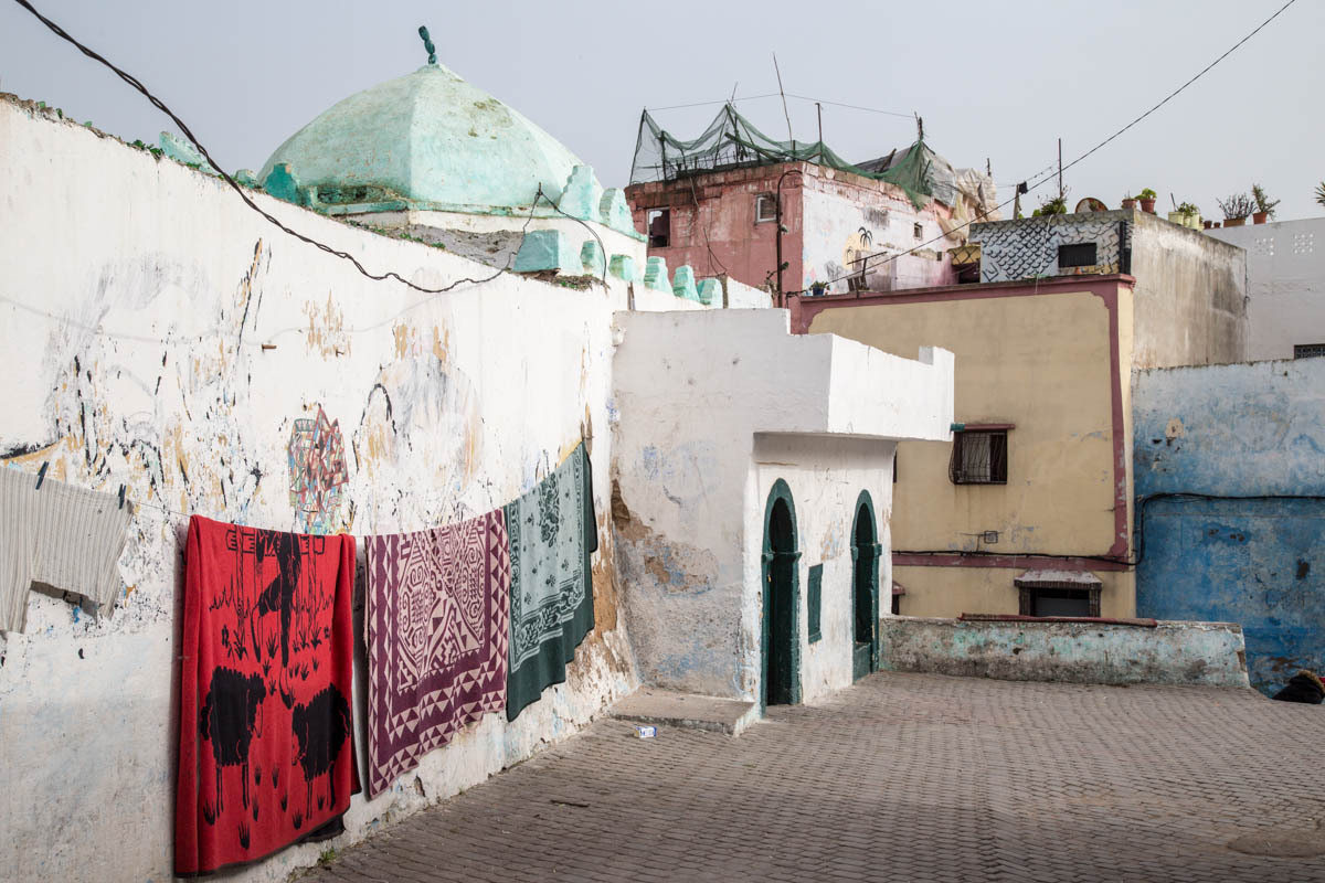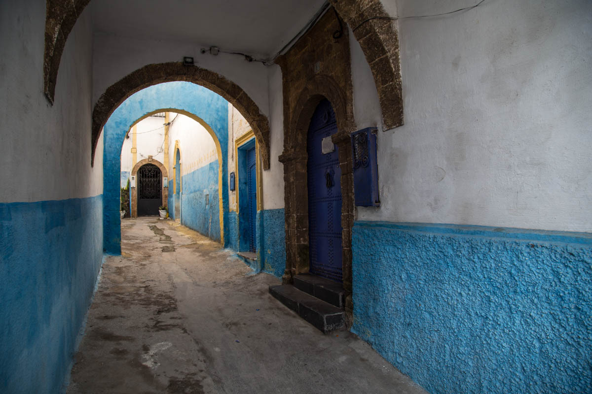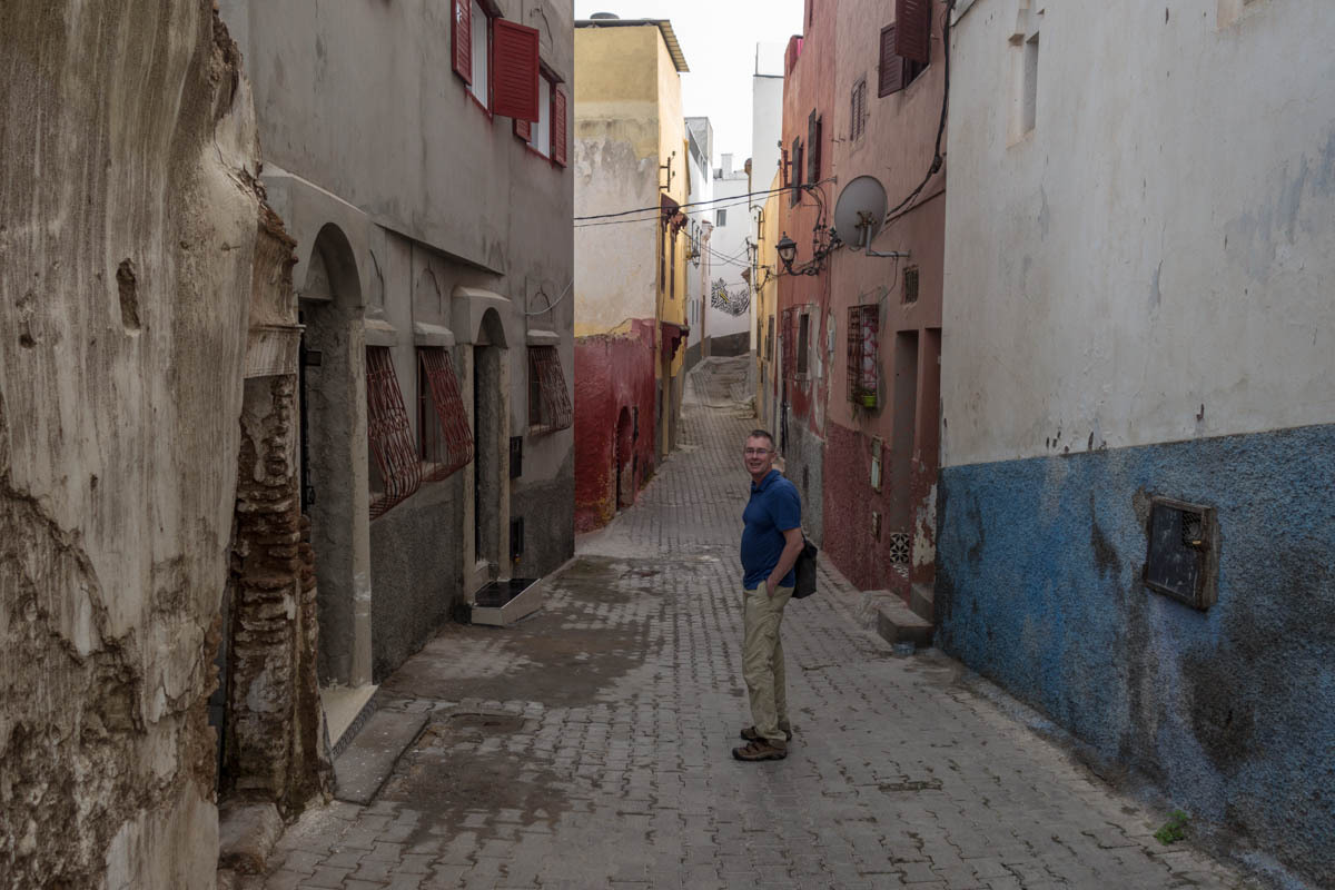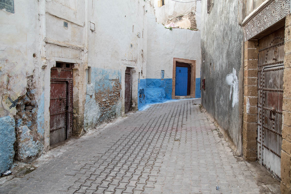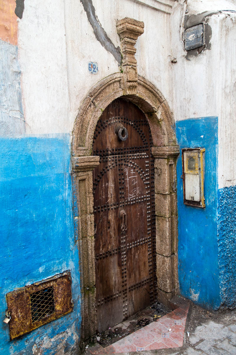 We rest a bit then head out to explore the Medina. The Medina is the old part of town surrounded by a wall with canons on the ramparts. There are several gates leading into narrow alleys. No cars make it inside here. You can forget about finding your way, all you can do is just head in and wander until you come out on the other end. A guy comes up to us and says we need to see the Portuguese fort. He knocks on a door until someone opens. Merci! We wander around the fort and climb several stone stairs to get a nice view over the city and river. The narrow alleys of the Medina are very picturesque. Colorful, lots of nice gates and see-through. Cats are everywhere. They don’t seem to be anyone’s pet, but are being taken care of by the community. In return they probably keep the rodent population under control. There are no other tourists. More women are wearing traditional Muslim dress, we hear the Call to Prayer.