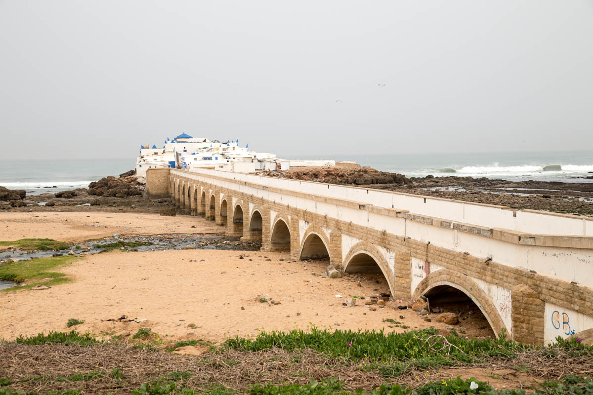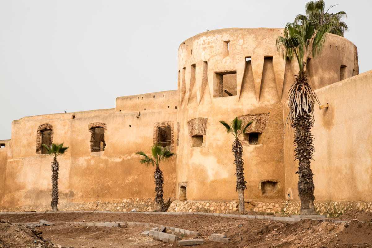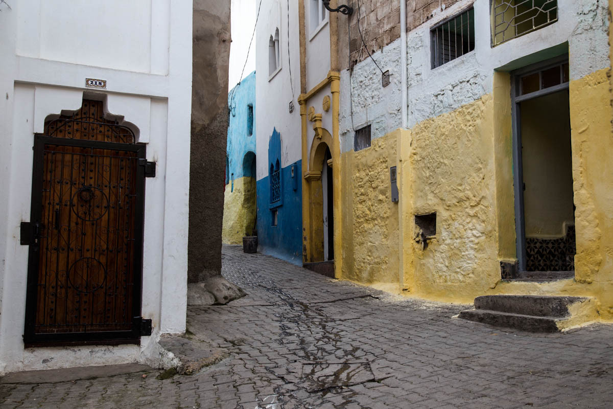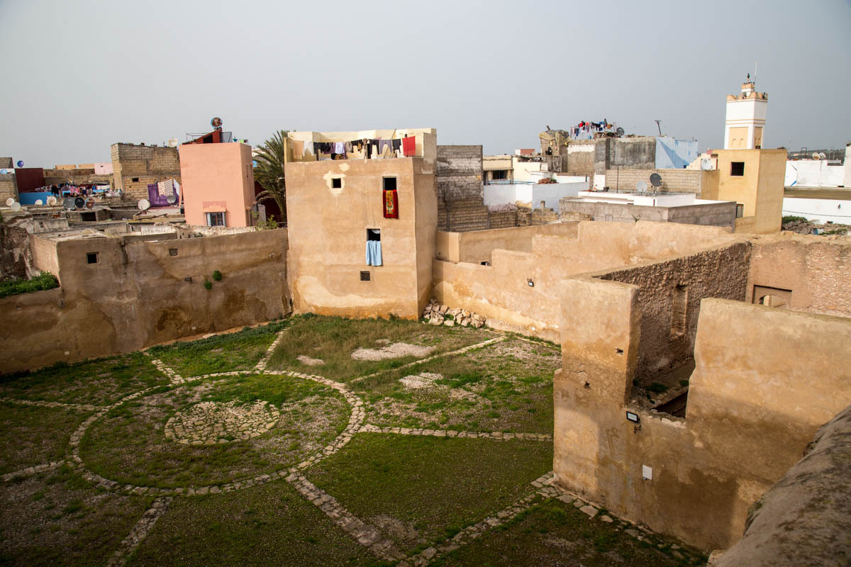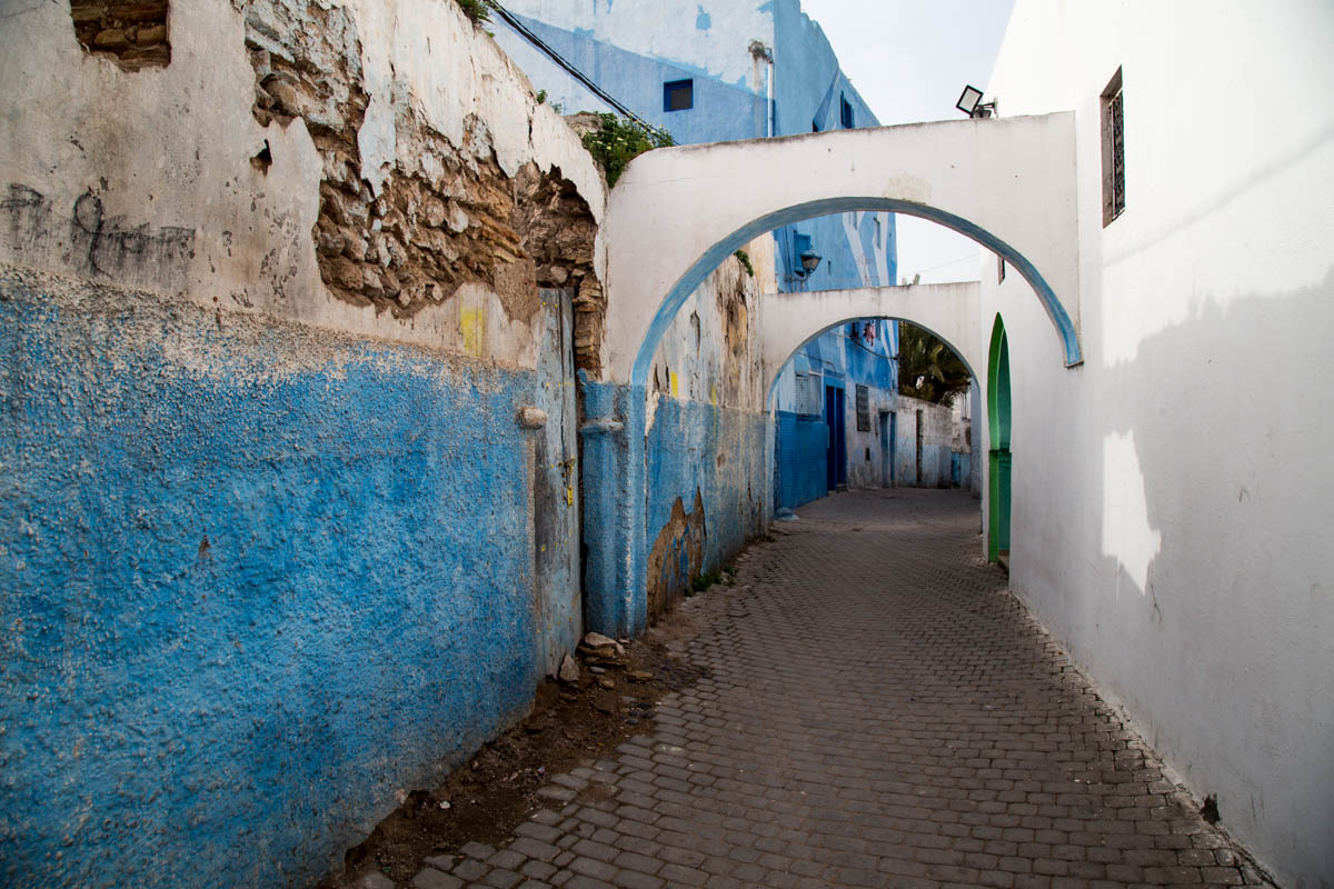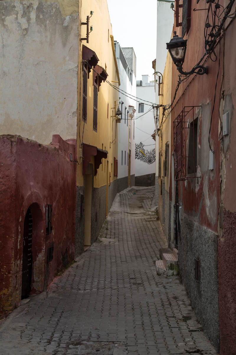 We rest a bit then head out to explore the Medina. The Medina is the old part of town surrounded by a wall with canons on the ramparts. There are several gates leading into narrow alleys. No cars make it inside here. You can forget about finding your way, all you can do is just head in and wander until you come out on the other end. A guy comes up to us and says we need to see the Portuguese fort. He knocks on a door until someone opens. Merci! We wander around the fort and climb several stone stairs to get a nice view over the city and river. The narrow alleys of the Medina are very picturesque. Colorful, lots of nice gates and see-through. Cats are everywhere. They don’t seem to be anyone’s pet, but are being taken care of by the community. In return they probably keep the rodent population under control. There are no other tourists. More women are wearing traditional Muslim dress, we hear the Call to Prayer.