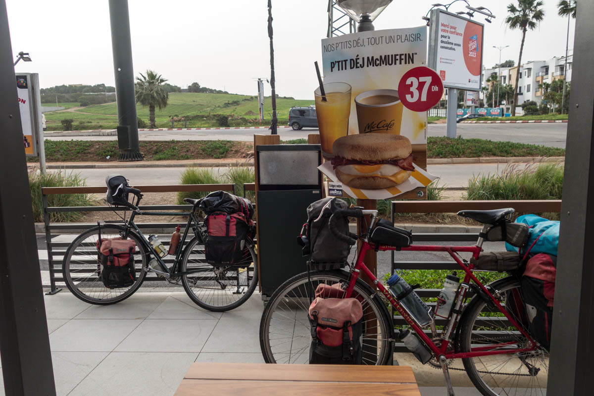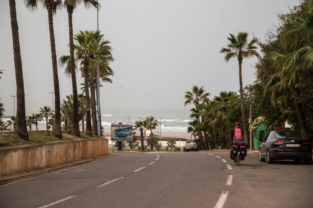 About halfway today we see a bikepacker coming toward us headed north. We stop and he turns around to chat. Chris is from the Czech Republic. He tells us of where he had stayed in Azemmour, a hotel for 120 dirham ($12US) “near the Poste and a Hotel sign).