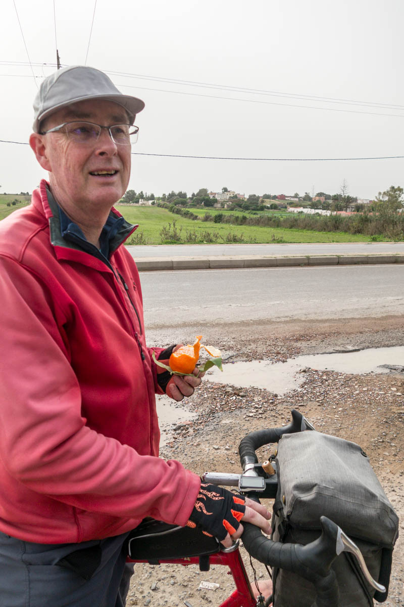 Another time a cyclist rides along with Patrick and talks. “Take, take,” he says to Rachel as he passes and then sets off faster than us. He gives each of us a tangerine.