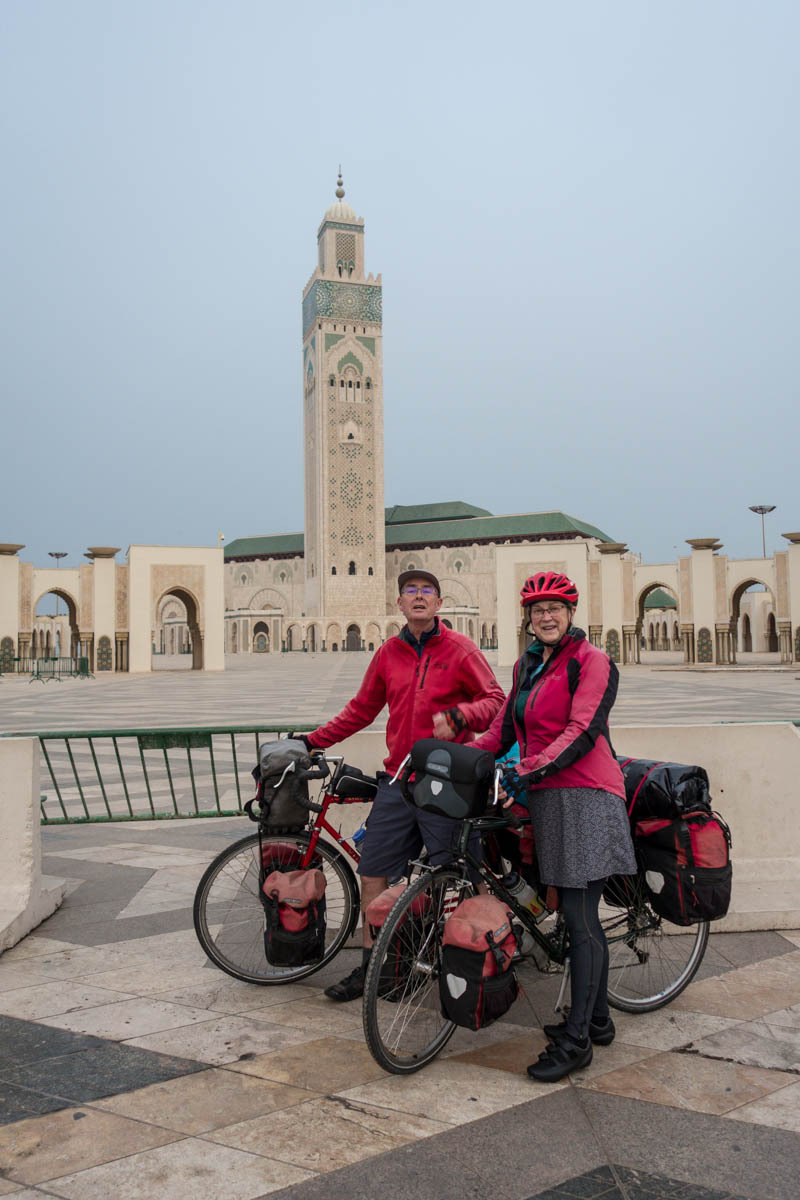 As we expected traffic is light on a Sunday morning. We follow the main road along the coast, pass by the big mosque again and stop for some photos. An Italian tourist takes a picture with our camera. There are lots of joggers and bicyclists out this morning, riding along the boulevard.