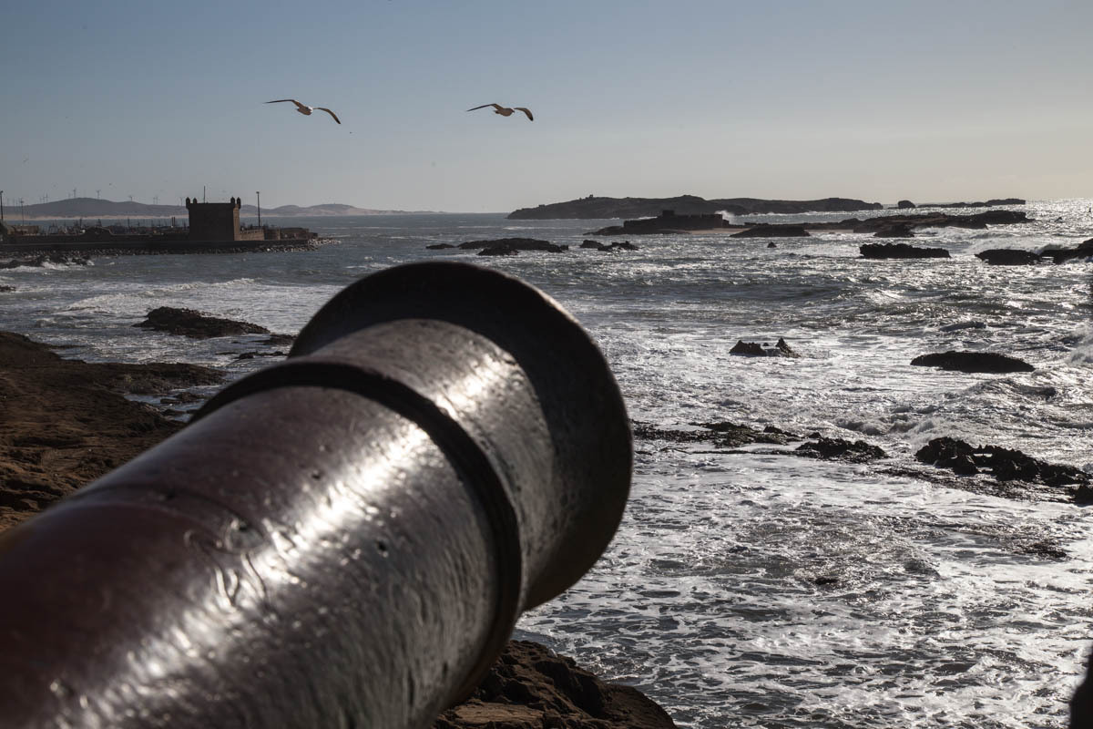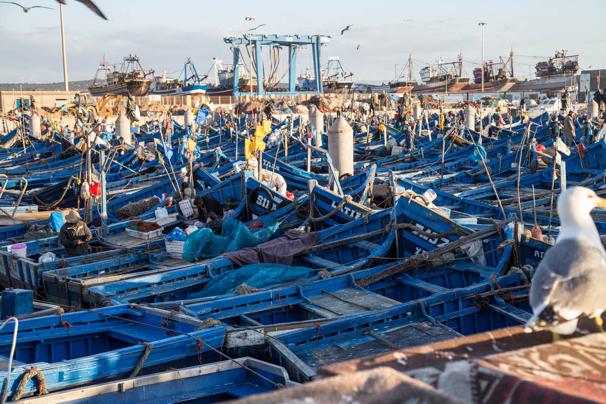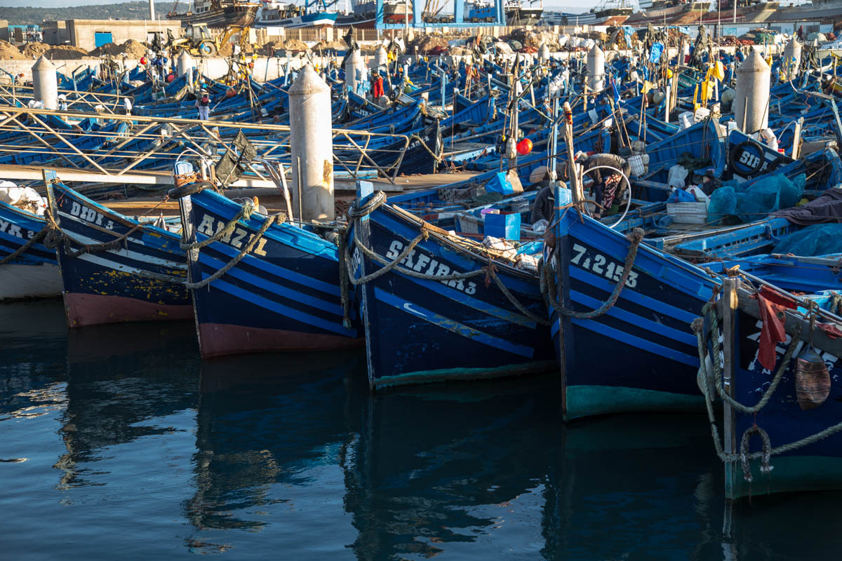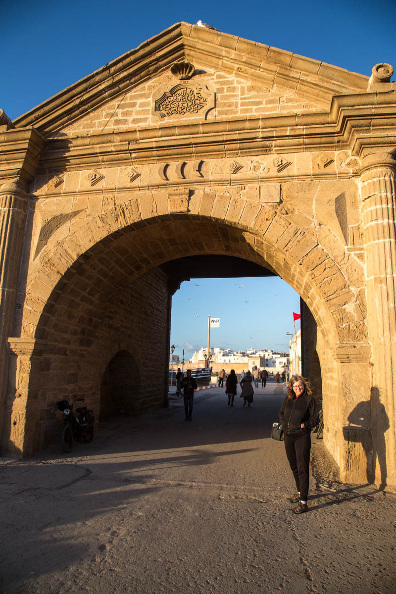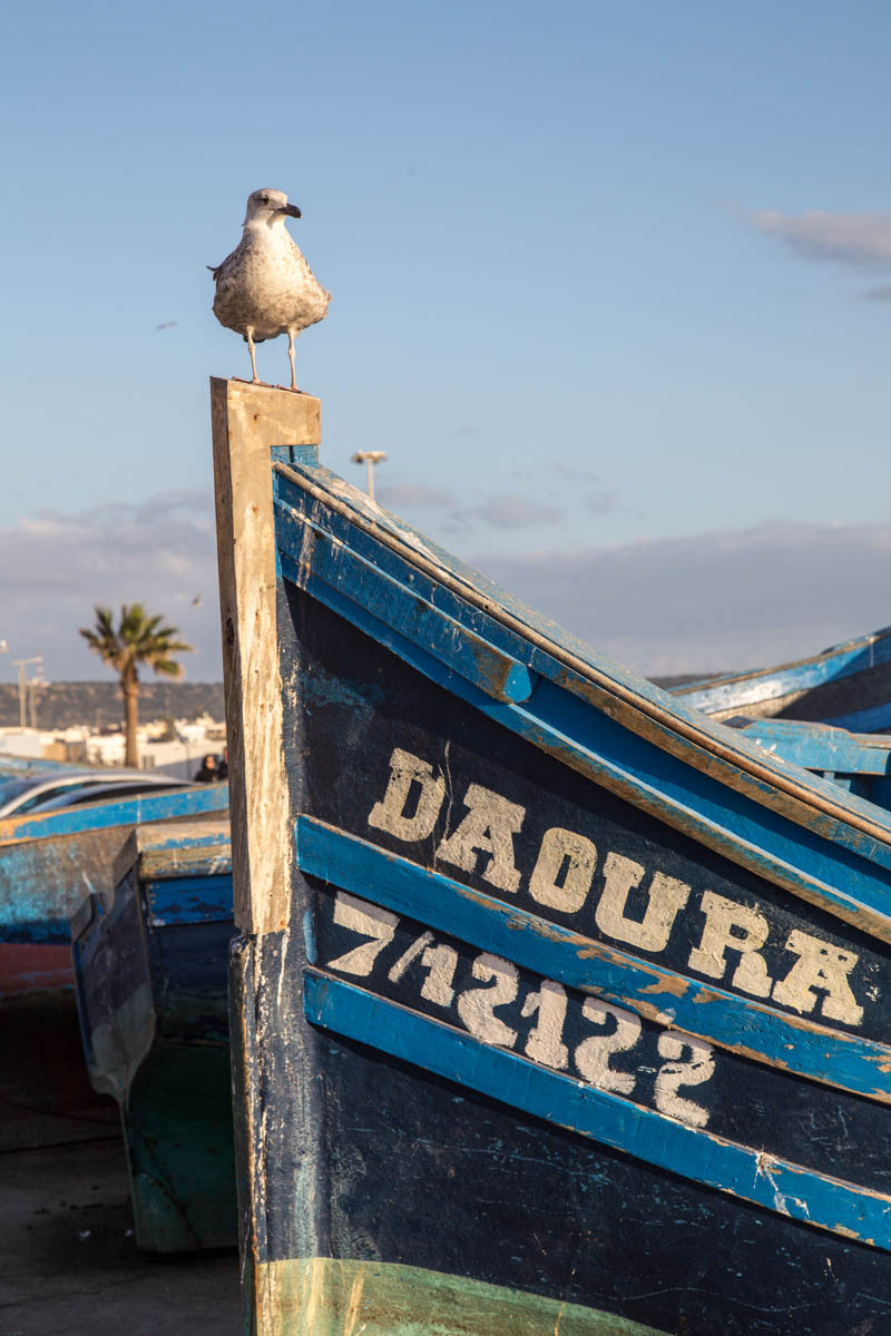 Essaouira was renamed from the original name of Mogador, it means “well designed”. It is also known as the “Windy City of Africa”. After a shower and a rest, we venture out to explore more of the Medina and walk to the Harbor. Inside the Medina walls, all is calm the surf is crashing against the city fortification walls.
