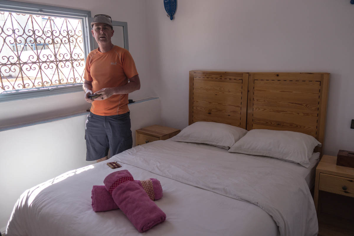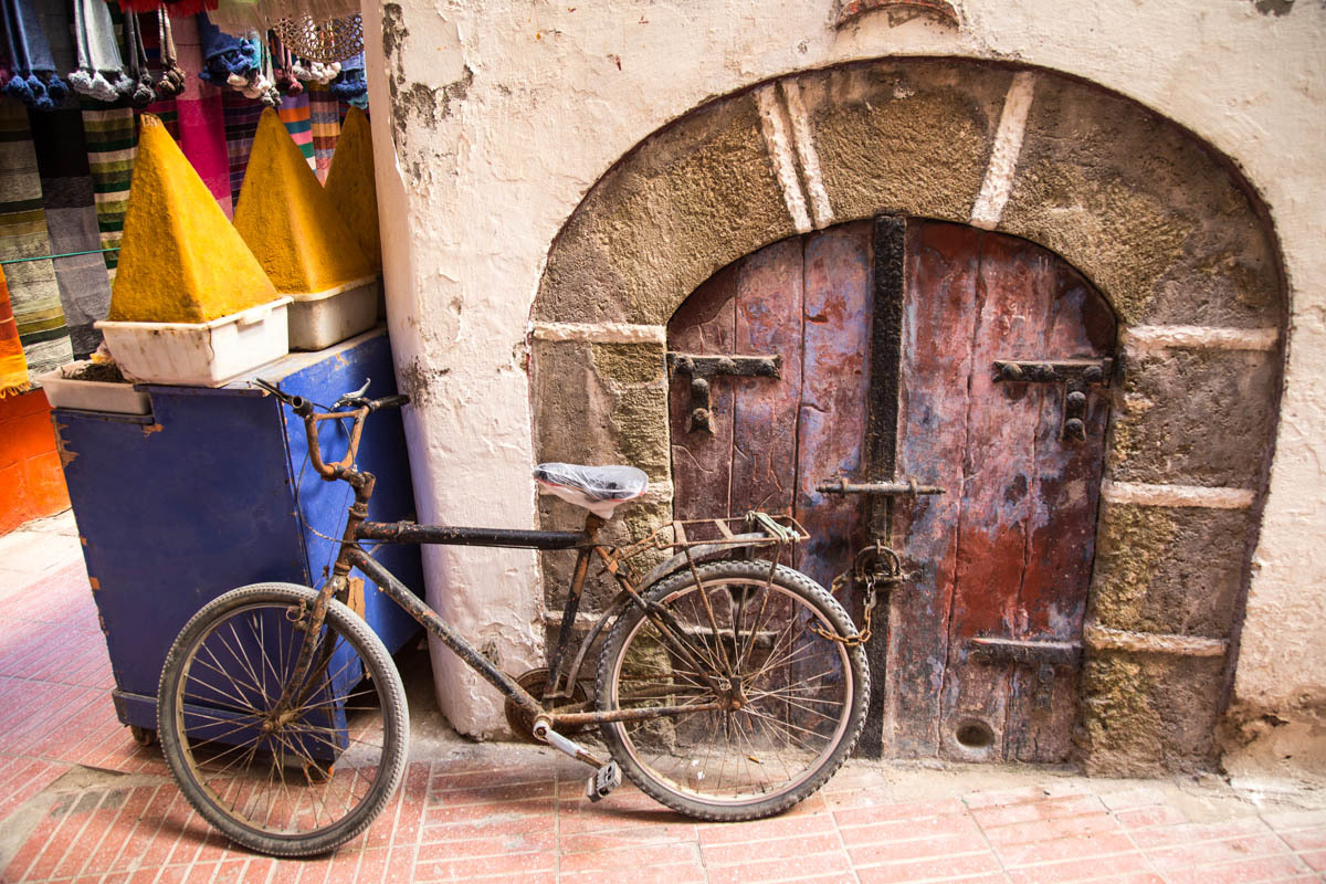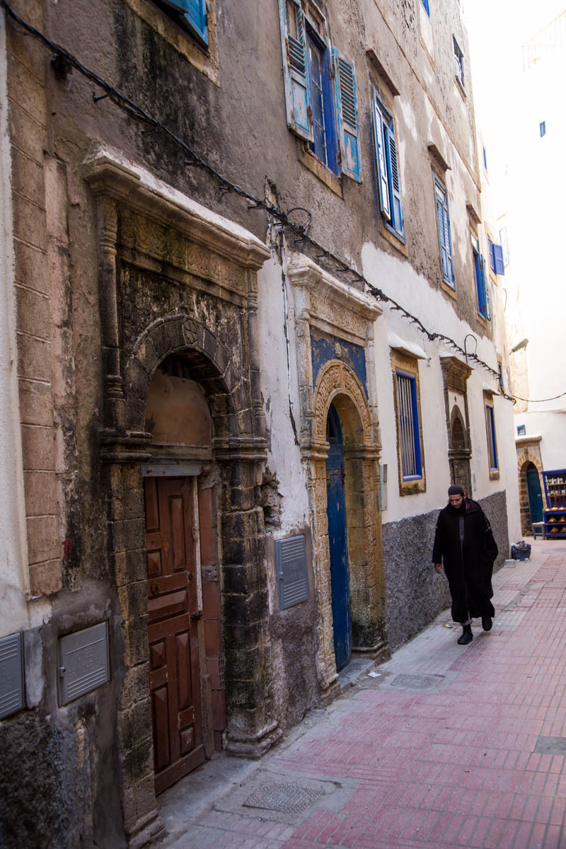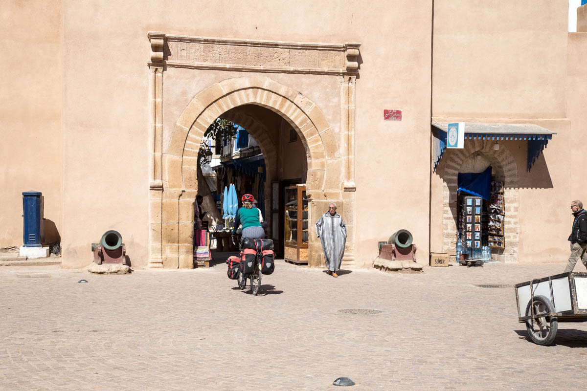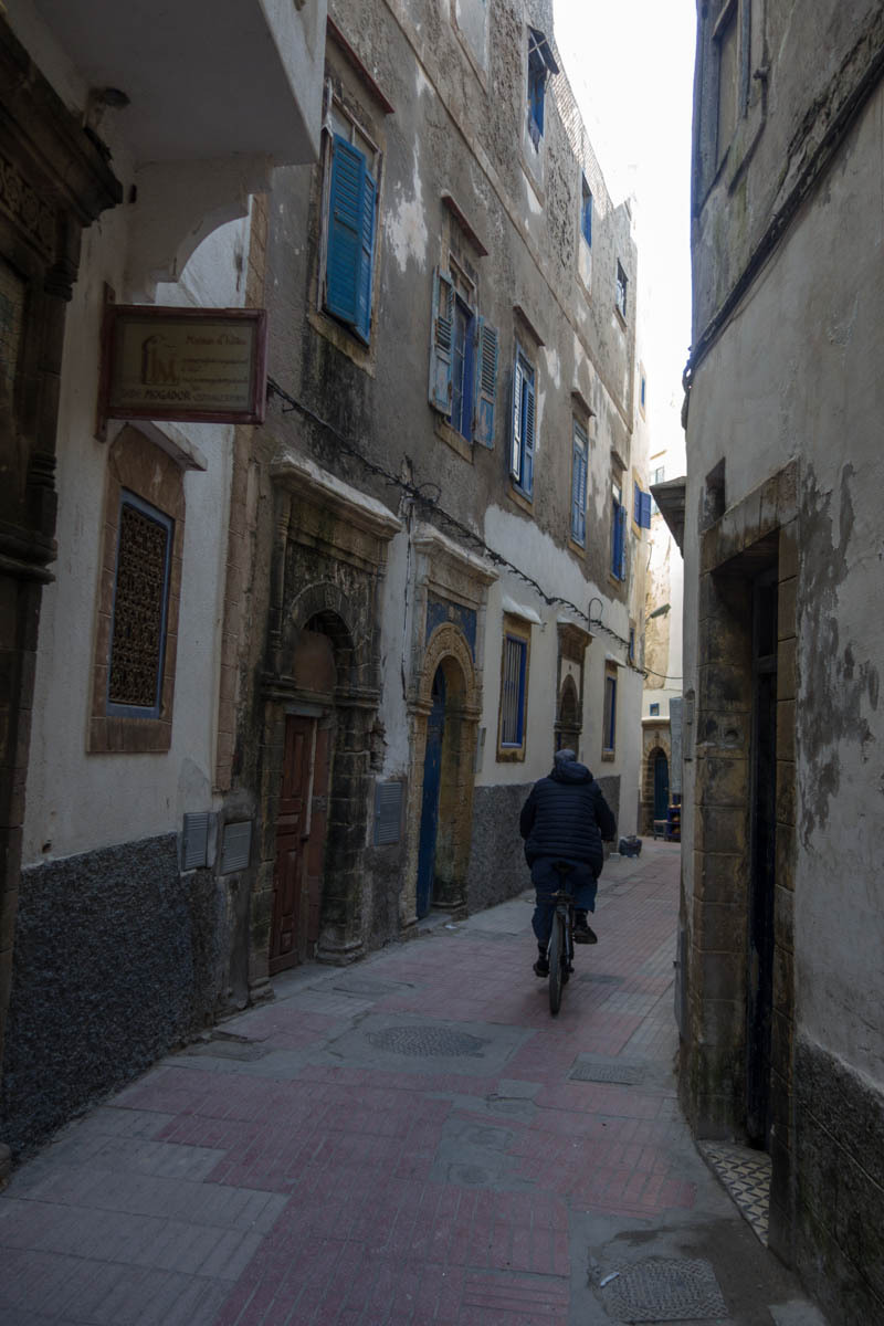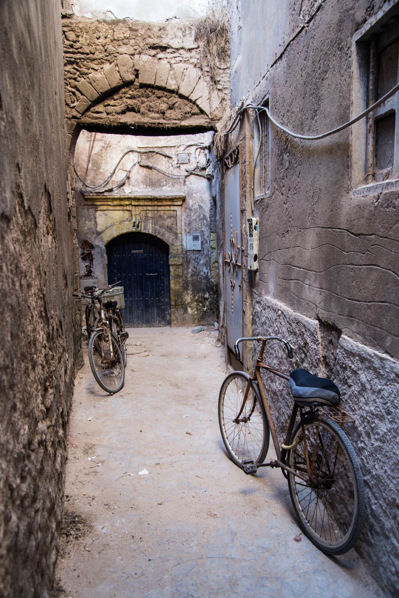 We can see Essaouira from a ways out, but the road circles to the east then drops down into the city. We ride through one of the gates into the Medina. The alleyways are bustling with tourists and locals. We end up pushing the bikes to find our Hotel Al Arboussas in a narrow passageway.