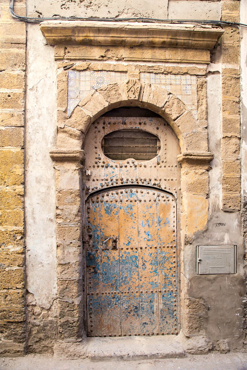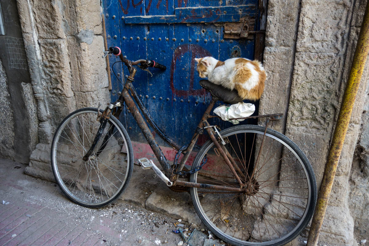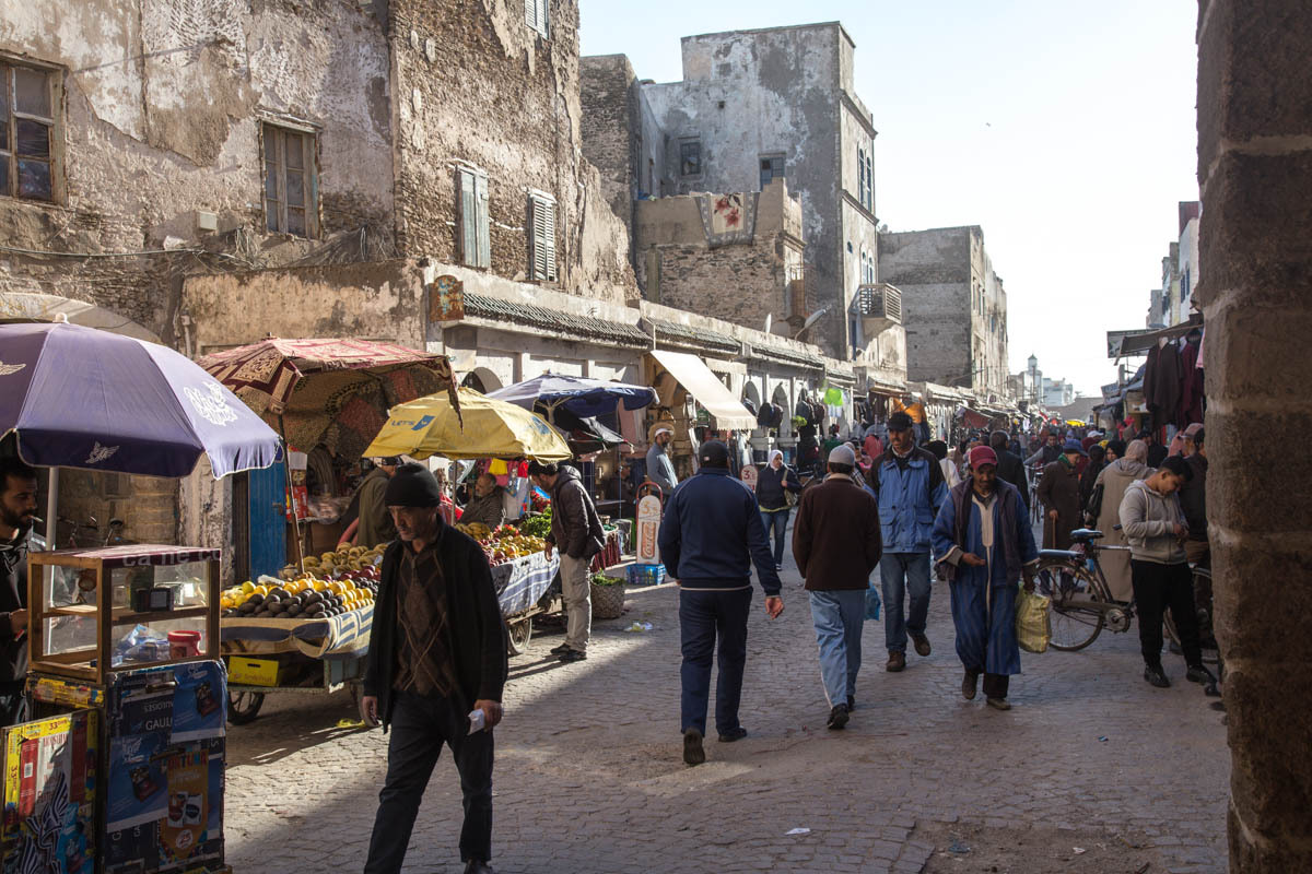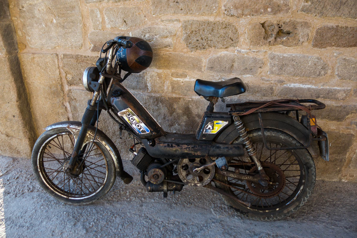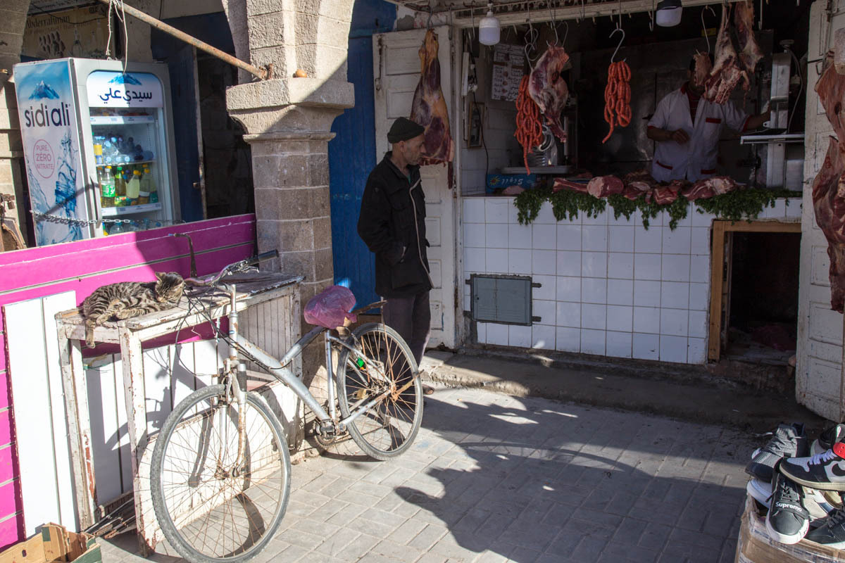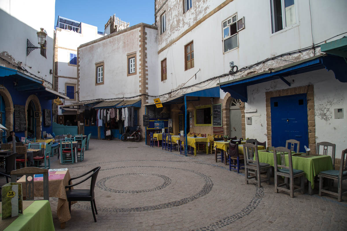 We can see Essaouira from a ways out, but the road circles to the east then drops down into the city. We ride through one of the gates into the Medina. The alleyways are bustling with tourists and locals. We end up pushing the bikes to find our Hotel Al Arboussas in a narrow passageway.