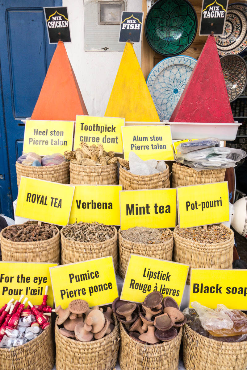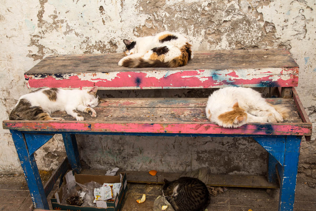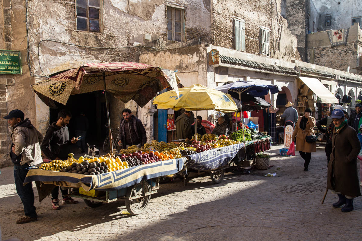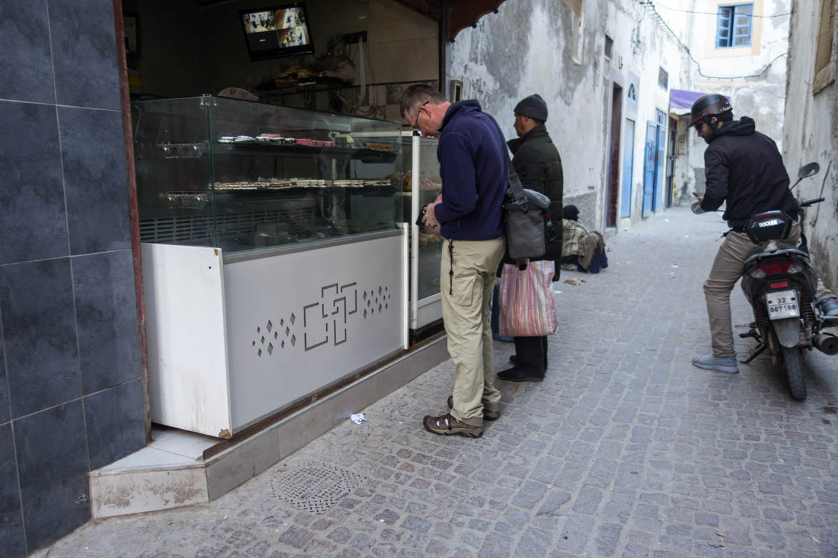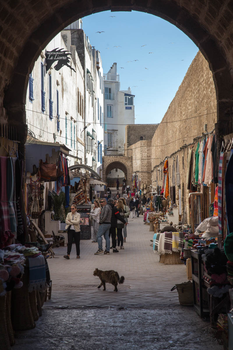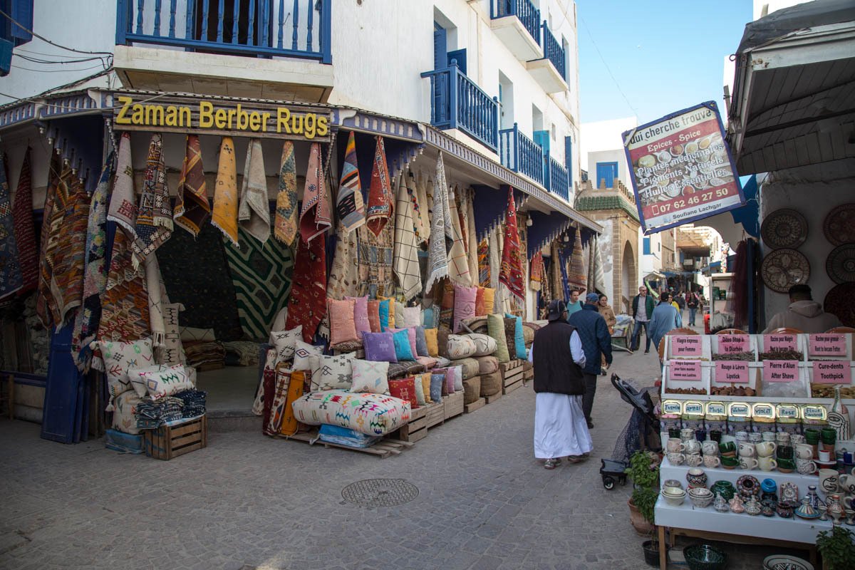 We can see Essaouira from a ways out, but the road circles to the east then drops down into the city. We ride through one of the gates into the Medina. The alleyways are bustling with tourists and locals. We end up pushing the bikes to find our Hotel Al Arboussas in a narrow passageway.